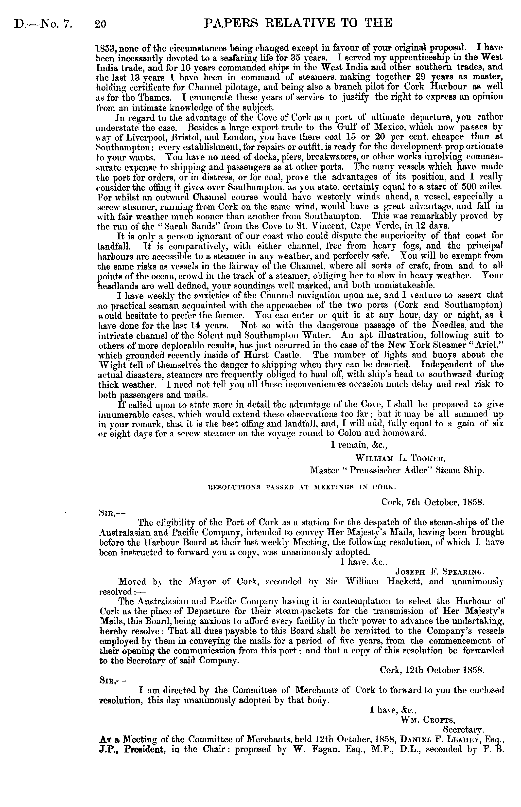 1853, none of the circumstances being changed except in favour of your original proposal. I have been incessantly devoted to a seafaring life for 35 years. I served my apprenticeship in the West India trade, and for 16 years commanded ships in the West India and other southern trades, and the last 13 years I have been in command of steamers, making together 20 years as master, holding certificate for Channel pilotage, and being also a branch pilot for Cork Harbour as well as for the Thames. I enumerate these years of service to justify the right to express an opinion from an intimate knowledge of the subject. In regard to the advantage of the Cove of Cork as a port of ultimate departure, you rather understate the case. Besides a large export trade to the Gulf of Mexico, which now passes by way of Liverpool, Bristol, and London, you have there coal 15 or 20 per cent, cheaper than at Southampton; every establishment, for repairs or outfit, is ready for the development prop ortionate to your wants. You have no need of docks, piers, breakwaters, or other works involving commensurate expense to shipping and passengers as at other ports. The many vessels which have made the port tor orders, or in distress, or for coal, prove the advantages of its position, and I really consider the offing it gives over Southampton, as you state, certainly equal to a start of 500 miles. For whilst an outward Channel course Avould have westerly winds ahead, a vessel, especially a screw steamer, running from Cork on the same wind, would have a great advantage, and fall in with fair weather much sooner than another from Southampton. This was remarkably proved by the run of the " Sarah Sands" from the Cove to St. Vincent, Cape Verde, in 12 days. It is only a person ignorant of our coast who could dispute the superiority of that coast for landfall. It is comparatively, with either channel, free from heavy fogs, and the principal harbours are accessible to a steamer in any weather, and perfectly safe. You will be exempt from the same risks as vessels in the fairway of the Channel, where all sorts of craft, from and to all points of the ocean, crowd in the track of a steamer, obliging her to slow in heavy weather. Your headlands are well defined, your soundings well marked, and both unmistakeable. T have weekly the anxieties of the Channel navigation upon me, and I venture to assert that no practical seaman acquainted with the approaches of the two ports (Cork and Southampton) would hesitate to prefer the former. You can enter or quit it at any hour, day or night, as 1 have done for the last 14 years. Not so with the dangerous passage of the Needles, and the intricate channel of the Solent and Southampton Water. An apt illustration, following suit to others of more deplorable results, has just occurred in the case of the New York Steamer " Ariel," Avhich grounded recently inside of Hurst Castle. The number of lights and buoys about the Wight tell of themselves the danger to shipping when they can be descried. Independent of the actual disasters, steamers are frequently obliged to haul off, with ship's head to southward during thick weather. I need not tell you all these inconveniences occasion much delay and real risk to both passengers and mails. If called upon to state more in detail the advantage of the Cove, I shall be prepared to give innumerable cases, which would extend these observations too far; but it may be all summed up in your remark, that it is the best offing and landfall, and, I will add, full}' equal to a gain of six or eight days for a screw steamer on the voyage round to Colon and homeward. I remain, &c, William L. Tookeb, Matter " Preussiseher Adler" Steam Ship. RESOLUTIONS PASSED AT MEETINGS IN COBB. Cork, 7th October, 1858. Sin, — The eligibility of the Port of Cork as a station for the despatch of tlie steam-ships of the Australasian and Pacific Company, intended to convey Her Majesty's Mails, having been brought before the Harbour Board at their last Meekly Meeting, the following resolution, of Avhich I have been instructed to forward you a copy, was unanimously adopted. I ha\-e, Ac, Joseph F. Speabino. Moved by the Mayor of Cork, seconded by Sir William Hackett, and unanimously resolved: — The Australasian and Pacific Company having it in contemplation to select the Harbour of Cork as the place of Departure for their steam-packets for the transmission of Her Majesty's Mails, this Board, being anxious to afford every facility in their pow rer to advance the undertaking, hereby resolve: That all dues payable to this Board shall be remitted to the Company's vessels employed by them in conveying the mails for a period of five years, from the commencement of their opening the communication from this port ; and that a copy of this resolution be forwarded to the Secretary of said Company. Cork, 12th October 1858. Sib,— I am directed by the Committee of Merchants of Cork to forward to you the enclosed resolution, this day unanimously adopted by that body. I have, Ac, Wm. Crofts, Secretary. At a Meeting of the Committee of Merchants, held 12th October, 1858, Daniel F. Leahey, Esq., J.P., President, in the Chair: proposed by W. Fagan, Esq., M.P., D.L., seconded by F. B.