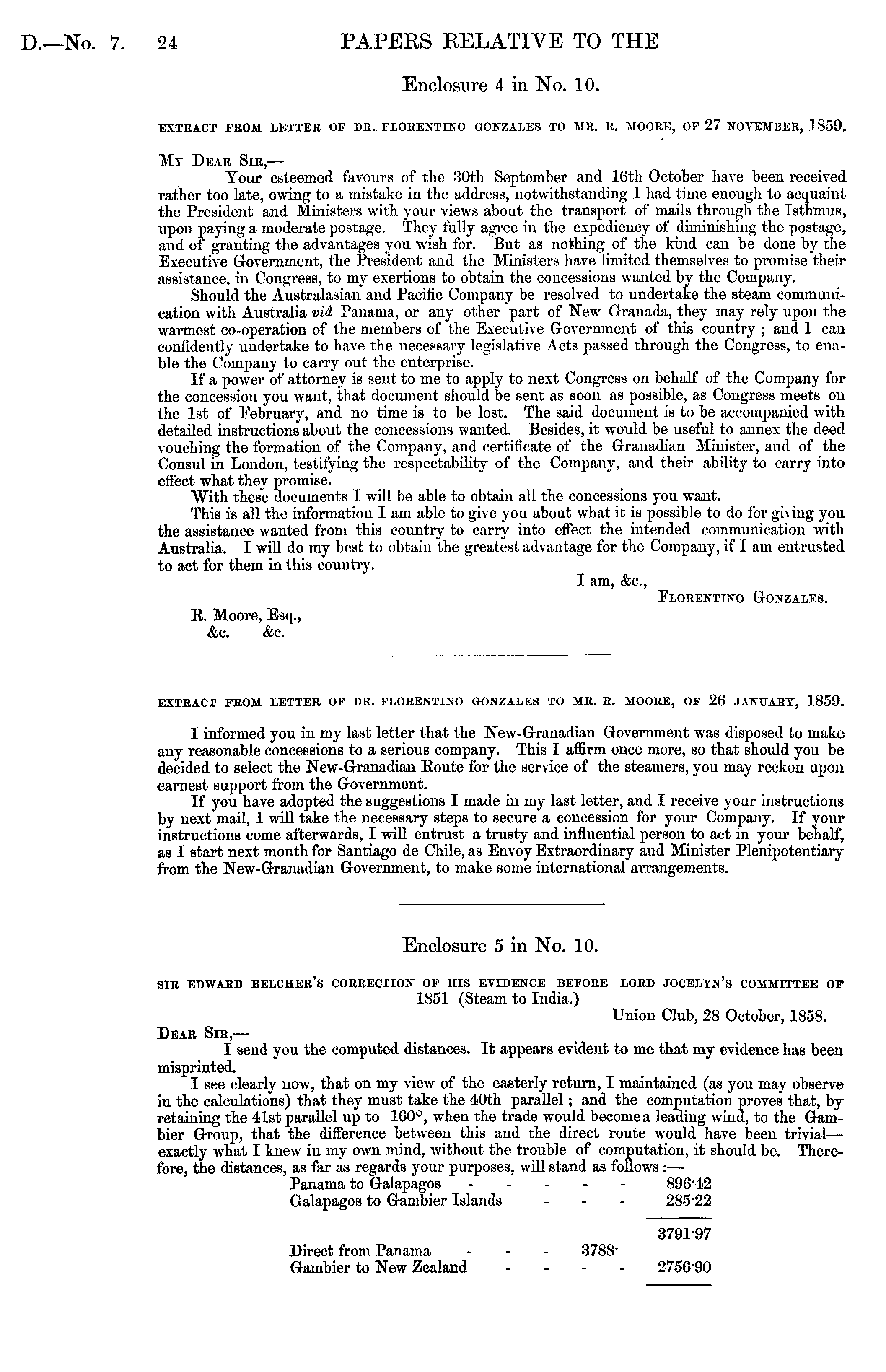EXTEACT FBOM LETTEE OF DE. FLOEENTINO GONZALES TO MB. B. MOOEE, OF 26 JANUAEY, 1859. I informed you in my last letter that the New-Granadian Government was disposed to make any reasonable concessions to a serious company. This I affirm once more, so that should you be decided to select the New-Granadian Route for the service of the steamers, you may reckon upon earnest support from the Government. If you have adopted the suggestions I made in my last letter, and I receive your instructions by next mail, I will take the necessary steps to secure a concession for your Company. If your instructions come afterwards, I will entrust a trusty and influential person to act in your behalf, as I start next month for Santiago de Chile, as Envoy Extraordinary and Minister Plenipotentiary from the NeAV-Granadian Government, to make some international arrangements.