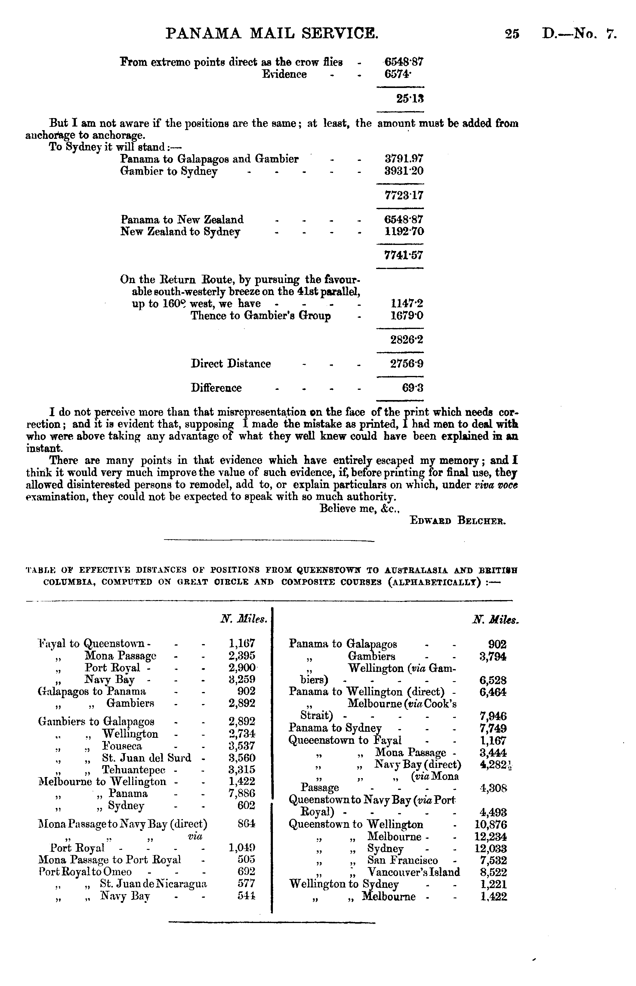 From extreme points direct as the crow flies - 6548- 87 Evidence - - 6574--2513 But lam not aware if the positions are the same; at least, the amount must be added from anchorage to anchorage. To Sydney it will stand:— Panama to Galapagos and Gambier - - 3791.97 Gambier to Sydney 393120 772317 Panama to New Zealand - 6548-87 New Zealand to Sydney .... 119270 7741-57 On the Return Route, by pursuing the favourable south-westerly breeze on the 41st parallel, up to 160? west, we have .... 1147-2 Thence to Gambier's Group - 1679-0 2826-2 Direct Distance - - - 27569 Difference .... 693 I do not perceive more than that misrepresentation on the face of the print which needs correction ; and it is evident that, supposing I made the mistake as printed, I had men to deal with who were above taking any advantage of what they well knew could have been explained in an instant. There are many points in that evidence which have entirely escaped my memory; and I think it would very much improve the value of such evidence, if, before printing for final use, they allowed disinterested persons to remodel, add to, or explain particulars on which, under viva voce examination, they could not be expected to speak with so much authority. Believe me, &c, Euwabd Belches.