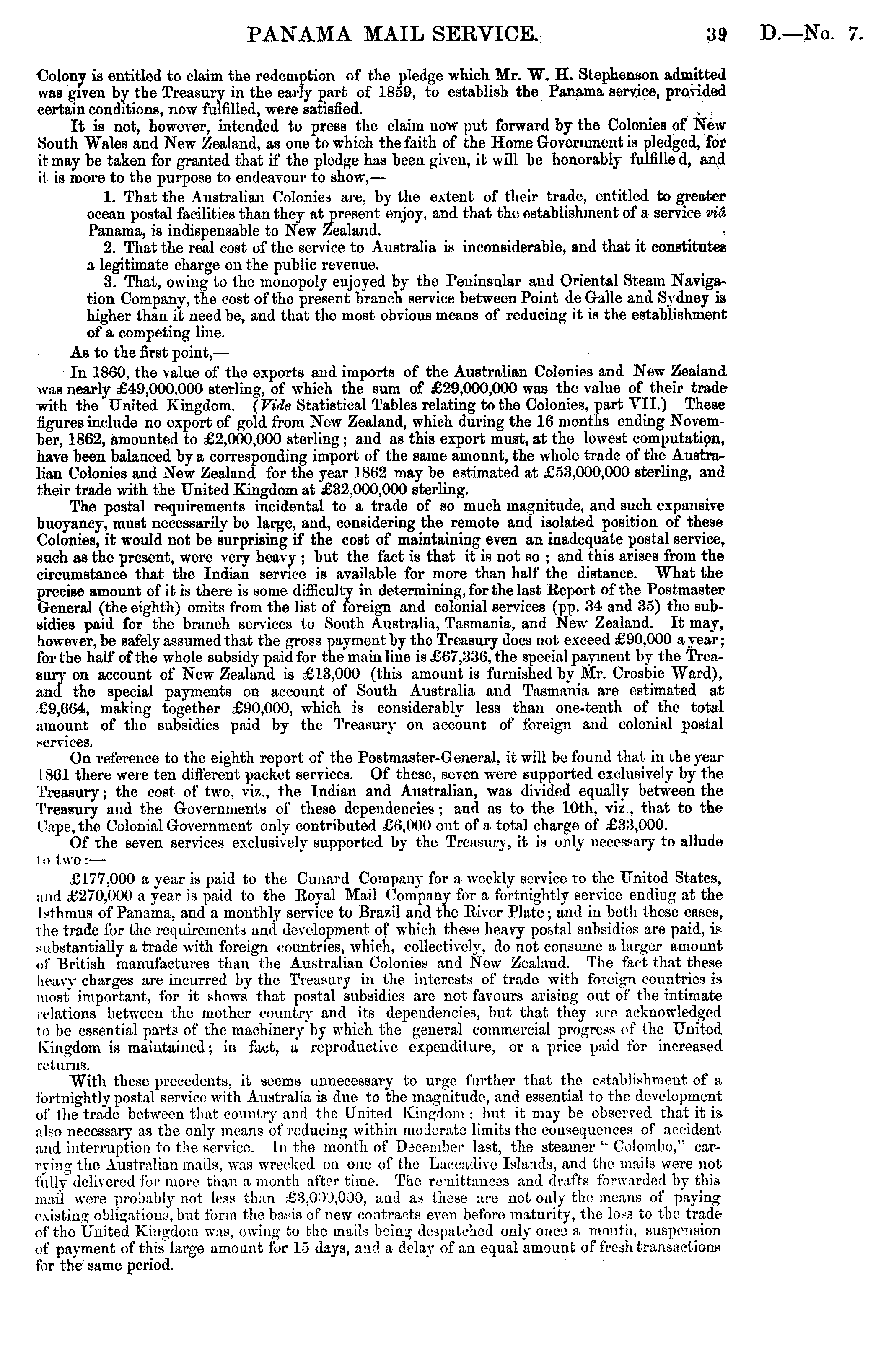 €olony is entitled to claim the redemption of the pledge which Mr. W. H. Stephenson admitted was given by the Treasury in the early part of 1859, to establish the Panama service, provided certain conditions, novr fulfilled, Avere satisfied. It is not, however, intended to press the claim now put forward by the Colonies of NewSouth Wales and New Zealand, as one to which the faith of the Home Government is pledged, for if may be taken for granted that if the pledge has been given, it will be honorably fulfille d, and it is more to the purpose to endeavour to show,— 1. That the Australian Colonies are, by the extent of their trade, entitled to greater ocean postal facilities than they at present enjoy, and that the establishment of a service via Panama, is indispensable to New Zealand. 2. That the real cost of the service to Australia is inconsiderable, and that it constitutes a legitimate charge on the public revenue. 3. That, oAving to the monopoly enjoyed by the Peninsular and Oriental Steam Navigation Company, the cost of the present branch service between Point de Galle and Sydney is higher than it need be, and that the most obvious means of reducing it is the establishment of a competing line. As to the first point, — In 1860, the value of the exports and imports of the Australian Colonies and New Zealand was nearly £49,000,000 sterling, of which the sum of £29,000,000 was the value of their trade with the United Kingdom. (Vide Statistical Tables relating to the Colonies, part VII.) These figures include no export of gold from New Zealand, AA'hich during the 16 months ending November, 1862, amounted to £2,000,000 sterling; and as this export must, at the lowest computation, have been balanced by a corresponding import of the same amount, the whole trade of the Australian Colonies and New Zealand for the year 1862 may be estimated at £53,000,000 sterling, and their trade with the United Kingdom at £32,000,000 sterling. The postal requirements incidental to a trade of so much magnitude, and such expansive buoyancy, must necessarily be large, and, considering the remote and isolated position of these Colonies, it would not be surprising if the cost of maintaining even an inadequate postal service, such as the present, were very heavy ; but the fact is that it is not so ; and this arises from the circumstance that the Indian service is available for more than half the distance. What the precise amount of it is there is some difficulty in determining, for the last Report of the Postmaster General (the eighth) omits from the list of foreign and colonial services (pp. 34 and 35) the subsidies paid for the branch services to South Australia, Tasmania, and NeAv Zealand. It may, however, be safely assumed that the gross payment by the Treasury does not exceed £90,000 a year; for the half of the whole subsidy paid for the main line is £67,336, the special payment by the Treasury on account of New Zealand is £13,000 (this amount is furnished by Mr. Crosbie Ward), and the special payments on account of South Australia and Tasmania are estimated at £9,664, making together £90,000, which is considerably less than one-tenth of the total amount of the subsidies paid by the Treasury on account of foreign and colonial postal services. On reference to the eighth report of the Postmaster-General, it will be found that in the year I S6l there were ten different packet services. Of these, seven were supported exclusively by the Treasury; the cost of two, viz., the Indian and Australian, was divided equally between the Treasury and the Governments of these dependencies; and as to the 10th, viz., that to the Cape, the Colonial Government only contributed £6,000 out of a total charge of £33,000. Of the seven services exclusively supported by the Treasury, it is only necessary to allude lot wo:— £177,000 a year is paid to the Cunard Company for a weekly service to the United States, and £270,000 a year is paid to the Royal Mail Company for a fortnightly service ending at the I sthmus of Panama, and a monthly service to Brazil and the River Plate; and in both these cases, the trade for the requirements and development of which these heavy postal subsidies are paid, is substantially a trade Avith foreign countries, which, collectively, do not consume a larger amount ol' British manufactures than the Australian Colonies and New Zealand. The fact that these heavy charges are incurred by the Treasury in the interests of trade with foreign countries is most important, for it shows that postal subsidies are not favours arising out of the intimate relations betAveen the mother country and its dependencies, but that they are acknowledged to be essential parts of the machinery by which the general commercial progress of the United Kingdom is maintained; in fact, a reproductive expenditure, or a price paid for increased returns. With these precedents, it seems unnecessary to urge further that the establishment of a fortnightly postal service with Australia is due to the magnitude, and essential to the development of the trade between that country and the United Kingdom ; but it may be observed that it is also necessary as the only means of reducing within moderate limits the consequences of accident and interruption to the service. In the month of December last, the steamer " Colombo," carrying the Australian mails, Avas wrecked on one of the Laccadive Islands, and the mails were not fully delivered for more than a month after time. The remittances and drafts forwarded bj- this mail were probably not less than £3,000,000, and as these are not only the means of paying existing obligations, but form the basis of new contracts even before maturity, the loss to the trade of the United Kingdom was, owing to the mails being despatched only once a month, suspension of payment of this large amount for 15 days, and a delay of an equal amount of fresh transactions for the same period.