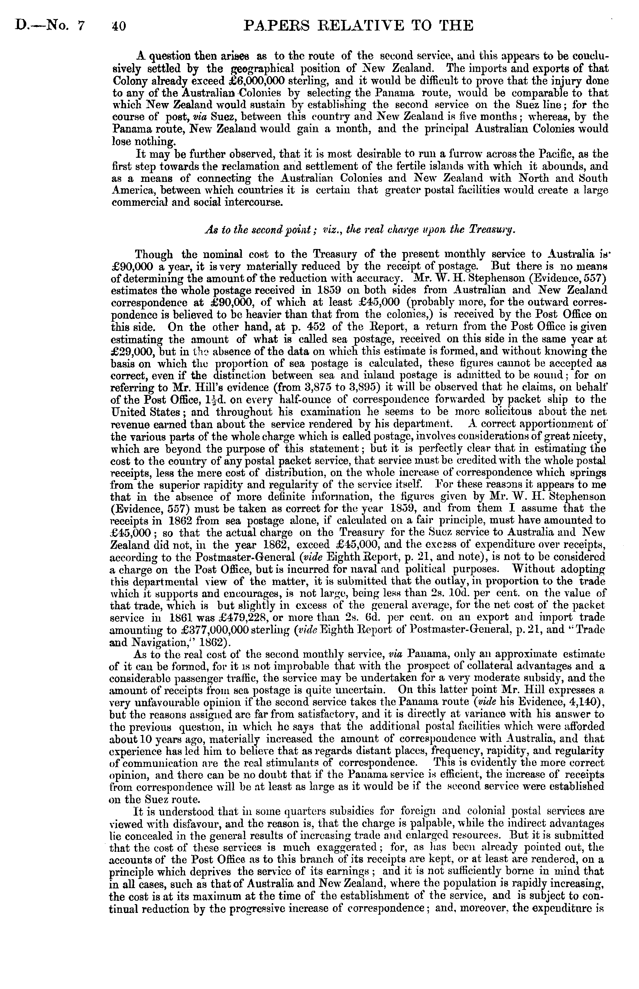A question then ariaes as to the route of the second service, and this appears to be conclusively settled by the geographical position of Xew Zealand. The imports and exports of that Colony already exceed £6,000,000 sterling, and it would be difficult to 2>rove that the injury done to any of the Australian Colonies by selecting the Panama route, would be comparable to that which Xew Zealand would sustain By establishing the second .service on the Suez line; for the course of post, via Suez, between this countiy and New Zealand is five months ; whereas, bv the Panama route, New Zealand would gain a month, and the principal Australian Colonies would lose nothing. It may be further observed, that it is most desirable to run a furrow across the Pacific, as the first step towards the reclamation and settlement of the fertile islands with which it abounds, and as a means of connecting the Australian Colonies and New Zealand with North and South America, between which countries it is certain that greater postal facilities would create a large commercial and social intercourse. As to the second point; viz., the real charge upon the Treasury. Though the nominal cost to the Treasury of the present monthly service to Australia iV £90,000 a year, it is very materially reduced by the receipt of postage. But there is uo moans of determining the amount of the reduction with accuracy. Mr. W. H. Stephenson (Evidence, 557) estimates the whole postage received in 1859 on both sides from Australian and New Zealand correspondence at £90,000, of which at least £45,000 (probably more, for the outward correspondence is believed to be heavier than that from the colonies,) is received by the Post Office on this side. On the other hand, at p. 452 of the Report, a return from the Post Office is given estimating the amount of what is called sea postage, received on this side in the same year at £29,000, but in the absence of the data on which this estimate is formed, and without knowing the basis on which the proportion of sea postage is calculated, these figures cannot be accepted as correct, even if the distinction between sea and inland postage is admitted to be sound; for on referring to Mr. Hill's evidence (from 3,875 to 3,895) it will be observed that lie claims, on behalf of the Post Office, VA. ou every half-ounce of correspondence forwarded by packet ship to the United States; and throughout his examination he seems to be more solicitous about the net revenue earned than about the service rendered by his department. A correct apportionment of the various parts of the whole charge which is called post age, involves considerations of great nicety, which are beyond the purpose of this statement; but it is perfectly clear that in estimating the cost to the country of any postal packet service, that service must be credited with the whole postal receipts, less the mere cost of distribution, on the whole increase of correspondence which springs from the superior rapidity and regularity of the service itself. For these reasons it appears to me that in the absence of more definite information, the figures given by Mr. W. H. Stephenson (Evidence, 557) must be taken as correct for the year 1859, and from them I assume that the receipts in 1862 from sea postage alone, if calculated on a fair principle, must have amounted to £15,000 ; so that the actual charge on the Treasiuy for the Suez service to Australia and New Zealand did not, in the year 1862, exceed £15,000, and the exc;ss of expenditure over receipts, according to the Postmaster-General (vide Eighth Eeport, p. 21, and note), is not to be considered a charge on the Post Office, but is incurred for naval and political purposes. Without adopting this departmental view of the matter, it is submitted that the outlay, in proportion to the trade which it supports and encourages, is not large, being less than 2s. lOd. per cent, on the value of that trade, which is but slightly in excess of the general average, for the net cost of the packet service in 1861 was £479,228, or more than 2s. (id. per cent, ou an export and import trade amounting to £377,000,000 sterling (vide Eighth Eeport of Postmaster-General, p. 21, and "Trade and Navigation/' 1802). As to the real cost of the second monthly service, via Panama, only an approximate estimate of it can be formed, for it is not improbable that with the prospect of collateral advantages and a considerable passenger traffic, the service may be undertaken for a very moderate subsidy, and the amount of receipts from sea postage is quite uncertain. On this latter point Mr. Hill expresses a very unfavourable opinion if the second service takes the Panama route (vide his Evidence, 4,140). but the reasons assigned are far from satisfactory, and it is directly at variance with his answer to the previous question, in which he says that the additional postal facilities which were afforded about 10 years ago, materially increased the amount of correspondence with Australia, and that experience has led him to believe that as regards distant places, frequency, rapidity, and regularity of communication are the real stimulants of correspondence. This is evidently the more correct opinion, and there can be no doubt that if the Panama service is efficient, the increase of receipts from correspondence will bo at least as large as it would be if the second service were established on the Suez route. It is understood that in some quarters subsidies for foreign and colonial postal services are viewed with disfavour, and the reason is, that the charge is palpable, while the indirect advantages lie concealed in the general results of increasing trade and enlarged resources. But it is submitted that the cost of these services is much exaggerated ; for, as has been already pointed out, the accounts of the Post Office as to this branch of its receipts are kept, or at least are rendered, on a principle which deprives the service of its earn