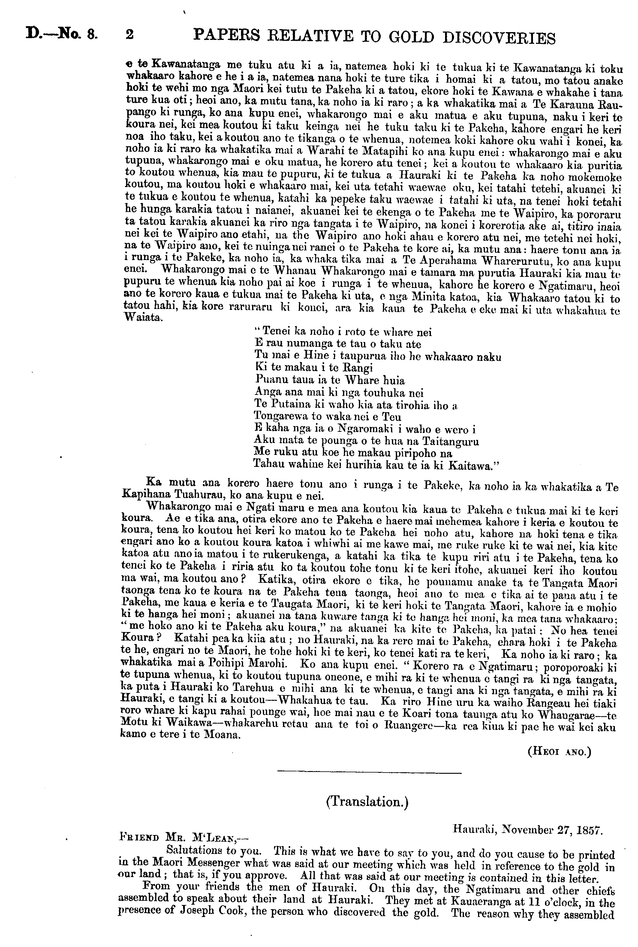 « teKawanatanga me tuku atu ki a ia, natemea hoki ki le tukua ki te Kawanatenga ki toku whakaaro kahore e he 1 a ia, natemea nana hoki te tare tika i homai ki a tatou mo tatou anake hoki te wehi mo nga Maori kei tutu te Pakeha ki a tatou, ekore hoki te Kawana e whakahe i tana ture kua oti; heoi ano, ka mutu tana, ka noho ia ki raro; a ka whakatika mai a Te Karauua Kaupango ki runga, ko ana kupu enei, whakarongo mai e aku matua e aku tupuna naku i keri te koura nei kei mea koutou ki taku keinga nei he tuku taku ki te Pakeha, kahore engari he keri noa lho taku, kei a koutou ano te iikanga o te whenua, notemea koki kahore oku wahi i konei ka noho ia kiraro ka whakatika mai a Warahi te Matapihi ko ana kupu enei: whakarongo mai e 'aku tupuna, wnakarongo mai e oku matua, he korero atu tend ; kei a fcoutou te whakaaro kia puritia to koutou whenua, kia mau te pupuru, ki te tukua a Hauraki ki te Pakeha ka noho mokemoke koutou, ma koutou hoki e whakaaro mai, kei uta tetahi waewae oku, kei tatahi tetehi, akuanei ki te tukua e koutou te whenua, katahi ka pepeke taku waewae i tatahi ki uta, na tenei lioki tetahi he tonga karakia tatou 1 naianei, akuanei kei te ekenga o te Pakeha me te Waipiro, ka pororaru ta tatou karakia akuanei ka riro nga tangata i te Waipiro, na konei i korerotia ake ai, titiro inaia nei kei te Waipiro ano etahi, na the Waipiro ano hoki ahau e korero atu nei, me tetehi nei hoki na te \Y aipiro ano, kei tc nuinganci ranei o te Pakeha te kore ai, ka mutu ana: haere tomi ana ia i runga i te Pakeke, ka noho ia, ka whaka tika mai a Te Aperahama Wharerurutu, ko ana kumi enei. Whakarongo mai e te Whanau Whakarongo mai e tamara ma purutia Hauraki kia mail te pupuru te whenua kia noho pai ai koc i runga i te whenua, kahore he korero e Neatimaru heoi ano te korero kaua e tukua mai te Pakeha ki uta, e nga Minita katoa, kia Whakaaro tatou ki to tatou hahi, kia kore raruraru ki konei, ara kia kaua te Pakeha e eke mai ki uta whakahua te VVaiata, " Tenei ka noho i roto te whare nei E rau numanga te tau o taku ate Tu mai e Hine i taupurua ilio lie whakaaro naku Ki to makau i to Kangi Puann taua ia to Whare huia Anga ana mai ki Bga touliuka nei Te Putaina ki walio kia ata tirohia iho a Tongarewa to waka nei e Teu K kaha nga ia o Ngaromaki i walio e wero i Aku mata te pounga o te hua na Taitanguru Me ruku atu koe he makau piripoho na Tahau wahine kei hurihia kau te ia ki Kaitawa." Ka mutu ana korero haere tonu ano i runga i te Pakeke, ka noho ia ka whakatika a Te ivapihana luahurau, ko ana kupu e nei. Whakarongo mai e Ngati maru e mea ana koutou kia kaua te Pakeha e tukua mai ki te kori koura. Ae e tika ana, otira ekore ano te Pakeha e haere mai mehemea kahore i keria e koutou te koura, tena ko koutou hei keri ko matou ko te Pakeha hoi noho atu, kahore na hoki tena e tika engari ano ko a koutou koura katoa i whiwhi ai me kawe mai, me ruke ruke ki te wai nei kia kite katoa atu anoia matou i to rukerukenga, a katahi lea tika to kupu riri atu i te Pakeha tena ko tenei ko te Pakeha i rim atu ko ta koutou tohe tonu ki te keri itohe, akuanei keri iho koutou ma wai, ma koutou ano P Katika, otira ekore e tika, he pounamu anake ta te Tangata Maori taonga tena ko to koura na te Pakeha tena taonga, heoi ano to mea e tika ai to pana atu i te Lakeha, me kaua e keria e te Taugata Maori, ki te keri hoki te Tangata Maori, kahore ia e mohio ki te hanga hei mom ; akuanei na tana kuware tanga ki to hanga hei inoni, ka mea tana, whakaaro; me hoko ano ki te Pakeha aku koura." na akuanei ka kite to Pakeha, ka patai : No hea tenei Koura V Katahi pea ka kua atu ; no Hauraki, na ka rerc mai te Pakeha, ehara hoki i te Pakeha te he, engari no te Maori, he tohe hoki ki te keri, ko tenei kati ra te keri, Ka noho ia ki raro • ka whakatika mai a Poihipi Maroln. Ko ana kupu enei. " Korero ra e Ngathnaru; poroporoaki ki te tupuna whenua ki to koutou tupuna oneone, e mihi ra ki to whenua e tangi ra ki nga tangata ka puta i Hauraki ko iarehua e mihi ana ki te whenua. e tangi ana ki nga tangata, e mihi ra ki -Hauraki, e tangi ki a koutou—Whakahua te tau. Ka riro Hine uru ka waiho Rangeau hei tiaki roro whare ki kapu raliai pounge wai, line mai nau e te Koari tona taunga atu ko Whau-rarae—te Motu ki Waikawa—whakarehu retau ana te toi o Euangere—ka rea kiua ki pae he wai kei aku kamo c tere 1 te Moana. (HEOr AHD.)