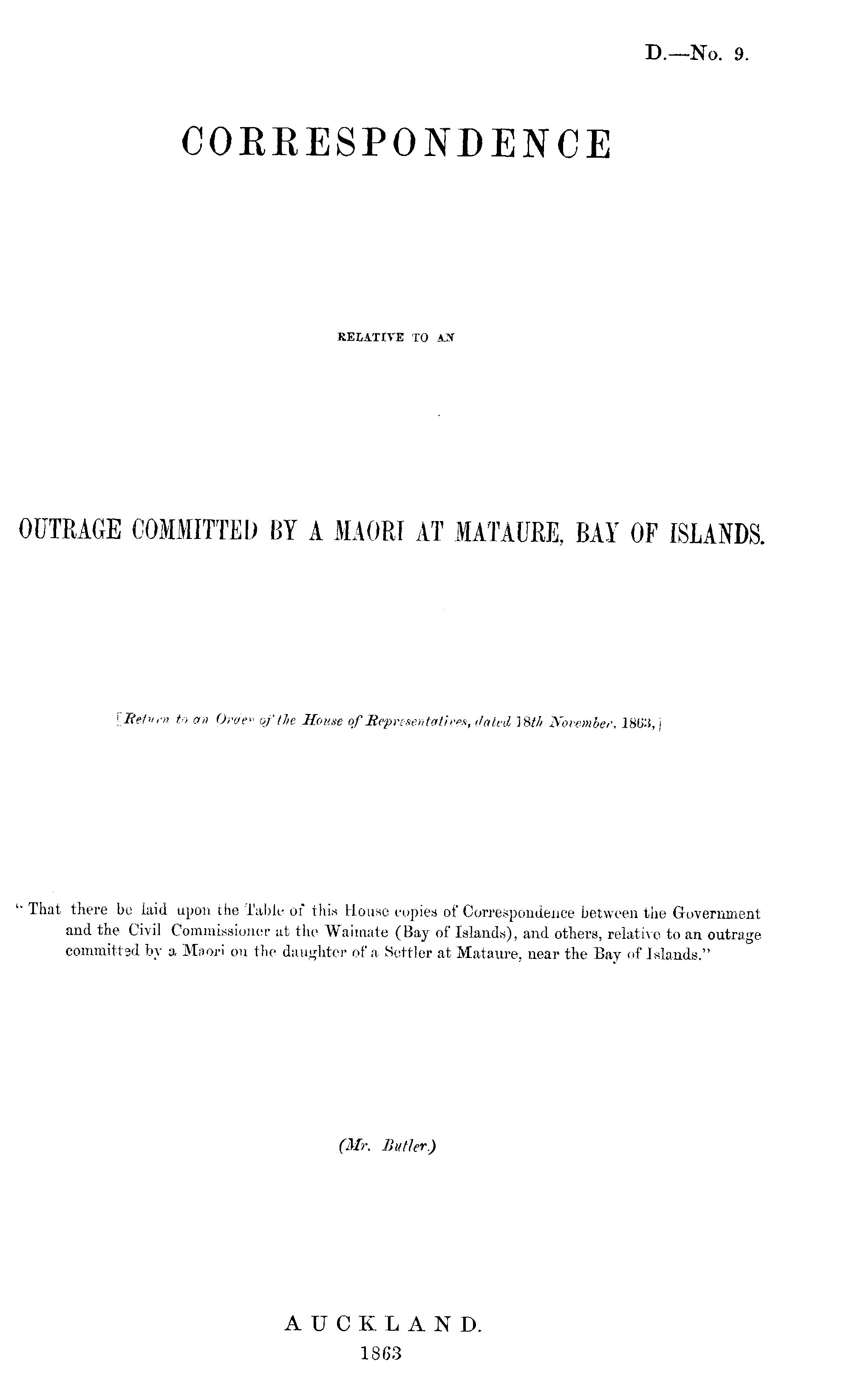 CORRESPONDENCE RELATIVE TO AN OUTRAGE COMMITTED BY A MAORI AT MATAURE, BAY OF ISLANDS.