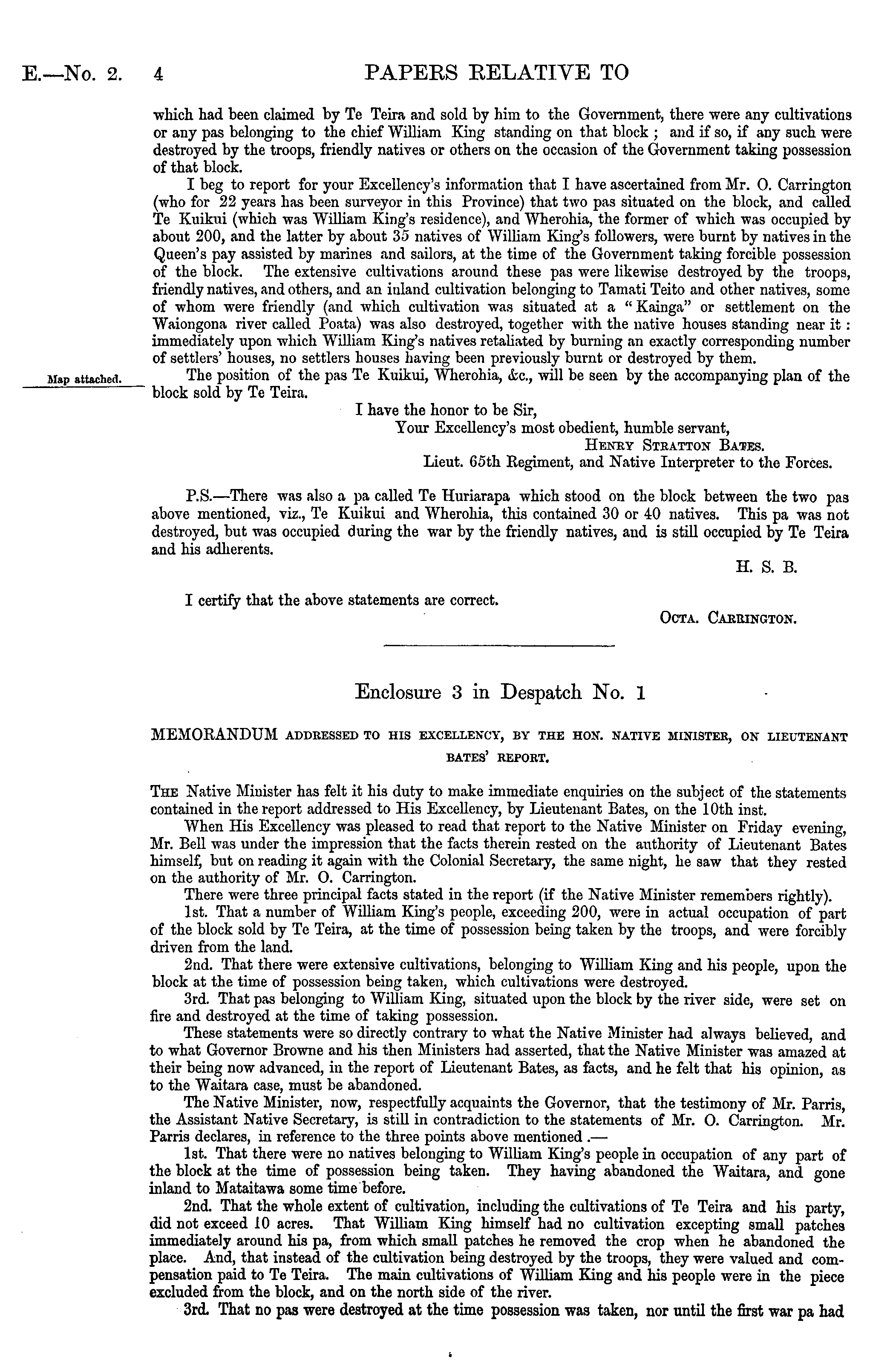 which had been claimed by Te Teira and sold by him to the Government, there were any cultivations or any pas belonging to the chief William King standing on that block ; and if so, if any such were destroyed by the troops, friendly natives or others on the occasion of the Government taking possession of that block. I beg to report for your Excellency's information that I have ascertained from Mr. 0. Carrington (who for 22 years has been surveyor in this Province) that two pas situated on the block, and called Te Kuikui (which was William King's residence), and Wherohia, the former of which was occupied by about 200, and the latter by about 35 natives of William King's followers, were burnt by natives in the Queen's pay assisted by marines and sailors, at the time of the Government taking forcible possession of the block. The extensive cultivations around these pas were likewise destroyed by the troops, friendly natives, and others, and an inland cultivation belonging to Tamati Teito and other natives, some of whom were friendly (and which cultivation was situated at a " Kainga" or settlement on the Waiongona river called Poata) was also destroyed, together with the native houses standing near it : immediately upon which William King's natives retaliated by burning an exactly corresponding number of settlers' houses, no settlers houses having been previously burnt or destroyed by them. The position of the pas Te Kuikui, Wherohia, ike, will be seen by the accompanying plan of the block sold by Te Teira. I have the honor to be Sir, Your Excellency's most obedient, humble servant, Henry Stratton Bates. Lieut. Goth Regiment, and Native Interpreter to the Forces. P.S.—There was also a pa called Te Huriarapa which stood on the block between the two pas above mentioned, viz., Te Kuikui and Wherohia, this contained 30 or 40 natives. This pa was not destroyed, but was occupied during the war by the friendly natives, and is still occupied by Te Teira and his adherents. H. S. B. I certify that the above statements are correct. Octa. Caeuington.