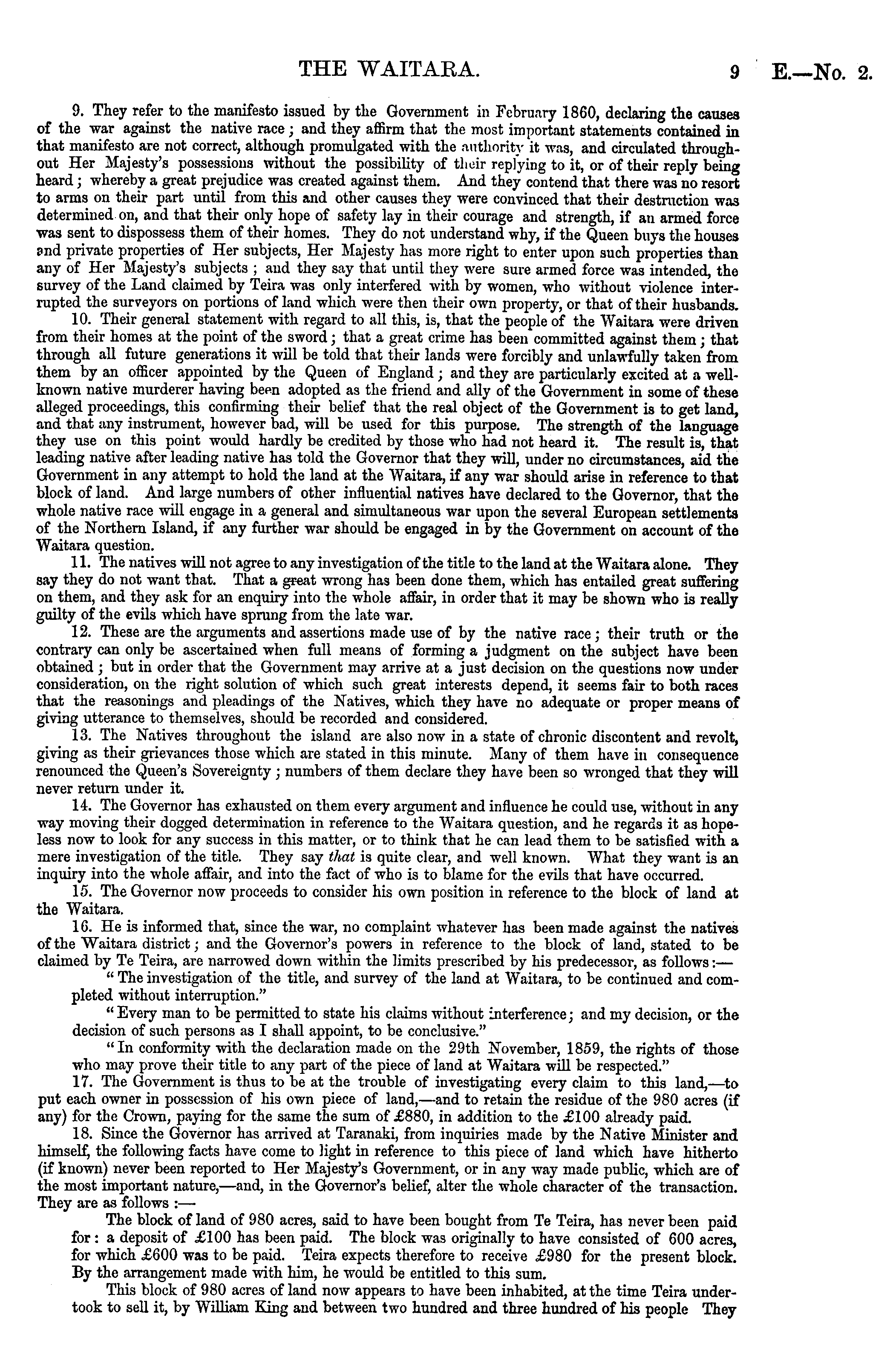 9. They refer to the manifesto issued by the Government in February 1860, declaring the causes of the war against the native race ; and they affirm that the most important statements contained in that manifesto are not correct, although promulgated with the authority it was, and circulated throughout Her Majesty's possessions without the possibility of their replying to it, or of their reply being heard; whereby a great prejudice was created against them. And they contend that there was no resort to arms on their part until from this and other causes they were convinced that their destruction was determined on, and that their only hope of safety lay in their courage and strength, if an armed force was sent to dispossess them of their homes. They do not understand why, if the Queen buys the houses £>nd private properties of Her subjects, Her Majesty has more right to enter upon such properties than any of Her Majesty's subjects ; and they say that until they were sure armed force was intended, the survey of the Land claimed by Teira was only interfered with by women, who without violence interrupted the surveyors on portions of land which were then their own property, or that of their husbands. 10. Their general statement with regard to all this, is, that the people of the Waitara were driven from their homes at the point of the sword ; that a great crime has been committed against them; that through all future generations it will be told that their lands were forcibly and unlawfully taken from them by an officer appointed by the Queen of England ; and they are particularly excited at a wellknown native murderer having been adopted as the friend and ally of the Government in some of these alleged proceedings, this confirming their belief that the real object of the Government is to get land, and that any instrument, however bad, will be used for this purpose. The strength of the language they use on this point would hardly be credited by those who had not heard it. The result is, that leading native after leading native has told the Governor that they will, under no circumstances, aid the Government in any attempt to hold the land at the Waitara, if any war should arise in reference to that block of land. And large numbers of other influential natives have declared to the Governor, that the whole native race will engage in a general and simultaneous war upon the several European settlements of the Northern Island, if any further war should be engaged in by the Government on account of the Waitara question. 11. The natives will not agree to any investigation of the title to the land at the Waitara alone. They say they do not want that. That a great wrong has been done them, which has entailed great suffering on them, and they ask for an enquiry into the whole affair, in order that it may be shown who is really guilty of the evils which have sprang from the late war. 12. These are the arguments and assertions made use of by the native race ; their truth or the contrary can only be ascertained when full means of forming a judgment on the subject have been obtained ; but in order that the Government may arrive at a just decision on the questions now under consideration, on the right solution of which such great interests depend, it seems fair to both races that the reasonings and pleadings of the Natives, which they have no adequate or proper means of giving utterance to themselves, should be recorded and considered. 13. The Natives throughout the island are also now in a state of chronic discontent and revolt, giving as their grievances those which are stated in this minute. Many of them have in consequence renounced the Queen's Sovereignty ; numbers of them declare they have been so wronged that they will never return under it. 14. The Governor has exhausted on them every argument and influence he could use, without in any way moving their dogged determination in reference to the Waitara question, and he regards it as hopeless now to look for any success in this matter, or to think that he can lead them to be satisfied with a mere investigation of the title. They say that is quite clear, and well known. What they want is an inquiry into the whole affair, and into the fact of who is to blame for the evils that have occurred. 15. The Governor now proceeds to consider his own position in reference to the block of land at the Waitara. 16. He is informed that, since the war, no complaint whatever has been made against the natives of the Waitara district; and the Governor's powers in reference to the block of land, stated to be claimed by Te Teira, are narrowed down within the limits prescribed by his predecessor, as follows:— " The investigation of the title, and survey of the land at Waitara, to be continued and completed without interruption." "Every man to be permitted to state his claims without interference; and my decision, or the decision of such persons as I shall appoint, to be conclusive." "In conformity with the declaration made on the 29th November, 1859, the rights of those who may prove their title to any part of the piece of land at Waitara will be respected." 17. The Government is thus to be at the trouble of investigating every claim to this land, —to put each owner in possession of his own piece of land, —and to retain the residue of the 980 acres (if any) for the Crown, paying for the same the sum of £880, in addition to the £100 already paid. 18. Since the Governor has arrived at Taranaki, from inquiries made by the Native Minister and himself, the following facts have come to light in reference to this piece of land which have hitherto (if known) never been reported to Her Majesty's Government, or in any way made public, which are of the most important nature, —and, in the Governor's belief, alter the whole character of the transaction. They are as follows : — The block of land of 980 acres, said to have been bought from Te Teira, has never been paid for : a dep