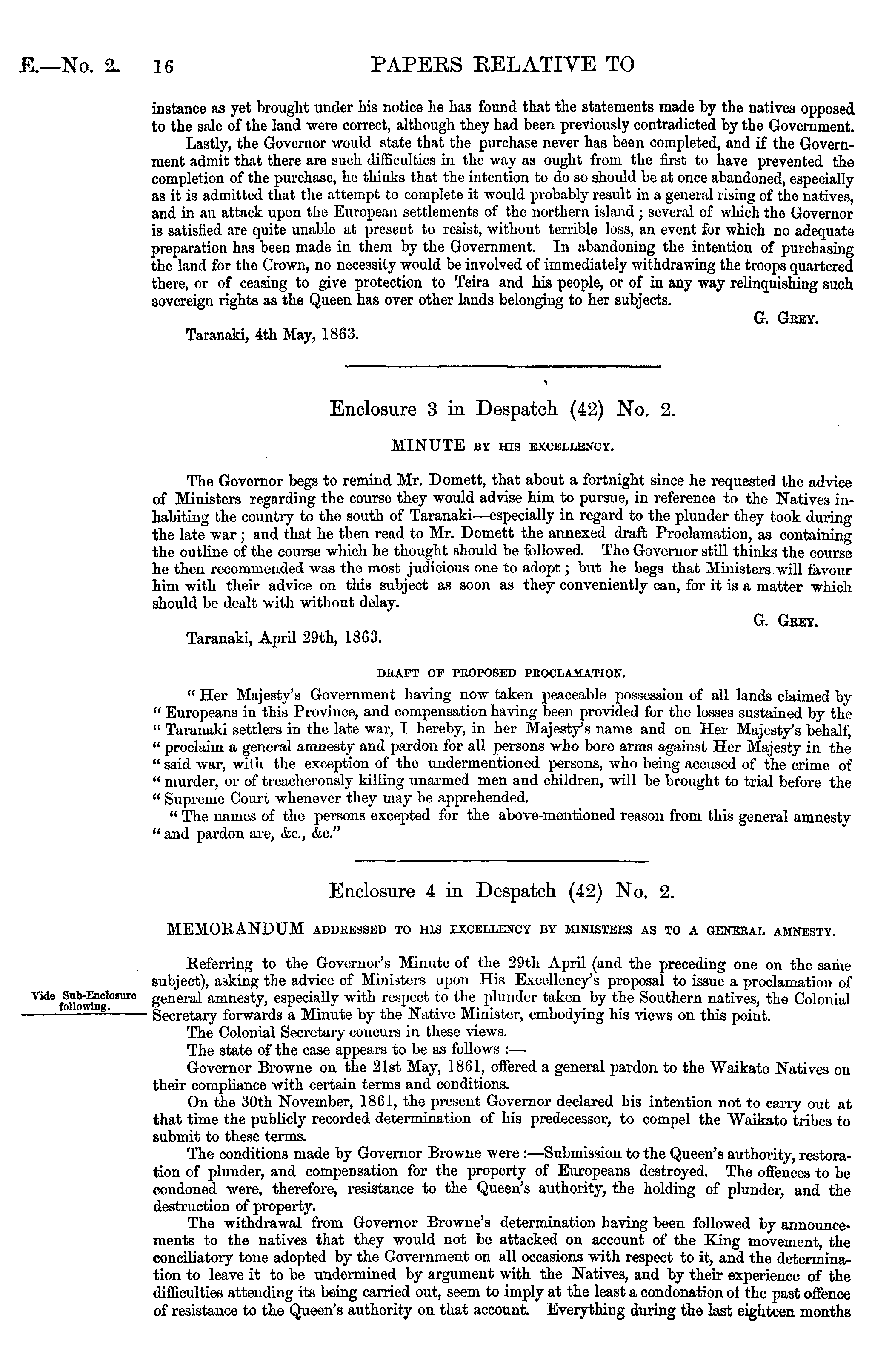 Enclosure 3 in Despatch (42) No. 2. MINUTE BY HIS EXCELLENCY. The Governor begs to remind Mr. Domett, that about a fortnight since he requested the advice of Ministers regarding the course they would advise him to pursue, in reference to the Natives inhabiting the country to the south of Taranaki—especially in regard to the plunder they took during the late war; and that he then read to Mr. Domett the annexed draft Proclamation, as containing the outline of the course which he thought should be followed. The Governor still thinks the course he then recommended was the most judicious one to adopt; but he begs that Ministers will favour him with their advice on this subject as soon as they conveniently can, for it is a matter which should be dealt with without delay. G. Grey. Taranaki, April 29th, 18G3. DRAFT OF PROPOSED PROCLAMATION. " Her Majesty's Government having now taken peaceable possession of all lands claimed by " Europeans in this Province, and compensation having been provided for the losses sustained by the " Taranaki settlers in the late war, I hereby, in her Majesty's name and on Her Majesty's behalf, " proclaim a general amnesty and pardon for all persons who bore arms against Her Majesty in the " said war, with the exception of the undermentioned persons, who being accused of the crime of " murder, or of treacherously killing unarmed men and children, will be brought to trial before the " Supreme Court whenever they may be apprehended. " The names of the persons excepted for the above-mentioned reason from this general amnesty " and pardon are, &c, &c."