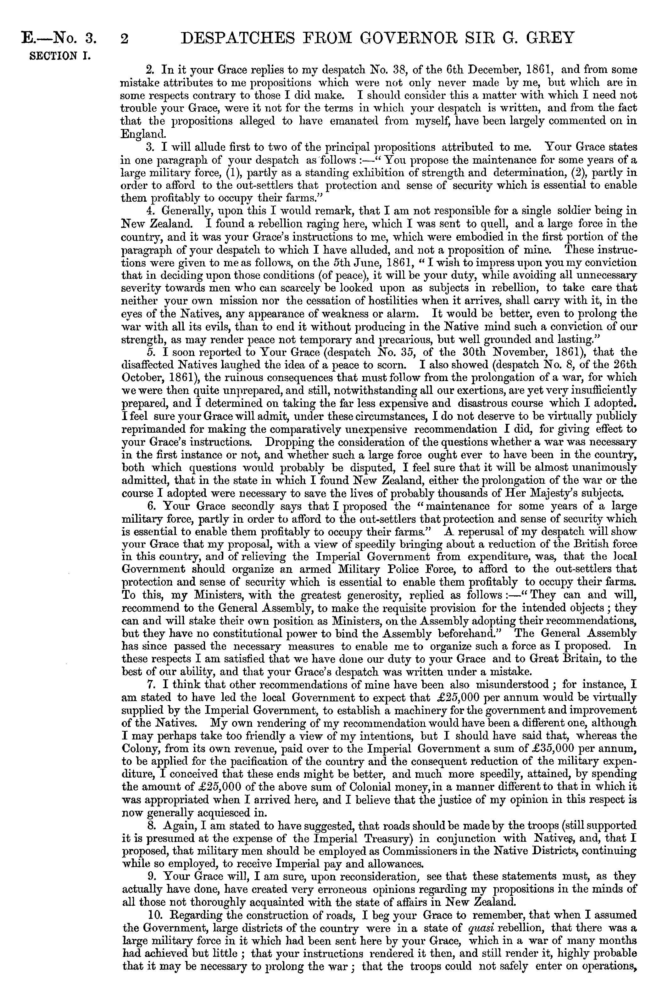 2. In it your Grace replies to my despatch No. 38, of the 6th December, 1861, and from some mistake attributes to me propositions which were not only never made by me, but which are in some respects contrary to those I did make. I should consider this a matter with which I need not trouble your Grace, were it not for the terms in which your despatch is written, and from the fact that the propositions alleged to have emanated from myself, have been largely commented on in England. 3. I will allude first to two of the principal propositions attributed to me. Your Grace states in one paragraph of your despatch as follows : —" You propose the maintenance for some years of a large military force, (1), 2'artly as a standing exhibition of strength and determination, (2), partly in order to afford to the out-settlers that protection and sense of security which is essential to enable them profitably to occupy their farms." 4. Generally, upon this I would remark, that I am not responsible for a single soldier being in New Zealand. I found a rebellion raging here, which I was sent to quell, and a large force in the country, and it was your Grace's instructions to me, which were embodied in the first portion of the paragraph of your despatch to which I have alluded, and not a proposition of mine. These instructions were given to me as follows, on the sth June, 1861, " I wish to impress upon you my conviction that in deciding upon those conditions (of peace), it will be your duty, while avoiding all unnecessary severity towards men who can scarcely be looked upon as subjects in rebellion, to take care that neither your own mission nor the cessation of hostilities when it arrives, shall carry with it, in the eyes of the Natives, any appearance of weakness or alarm. It would be better, even to prolong the war with all its evils, than to end it without producing in the Native mind such a conviction of our strength, as may render peace not temporary and precarious, but well grounded and lasting." 5. I soon reported to Your Grace (despatch No. 35, of the 30th November, 1861), that the disaffected Natives laughed the idea of a peace to scorn. I also showed (despatch No. 8, of the 26th October, 1861), the ruinous consequences that must follow from the prolongation of a war, for which we were then quite unprepared, and still, notwithstanding all our exertions, are yet very insufficiently prepared, and I determined on taking the far less expensive and disastrous course which I adopted. I feel sure your Grace will admit, under these circumstances, I do not deserve to be virtually publicly reprimanded for making the comparatively unexpensive recommendation I did, for giving effect to your Grace's instructions. Dropping the consideration of the questions whether a war was necessary in the first instance or not, and whether such a large force ought ever to have been in the country, both which questions would probably be disputed, I feel sure that it will be almost unanimously admitted, that in the state in which I found New Zealand, either the prolongation of the war or the course I adopted were necessary to save the lives of probably thousands of Her Majesty's subjects. 6. Your Grace secondly says that I proposed the " maintenance for some years of a large military force, partly in order to afford to the out-settlers that protection and sense of security which is essential to enable them profitably to occupy their farms." A reperusal of my despatch will show your Grace that my proposal, with a view of speedily bringing about a reduction of the British force in this country, and of relieving the Imperial Government from expenditure, was, that the local Government should organize an armed Military Police Force, to afford to the out-settlers that protection and sense of security which is essential to enable them profitably to occupy their farms. To this, my Ministers, with the greatest generosity, replied as follows : —" They can and will, recommend to the General Assembly, to make the requisite provision for the intended objects ; they can and will stake their own position as Ministers, on the Assembly adopting their recommendations, but they have no constitutional power to bind the Assembly beforehand." The General Assembly has since passed the necessary measures to enable me to organize such a force as I proposed. In these respects I am satisfied that we have done our duty to your Grace and to Great Britain, to the best of our ability, and that your Grace's desriatch was written under a mistake. 7. I think that other recommendations of mine have been also misunderstood ; for instance, I am stated to have led the local Government to expect that £25,000 per annum would be virtually supplied by the Imperial Government, to establish a machinery for the government and improvement of the Natives. My own rendering of my recommendation would have been a different one, although I may perhaps take too friendly a view of my intentions, but I should have said that, whereas the Colony, from its own revenue, paid over to the Imperial Government a sum of £35,000 per annum, to be applied for the pacification of the country and the consequent reduction of the military expenditure, I conceived that these ends might be better, and much more speedily, attained, by spending the amount of £25,000 of the above sum of Colonial money, in a manner different to that in which it was appropriated when I arrived here, and I believe that the justice of my opinion in this respect is now generally acquiesced in. 8. Again, I am stated to have suggested, that roads should be made by the troops (still supported it is presumed at the expense of the Imperial Treasury) in conjunction with Natives, and, that I proposed, that military men should be employed as Commissioners in the Native Districts, continuing while so employed, to receive Imperial pay and allowances. 9. Your Grace will, I am sure, upon reconsideration, see that these statements 