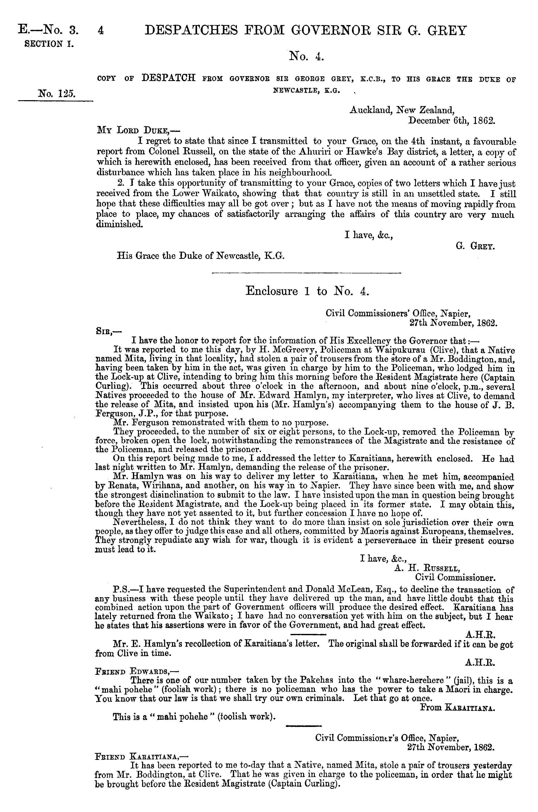 Enclosure 1 to No. 4. Civil Commissioners' Office, Napier, 27th November, 1862. Sib,— I have the honor to report for the information of His Excellency the Governor that:— It was reported to me this day, by H. McGreevy, Policeman at Waipukurau (Clive), that a Native named Mita, living in that locality, had stolen a pair of trousers from the store of a Mr. Boddington, and, having been taken by him in the act, was given in charge by him to the Policeman, who lodged him in the Lock-up at Clive, intending to bring him this morning before the Resident Magistrate hero (Captain Curling). This occurred about three o'clock in the afternoon, and about nine o'clock, p.m., several Natives proceeded to the house of Mr. Edward Hamlyn, my interpreter, who lives at Clive, to demand the release of Mita, and insisted upon his (Mr. Hamlyn's) accompanying them to the house of J. B. Ferguson, J.P., for that purpose. Mr. Ferguson remonstrated with them to no purpose. They proceeded, to the number of six or eight persons, to the Lock-up, removed the Policeman by force, broken open the lock, notwithstanding the remonstrances of the Magistrate and the resistance of the Policeman, and released the prisoner. On this report being made to me, I addressed the letter to Karaitiana, herewith enclosed. He had last night written to Mr. Hamlyn, demanding the release of the prisoner. Mr. Hamlyn was on his way to deliver my letter to Karaitiana, when ho met him, accompanied by Eenata, Wirihana, and another, on his way in to Napier. They have since been with me, and show the strongest disinclination to submit to the law. I have insisted upon the man in question being brought before the Resident Magistrate, and the Lock-up being placed in its former state. I may obtain this, though they have not yet assented to it, but further concession I have no hope of. Nevertheless, I do not think they want to do more than insist on sole jurisdiction over their own people, as they ofl'er to judge this case and all others, committed by Maoris against Europeans, themselves. They strongly repudiate any wish for war, though it is evident a perseverauce in their present course must lead to it. I have, &c, A. H. Eussell, Civil Commissioner. P.S.—I have requested the Superintendent and Donald McLean, Esq., to decline the transaction of any business with these people until they have delivered up the man, and have little doubt that this combined action upon the part of Government officers will produce the desired effect. Karaitiana has lately returned from the Waikato; I have had no conversation yet with him on the subject, but I hear he states that his assertions were in favor of the Government, and had great effect. A...H..J.Y. Mr. E. Hamlyn's recollection of Karaitiana's letter. The original shall be forwarded if it can be got from Clive in time. A.H.E. FbIEND EDWAKDS, — There is one of our number taken by the Pakehas into the " whare-herehere " (jail), this is a " main pohehe " (foolish work); there is no policeman who has the power to take a Maori in charge. You know that our law is that we shall try our own criminals. Let that go at once. From Eabaitiana. This is a " main pohehe " (ioolish work). Civil Commissioner's Office, Napier, 27th November, 1862. Fbiejjd Kaeaitiana, — It has been reported to me to-day that a Native, named Mita, stole a pair of trousers yesterday from Mr. Boddington, at Clive. That he was given in charge to the policeman, in order that he might be brought before the Eesident Magistrate (Captain Curling).