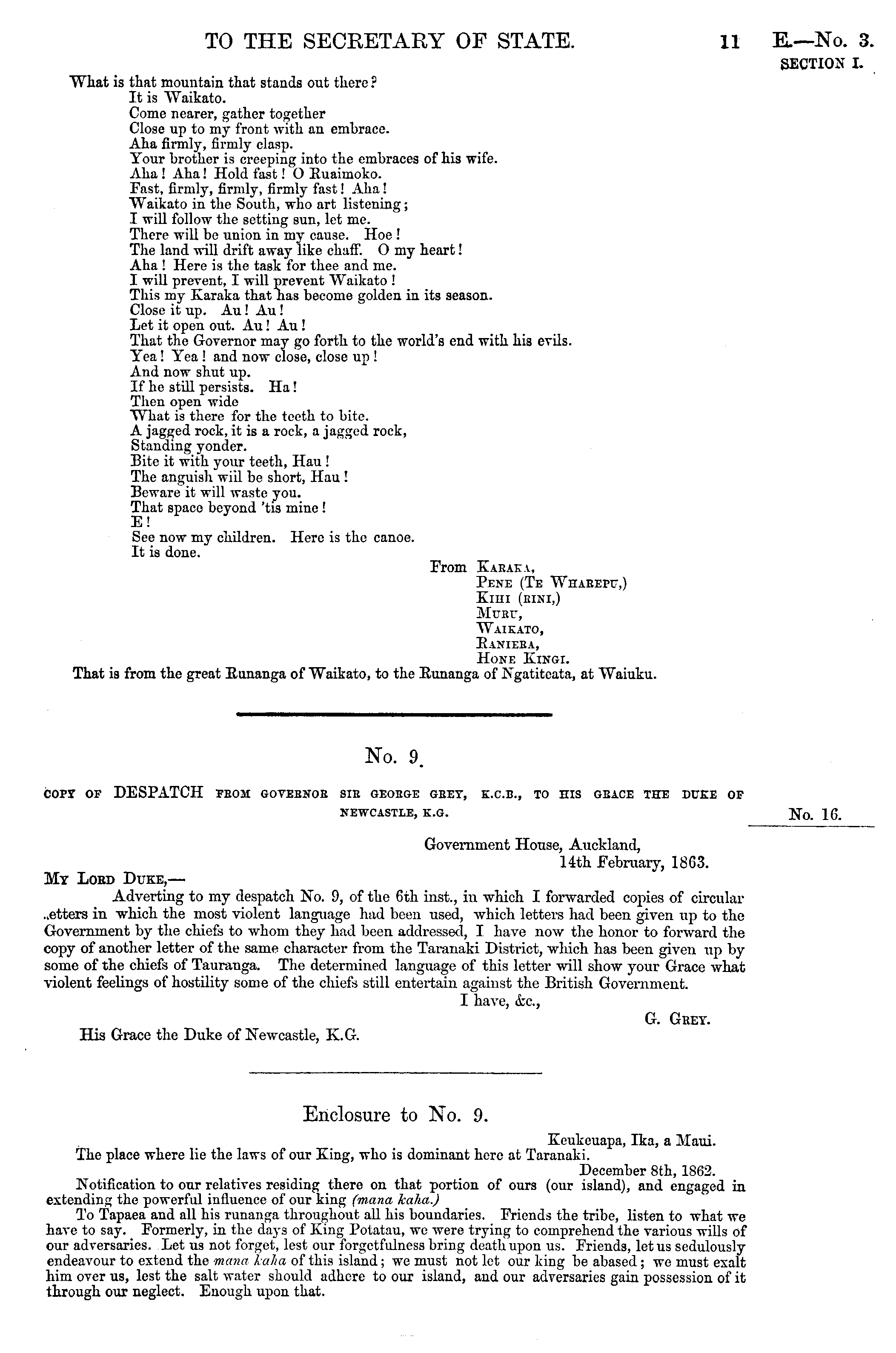 Enclosure to No. 9. Keukeuapa, Ika, a Maui. The place where lie the laws of our King, who is dominant here at Taranaki. December 8th, 1862. Notification to our relatives residing there on that portion of ours (our island), and engaged in extending the powerful influence of our king (mana kaka.) To Tapaea and all his runanga throughout all his boundaries. Friends the tribe, listen to what we hare to say. Formerly, in the days of King Potatau, we were trying to comprehend the various wills of our adversaries. Let us not forget, lest our forgctfulness bring death upon us. Friends, let us sedulously endeavour to extend the mana kaha of this island; we must not let our king be abased; we must exalt him over us, lest the salt water should adhere to our island, and our adversaries gain possession of it through our neglect. Enough upon that.