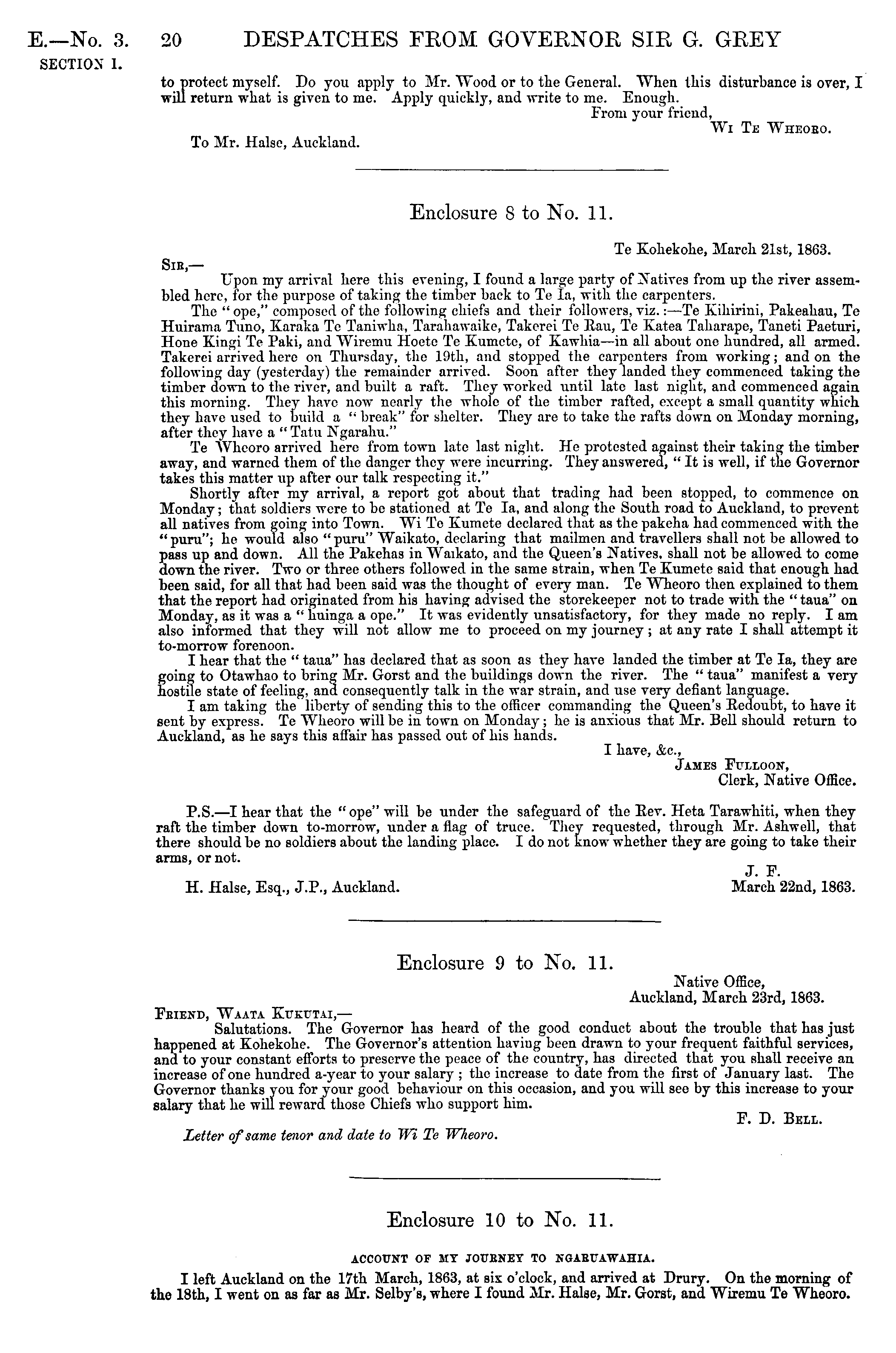 Enclosure 8 to No. 11. Te Kohekohe, March 21st, 1863. Sib,— Upon my arrival here this evening, I found a large party of Natives from up the river assembled here, for the purpose of taking the timber back to Te la, with the carpenters. The " ope," composed of the following chiefs and their followers, viz.: —Te Kihirini, Pakeahau, Te Huirama Tuno, Karaka To Taniwha, Tarahawaike, Takerei Te Eau, Te Katea Taharape, Taneti Paeturi, Hone Kingi Te Paki, and Wiremu Hoete Te Kumcte, of Kawhia—in all about one hundred, all armed. Takerei arrived here on Thursday, the 19th, and stopped the carpenters from working; and on the following day (yesterday) the remainder arrived. Soon after they landed they commenced taking the timber down to the river, and built a raft. They worked until late last night, and commenced again this morning. They have now nearly the whole of the timber rafted, except a small quantity which they have used to build a " break" for shelter. They are to take the rafts down on Monday morning, after they have a " Tatu Ngarahu." Te Wheoro arrived hero from town late last night. He protested against their taking the timber away, and warned them of the danger they were incurring. They answered, " It is well, if the Governor takes this matter up after our talk respecting it." Shortly after my arrival, a report got about that trading had been stopped, to commence on Monday; that soldiers were to be stationed at Te la, and along the South road to Auckland, to prevent all natives from going into Town. Wi To Kumetc declared that as the pakeha had commenced with the "puru"; he would also "puru" Waikato, declaring that mailmen and travellers shall not be allowed to pass up and down. All the Pakehas in Waikato, and the Queen's Natives, shall not be allowed to come down the river. Two or three others followed in the same strain, when Te Kumete said that enough had been said, for all that had been said was the thought of every man. Te Wheoro then explained to them that the report had originated from his having advised the storekeeper not to trade with the " taua" on Monday, as it was a " huinga a ope." It was evidently unsatisfactory, for they made no reply. I am also informed that they will not allow me to proceed on my journey; at any rate I shall attempt it to-morrow forenoon. I hear that the " taua" has declared that as soon as they have landed the timber at Te la, they are going to Otawhao to bring Mr. Gorst and the buildings down the river. The " taua" manifest a very hostile state of feeling, and consequently talk in the war strain, and use very defiant language. I am taking the liberty of sending this to the officer commanding the Queen's Redoubt, to have it sent by express. Te Wheoro will be in town on Monday; he is anxious that Mr. Bell should return to Auckland, as he says this affair has passed out of his hands. I have, &c, James Fulloon, Clerk, Native Office. P.S. —I hear that the "ope" will be under the safeguard of the Eev. Heta Tarawhiti, when they raft the timber down to-morrow, under a flag of truce. They requested, through Mr. Ashwell, that there should be no soldiers about the landing place. I do not know whether they are going to take their arms, or not. J. F. H. Halse, Esq., J.P., Auckland. March 22nd, 1863.