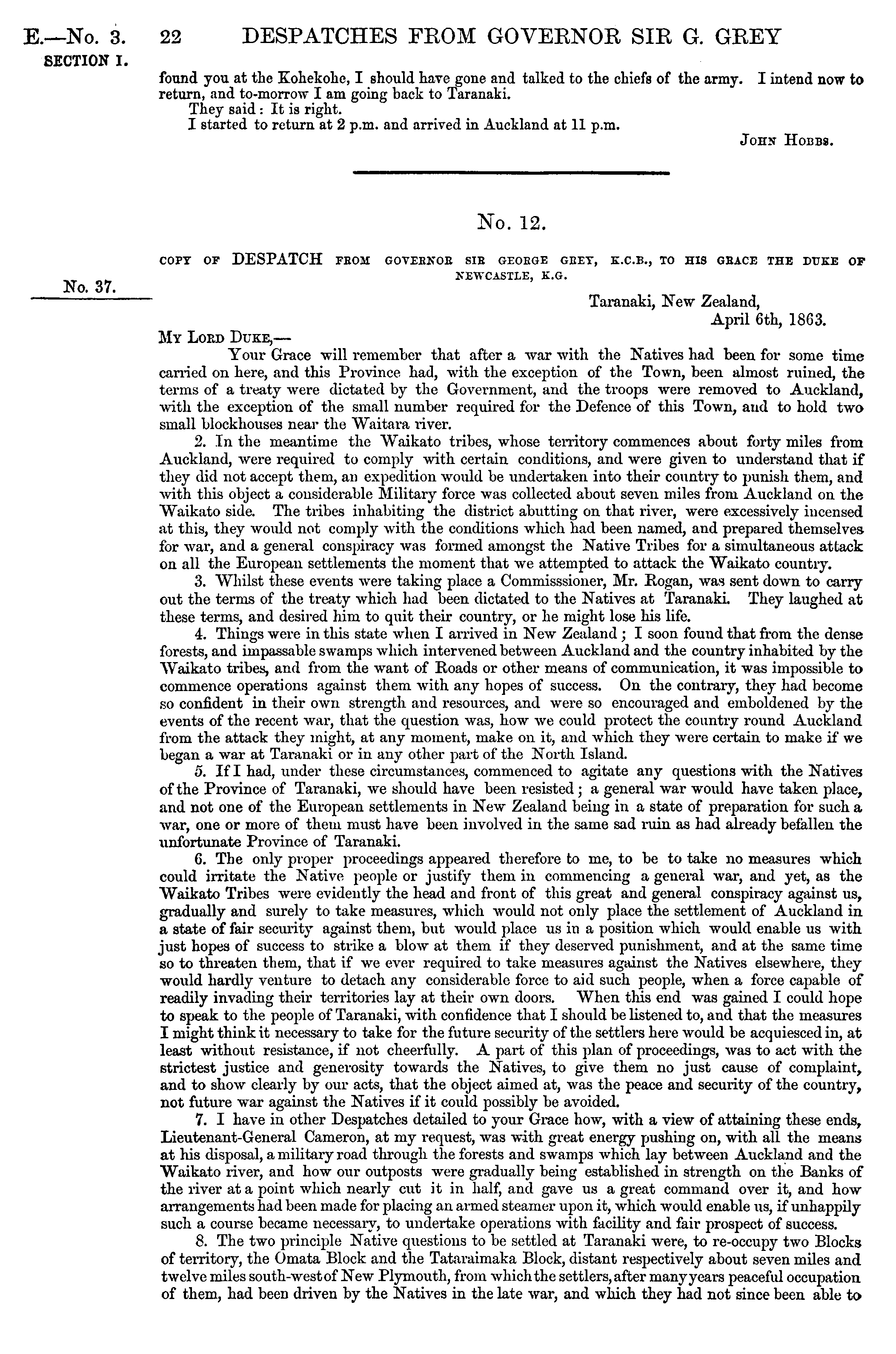 No. 12. COPT OF DESPATCH FBOM GOVEBNOB SIE GEOEGE GBET, K.C.B., TO HIS GEACE THE DTJKE OF NEWCASTLE, K.G. Taranaki, New Zealand, April 6th, 1863. My Loed Duke, — Your Grace will remember that after a war with the Natives had been for some time carried on here, and this Province had, with the exception of the Town, been almost ruined, the terms of a treaty were dictated by the Government, and the troops were removed to Auckland, with the exception of the small number required for the Defence of this Town, and to hold two small blockhouses near the Waitara liver. 2. In the meantime the Waikato tribes, whose territory commences about forty miles from Auckland, were required to comply with certain conditions, and were given to understand that if they did not accept them, an expedition would be undertaken into their country to punish them, and with this object a considerable Military force was collected about seven miles from Auckland on the Waikato side. The tribes inhabiting the district abutting on that river, were excessively incensed at this, they would not comply with the conditions which had been named, and prepared themselves for war, and a general consjjiracy was formed amongst the Native Tribes for a simultaneous attack on all the European settlements the moment that we attempted to attack the Waikato countiy. 3. Whilst these events were taking place a Commisssioner, Mr. Eogan, was sent down to carry out the terms of the treaty which had been dictated to the Natives at Taranaki. They laughed at these terms, and desired him to quit their country, or he might lose his life. 4. Things were in this state when I arrived in New Zealand; I soon found that from the dense forests, and impassable swamps which intervened between Auckland and the country inhabited by the Waikato tribes, and from the want of Roads or other means of communication, it was impossible to commence operations against them with any hopes of success. On the contrary, they had become so confident in their own strength and resources, and were so encouraged and emboldened by the events of the recent war, that the question was, how we could protect the country round Auckland from the attack they might, at any moment, make on it, and which they were certain to make if we began a war at Taranaki or in any other part of the North Island. 5. If I had, under these circumstances, commenced to agitate any questions with the Natives of the Province of Taranaki, we should have been resisted; a general war would have taken place, and not one of the European settlements in New Zealand being in a state of preparation for such a war, one or more of them must have been involved in the same sad ruin as had already befallen the unfortunate Province of Taranaki. 6. The only proper proceedings appeared therefore to me, to be to take no measures which could irritate the Native people or justify them in commencing a general war, and yet, as the Waikato Tribes were evidently the head and front of this great and general conspiracy against us, gradually and surely to take measures, which would not only place the settlement of Auckland in. a state of fair security against them, but would place us in a position which would enable us with just hopes of success to strike a blow at them if they deserved punishment, and at the same time so to threaten them, that if we ever required to take measures against the Natives elsewhere, they would hardly venture to detach any considerable force to aid such people, when a force capable of readily invading their territories lay at their own doors. When this end was gained I could hope to speak to the peojile of Taranaki, with confidence that I should be listened to, and that the measures I might think it necessary to take for the future security of the settlers here would be acquiesced in, at least without resistance, if not cheerfully. A part of this plan of proceedings, was to act with the strictest justice and genei'osity towards the Natives, to give them no just cause of complaint, and to show clearly by our acts, that the object aimed at, was the peace and security of the country, not future war against the Natives if it could possibly be avoided. 7. I have in other Despatches detailed to your Grace how, with a view of attaining these ends, Lieutenant-General Cameron, at my request, was with great energy pushing on, with all the means at his disposal, a military road through the forests and swamps which lay between Auckland and the Waikato river, and how our outposts were gradually being established in strength on the Banks of the river at a point which nearly cut it in half, and gave us a great command over it, and how arrangements had been made for placing an armed steamer upon it, which would enable us, if unhappily such a course became necessary, to undertake operations with facility and fair prospect of success. 8. The two principle Native questions to be settled at Taranaki were, to re-occupy two Blocks of territory, the Omata Block and the Tataraimaka Block, distant respectively about seven miles and twelve miles south-westof New Plymouth, from which the settlers, after manyyears peaceful occupation of them, had been driven by the Natives in the late war, and which they had not since been able to