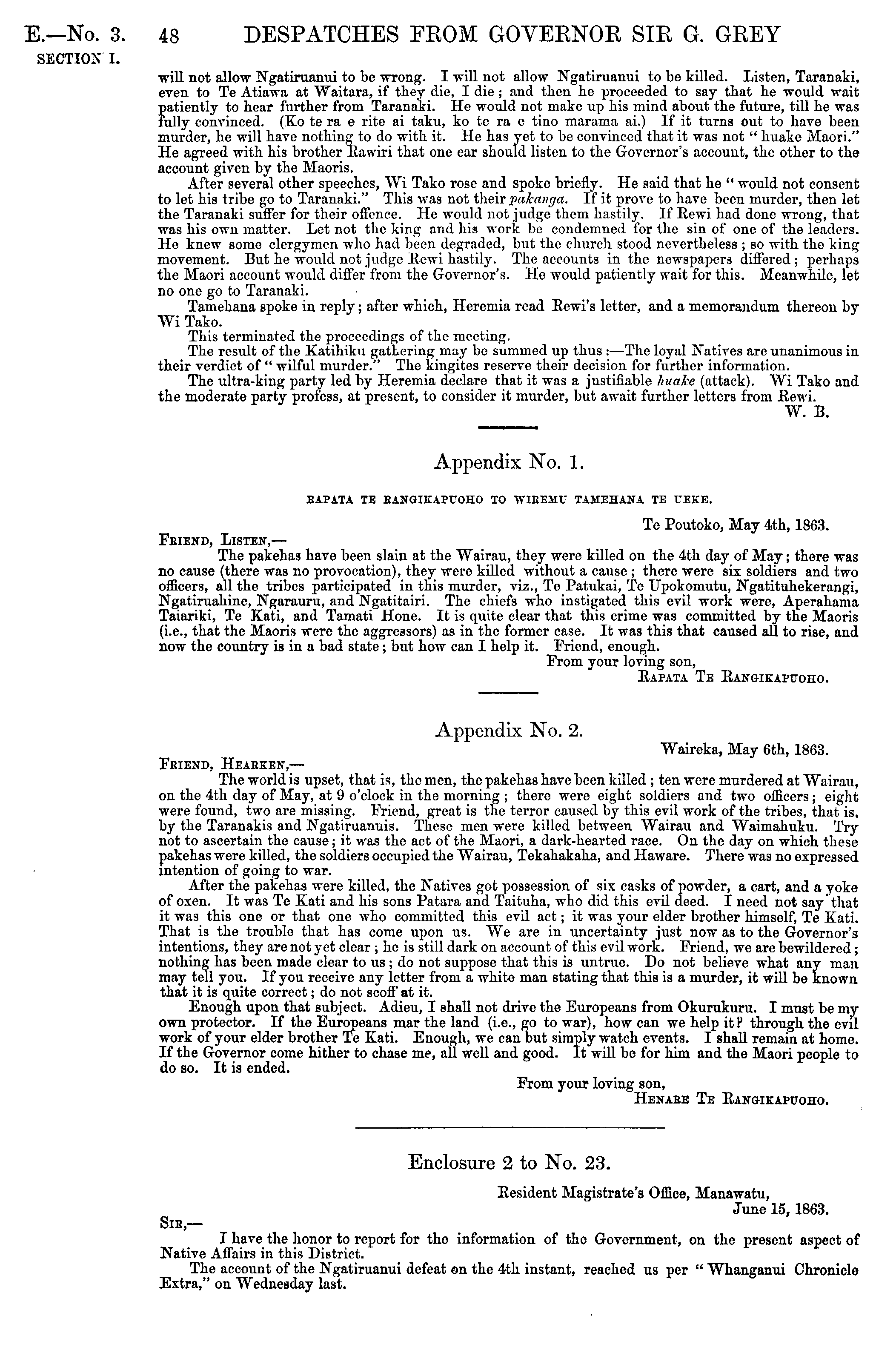 Appendix No. 1. EAPATA TE BANGIKAPTTOHO TO WIItESIU TAMEHANA TE TTEKE. Te Poutoko, May 4th, 1863. Fbiend, Listen, — The pakehas have been slain at the Wairau, they were killed on the 4th day of May; there was no cause (there was no provocation), they were killed without a cause ; there were six soldiers and two officers, all the tribes participated in this murder, viz., Te Patukai, Te TJpokomutu, Ngatituhekerangi, Ngatiruahine, Ngarauru, and Ngatitairi. The chiefs who instigated this evil work were, Aperahama Taiariki, Te Kati, and Tamati Hone. It is quite clear that this crime was committed by the Maoris (i.e., that the Maoris were the aggressors) as in the former case. It was this that caused all to rise, and now the country is in a bad state; but how can I help it. Friend, enough. From your loving son, Eapata Te Eangikapuoho. Appendix No. 2. Waireka, May 6th, 1863. Feiend, Heabken, — The world is upset, that is, the men, the pakehas have been killed ; ten were murdered at Wairau, on the 4th day of May, at 9 o'clock in the morning ; there were eight soldiers and two officers; eight were found, two are missing. Friend, great is the terror caused by this evil work of the tribes, that is, by the Taranakis and Ngatiruanuis. These men were killed between Wairau and Waimahuku. Try not to ascertain the cause; it was the act of the Maori, a dark-hearted race. On the day on which these pakehas were killed, the soldiers occupied the Wairau, Tekahakaha, and Haware. There was no expressed intention of going to war. After the pakehas were killed, the Natives got possession of six casks of powder, a cart, and a yoke of oxen. It was Te Kati and his sons Patara and Taituha, who did this evil deed. I need not say that it was this one or that one who committed this evil act; it was your elder brother himself, Te Kati. That is the trouble that has come upon us. We are in uncertainty just now as to the Governor's intentions, they arc not yet clear ; he is still dark on account of this evil work. Friend, we are bewildered; nothing has been made clear to us ; do not suppose that this is untrue. Do not believe what any man may tell you. If you receive any letter from a white man stating that this is a murder, it will be known that it is quite correct; do not scoff at it. Enough upon that subject. Adieu, I shall not drive the Europeans from Okurukuru. I must be my own protector. If the Europeans mar the land (i.e., go to war), how can we help itP through the eviL work of your elder brother Te Kati. Enough, we can but simply watch events. I shall remain at home. If the Governor come hither to chase me, all well and good. It will be for him and the Maori people to do so. It is ended. From your loving son, Henaee Te Eangikapuoho.