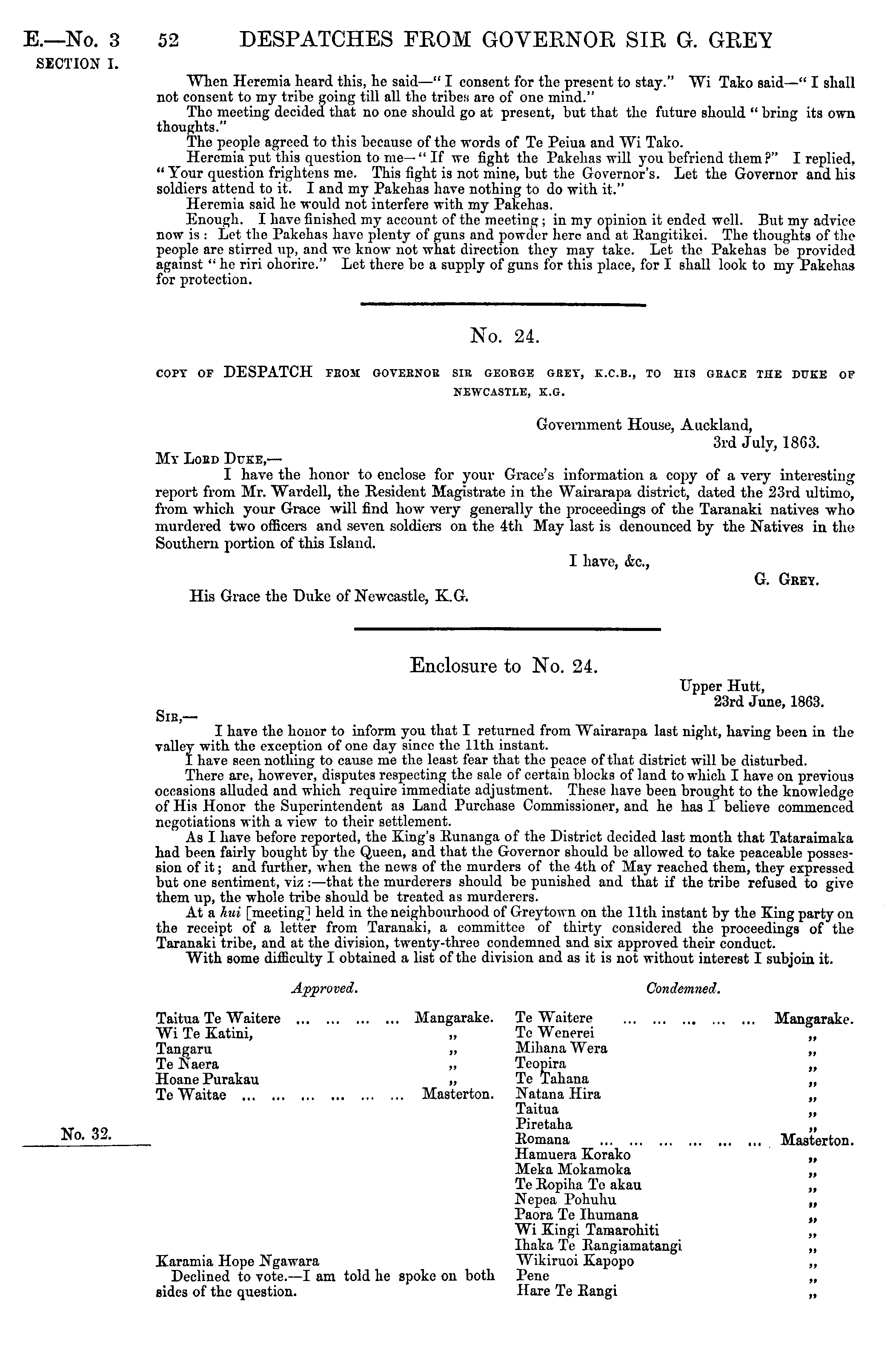 No. 24. COPT OF DESPATCH FEOM GOVEENOE SIB GEOBGE GHET, K.C.B., TO HIS GEACE THE DUKE OP NEWCASTLE, K.G. Government House, Auckland, 3rd July, 1863. My Lobd Duke, — I have the honor to enclose for your Grace's information a coj>y of a very interesting report from Mr. Wardell, the Resident Magistrate in the Wairarapa district, dated the 23rd ultimo, from which your Grace will find how very generally the proceedings of the Taranaki natives who murdered two officers and seven soldiers on the 4th May last is denounced by the Natives in the Southern portion of this Island. I have, &c, G. Gre7. His Grace the Duke of Newcastle, K.G.