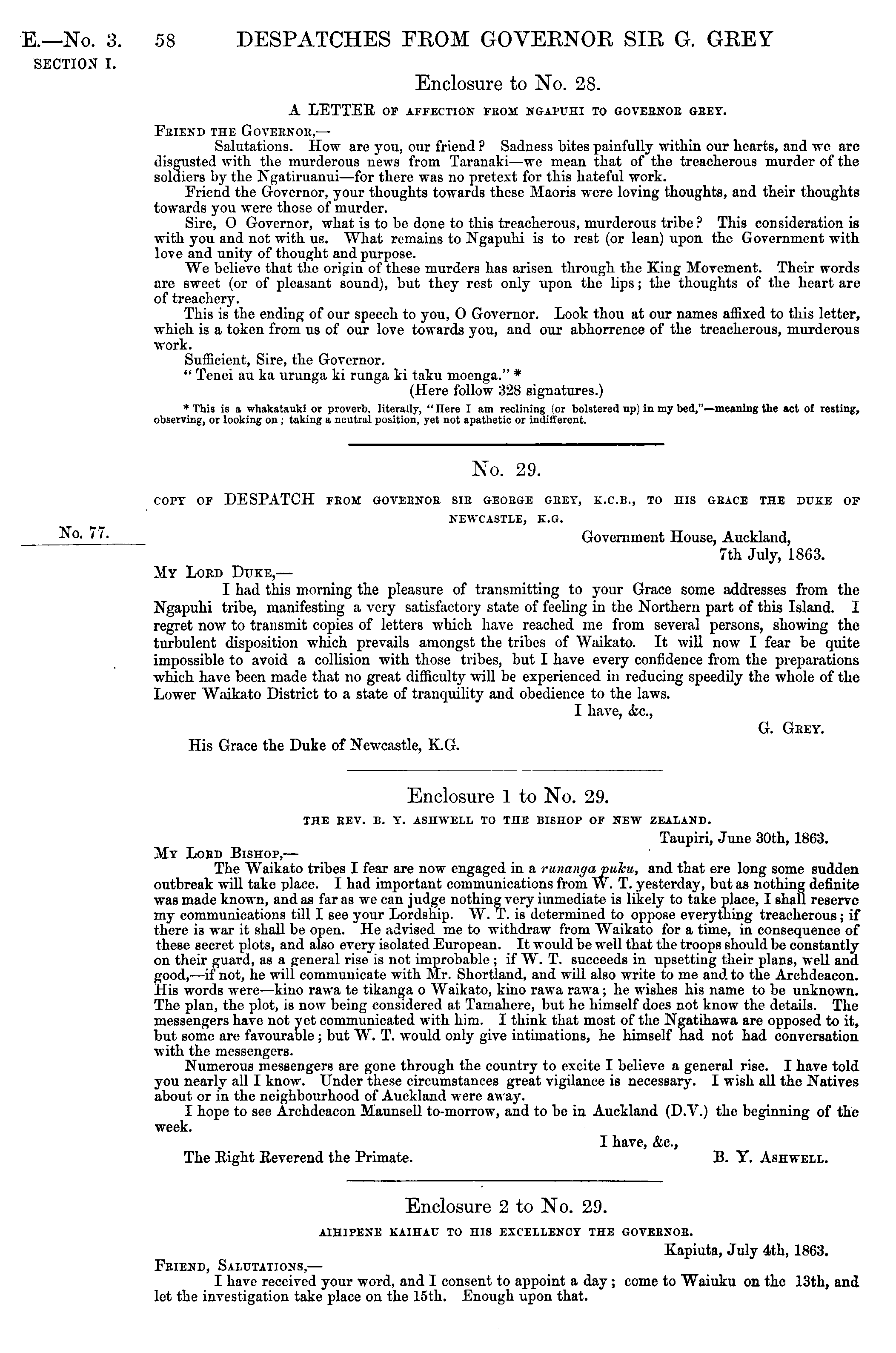 No. 29. COPT OF DESPATCH FEOM GOVEENOE SIB GEOEGE GBET, K.C.B., TO HIS GEACE THE DUKE OF NEWCASTLE, K.G. Government House, Auckland, 7th July, 1863. My Loed Duke, — I had this morning the pleasure of transmitting to your Grace some addresses from the Ngapuhi tribe, manifesting a very satisfactory state of feeling in the Northern part of this Island. I regret now to transmit copies of letters which have reached me from several persons, showing the turbulent disposition which prevails amongst the tribes of Waikato. It will now I fear be quite impossible to avoid a collision with those tribes, but I have every confidence from the preparations which have been made that no great difficulty will be experienced in reducing speedily the whole of the Lower Waikato District to a state of tranquility and obedience to the laws. I have, &c, G. Grey. His Grace the Duke of Newcastle, KG.