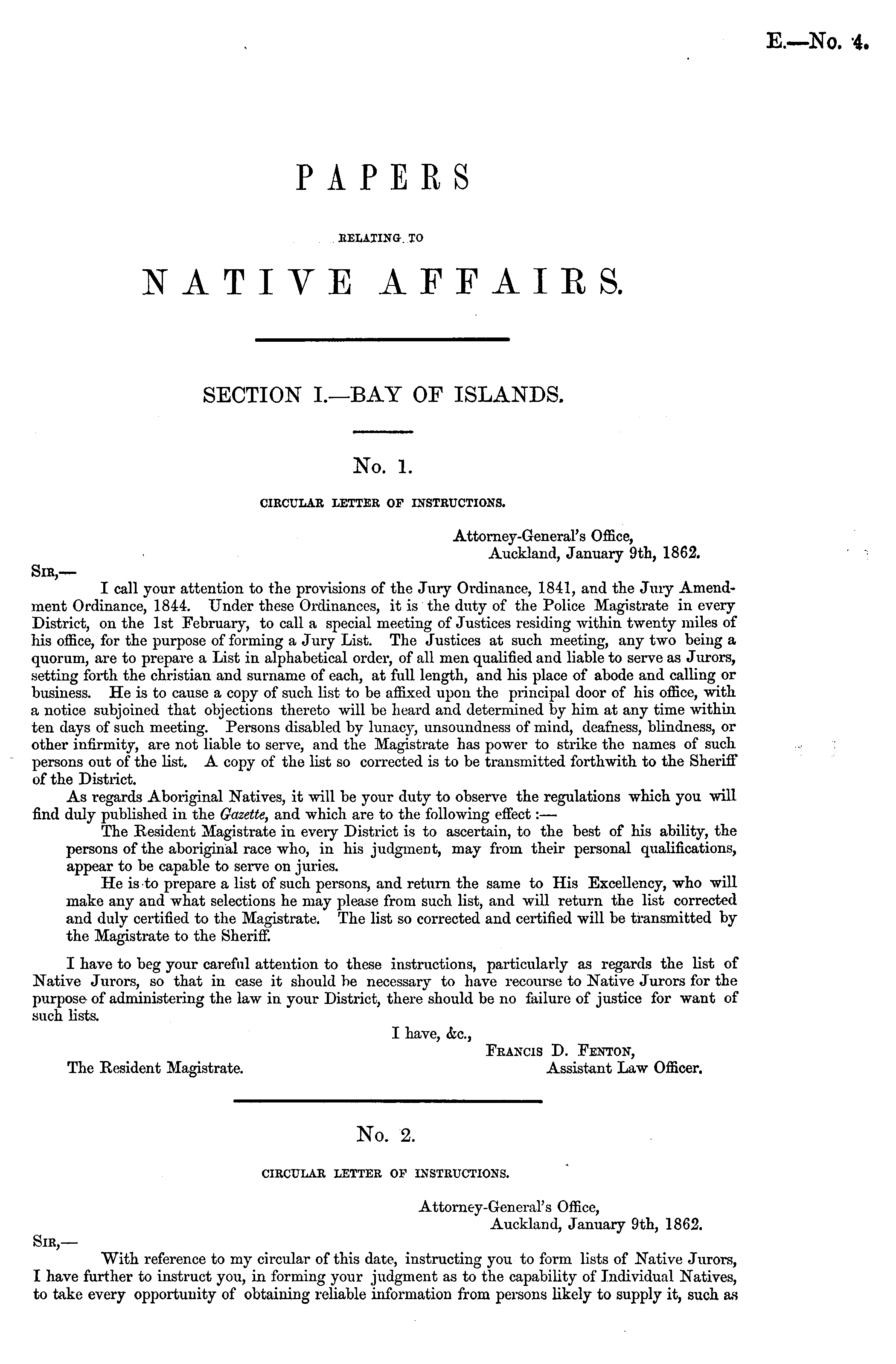 SECTION I.—BAY OF ISLANDS. No. 1. CIRCULAR LKTTER OP INSTRUCTIONS. Attorney-General's Office, Auckland, January 9th, 1862. Sir,— I call your attention to the provisions of the Jury Oi'dinance, 1841, and the Jury Amendment Ordinance, 1844. Under these Ordinances, it is the duty of the Police Magistrate in every District, on the 1st February, to call a special meeting of Justices residing within twenty miles of his office, for the purpose of forming a Jury List. The Justices at such meeting, any two being a quorum, are to prepare a List in alphabetical order, of all men qualified and liable to serve as Jurors, setting forth the Christian and surname of each, at full length, and his place of abode and calling or business. He is to cause a copy of such list to be affixed upon the principal door of his office, with a notice subjoined that objections thereto will be heard and determined by him at any time within ten days of such meeting. Persons disabled by lunacy, unsoundness of mind, deafness, blindness, or other infirmity, are not liable to serve, and the Magistrate has power to strike the names of such persons out of the list. A copy of the list so corrected is to be transmitted forthwith to the Sheriff1 of the District. As regards Aboriginal Natives, it will be your duty to observe the regulations which you will find duly published in the Gazette, and which are to the following effect: — The Resident Magistrate in every District is to ascertain, to the best of his ability, the persons of the aboriginal race who, in his judgment, may from, their personal qualifications, appear to be capable to serve on juries. He is to prepare a list of such persons, and return the same to His Excellency, who will make any and what selections he may please from such list, and will return the list corrected and duly certified to the Magistrate. The list so corrected and certified will be transmitted by the Magistrate to the Sheriff. I have to beg your careful attention to these instructions, particularly as regards the list of Native Jurors, so that in case it should be necessary to have recourse to Native Jurors for the purpose of administering the law in your District, there should be no failure of justice for want of such lists. I have, he, Francis D. Fenton, The Resident Magistrate. Assistant Law Officer.