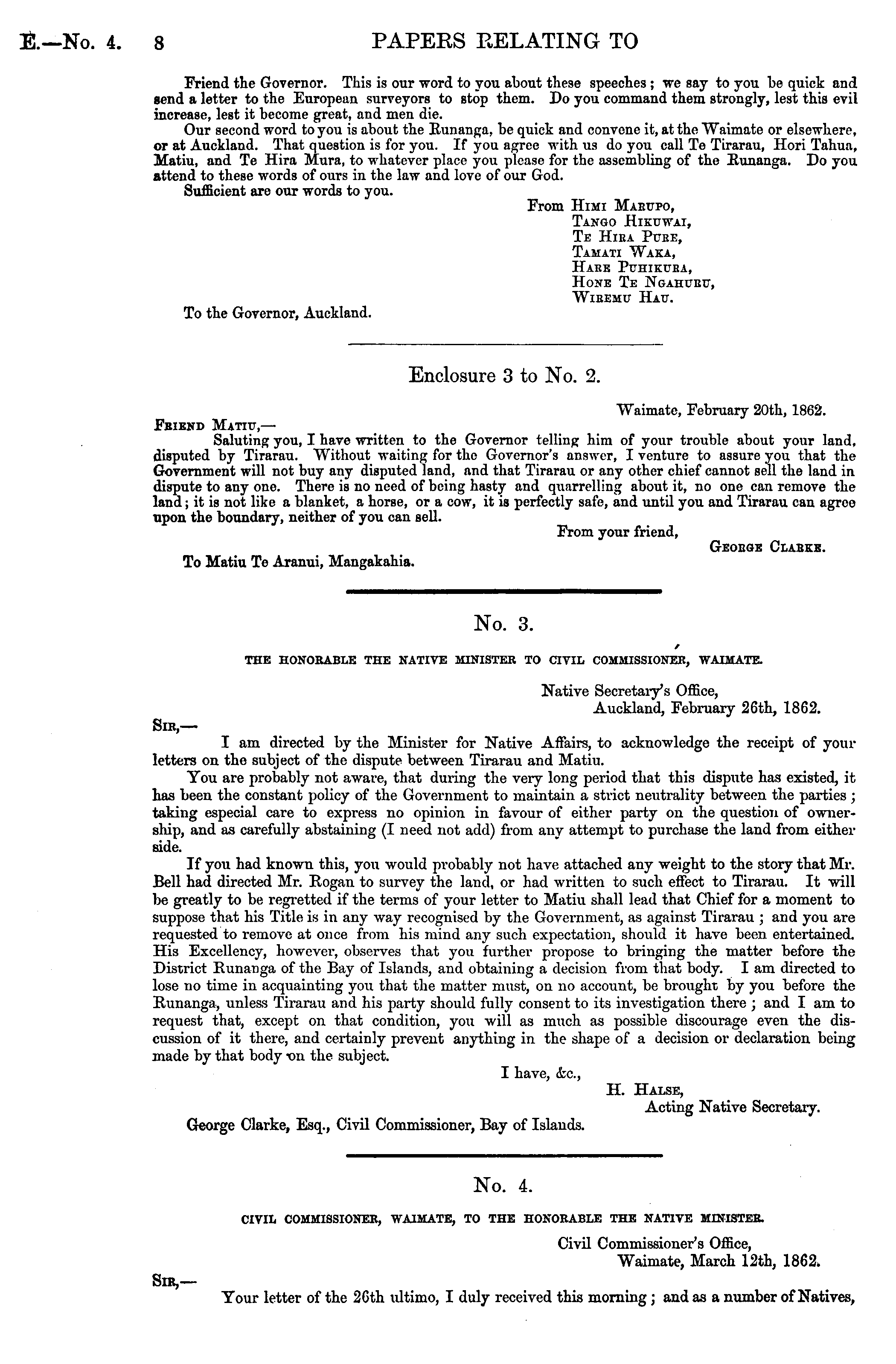 Enclosure 3 to No. 2. Waimate, February 20th, 1862. Fbiend Matiu, — Saluting you, I have written to the Governor telling him of your trouble about your land, disputed by Tirarau. Without waiting for the Governor's answer, I venture to assure you that the Government will not buy any disputed land, and that Tirarau or any other chief cannot sell the land in dispute to any one. There is no need of being hasty and quarrelling about it, no one can remove the land; it is not like a blanket, a horse, or a cow, it is perfectly safe, and until you and Tirarau can agree upon the boundary, neither of you can sell. From your friend, Geoege Clabke. To Matiu Te Aranui, Mangakahia.