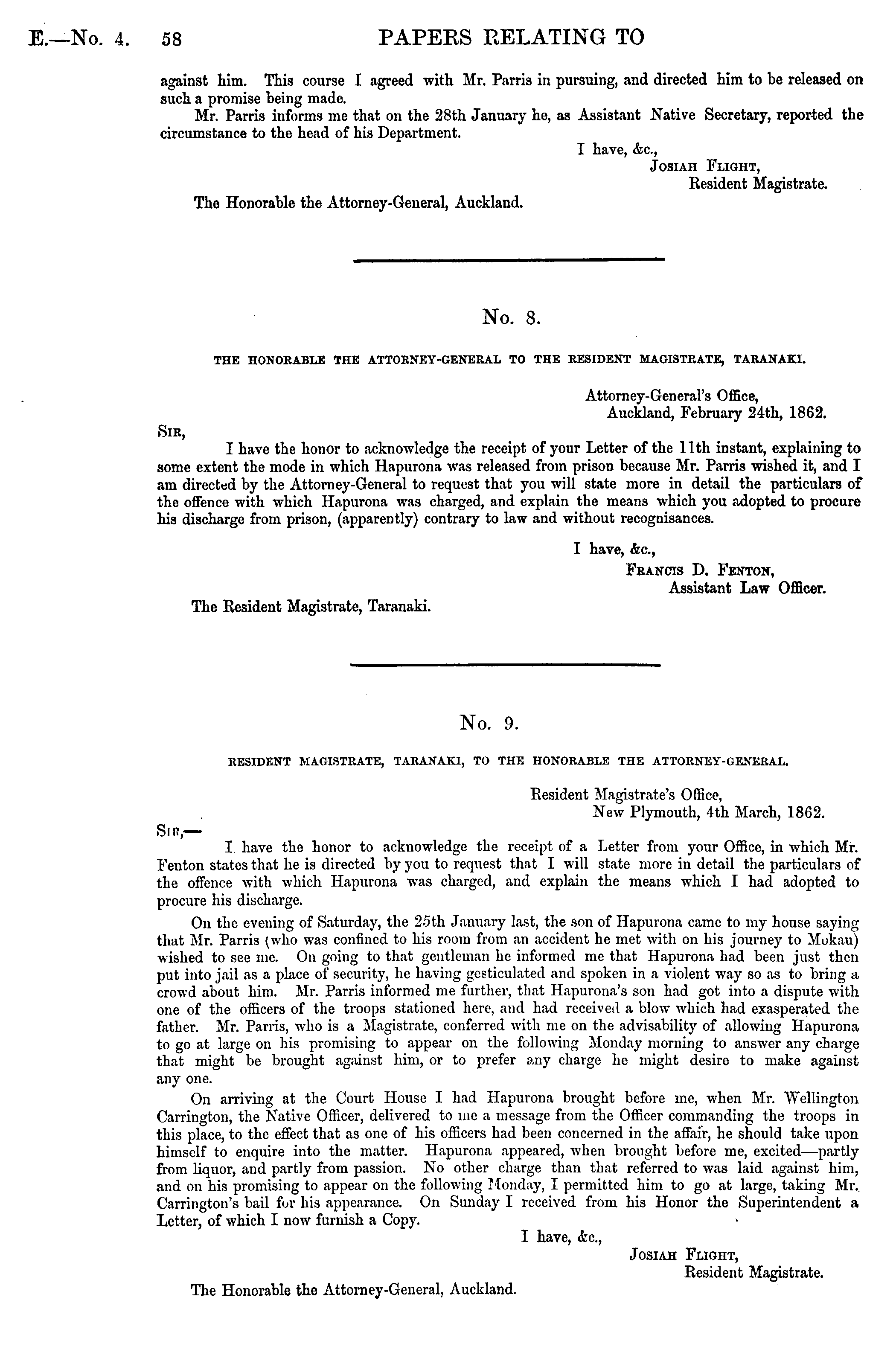 No. 9. RESIDENT MAGISTRATE, TARANAKI, TO THE HONORABLE THE ATTORNEY-GENERAL. Resident Magistrate's Office, New Plymouth, 4th March, 1862. Sir, — I have the honor to acknowledge the receipt of a Letter from your Office, in which Mr. Feuton states that he is directed by you to request that I will state more in detail the particulars of the offence with which Hapurona was charged, and explain the means which I had adopted to procure his discharge. On the evening of Saturday, the 25th January last, the son of Hapurona came to my house saying that Mr. Parris was confined to his room from an accident he met with on his journey to Mokau) wished to see me. On going to that gentleman he informed me that Hapurona had been just then put into jail as a place of security, he having gesticulated and spoken in a violent way so as to bring a crowd about him. Mr. Parris informed me further, that Hapurona's son had got into a dispute with one of the officers of the troops stationed here, and had received a blow which had exasperated the father. Mr. Parris, who is a Magistrate, conferred with me on the advisability of allowing Hapurona to go at large on his promising to appear on the following Monday morning to answer any charge that might be brought against him, or to prefer any charge he might desire to make against any one. On arriving at the Court House I had Hapurona brought before me, when Mr. Wellington Carrington, the Native Officer, delivered to me a message from the Officer commanding the troops in this place, to the effect that as one of his officers had been concerned in the affair, he should take upon himself to enquire into the matter. Hapurona appeared, when brought before me, excited—partly from liquor, and partly from passion. No other charge than that referred to was laid against him, and on his promising to appear on the following Monday, I permitted him to go at large, taking Mr. Carrington's bail for his appearance. On Sunday I received from his Honor the Superintendent a Letter, of which I now furnish a Copy. • I have, <fec, Josiah Flight, Resident Magistrate. The Honorable the Attorney-General. Auckland.