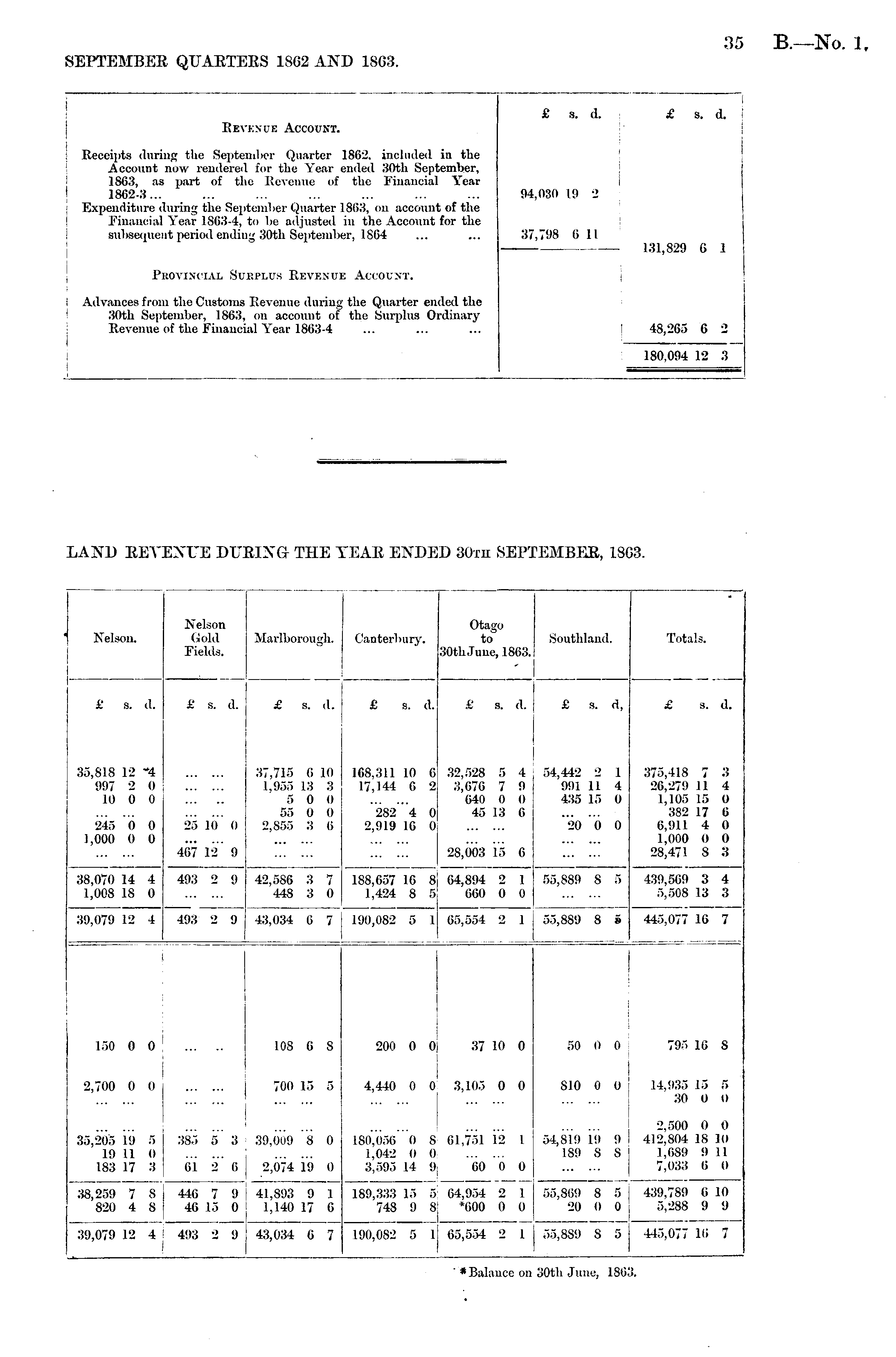 SEPTEMBER QUARTERS 1SG2 AND 1SG3. Revenue Account. Receipts during the September Quarter 1862, included in the Account now rendered for the Year ended 30th September, 1863, as part of the Revenue of the Financial Year 1862-3 ... Expenditure during the September Quarter 1S03, on account of the Financial Year 1863-4, to be adjusted in the Account for the subsequent period ending 30th September, 1S64 £ s. d. £ s. d. 94,030 19 2 37,798 6 II 131,829 6 1 Provincial Surplus Revenue Account. i Advances from the Customs Revenue during the Quarter ended the 30th September, 1863, on account of the Surplus Ordinary Revenue of the Financial Year 1863-4 48,265 6 2 180,094 12 3