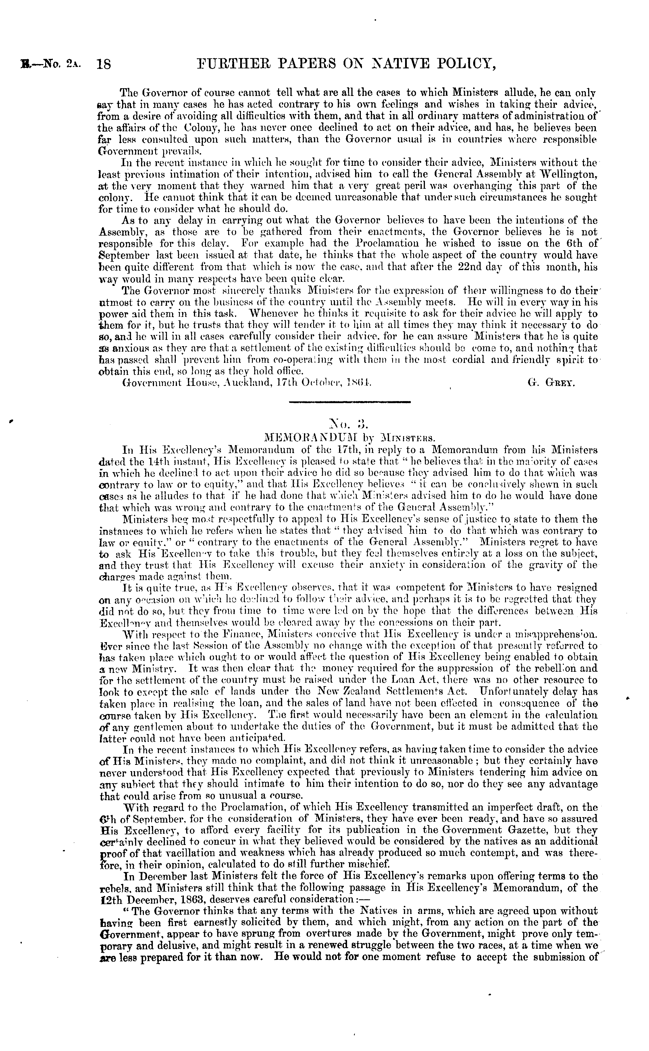 No. 3. MEMORANDUM by Ministers. In His Excellency's Memorandum of the 17th, in reply to a Memorandum from his Ministers dated the 14th instant. His Excellency is pleased to state that "he believes that in the majority of ca - in which he declined to act upon their advice he did so because they advised him to do that which was contrary to law or to equity," and that His Excellency believes " it can be conclusively shewn in such oases as he alludes to that if he had done that which Ministers advised him to do he would have doue that which was wrong and contrary to the enactments of the General Assembly.'' Ministers beg most respectfully to appeal to His Excellency's sense of justice to state to them the instances to which he refers when he states that " they advised him to do that which was contrary to law or equity," or ': contrary to the enactments of the General Assembly." Ministers regret to have to ask His Excellency to take this trouble, but they feel themselves entirely at a loss on the subject, and they trust that His Excellency will excuse their anxiety in consideration of the gravity of the charges made against them. Ifc is quite true, as His Excellency observe:-, that ii was competent for Ministers to have resigned on any occasion on which be declined to follow l'i lir a Ivice, and perhaps it is to be regretted that they did not do so, but they from time to time wore Led on by the hope that the differences betwesn His Excell^ivy and themselves would be cleared away by the concessions on their part. "With respect to the Finance, Miniate ive that His Excellency is under a misapprehension. Ever since the last Session of the Assembly no change with the exception of that presontly referred to lias taken place which ought to or would affect the question of His Excellency being enabled to obtain a new Ministry. It was then clear that the money required for the suppression of the rebellion and for the settlement of the country must be raised under the Loan Act, there was no other resource to look to except the sale of lands under the New Zealand Settlements Act. Unfortunately delay has taken place in realising the loan, and the sales of land nave not been effected in consequence of the course taken by His Excellency. The first would necessarily have been an element in the calculation of any gentlemen about to undertake the duties of the Government, but it must be admitted that the latter could not have been anticipated. In the recent instances to which His Excellency refers, as having taken time to consider the advice of His Ministers, they made no complaint, and did not think it unreasonable ; but they certainly have never understood that His Excellency expected that previously to Ministers tendering him advice on any subicct that they should intimate to him their intention to do so, nor do they see any advantage that could arise from so unusual a course. With resrard to the Proclamation, of which His Excellency transmitted an imperfect draft, on the GHi of September, for the consideration of Ministers, they have ever been ready, and have so assured His Excellency, to afford every facility for its publication in the Government Gazette, but they cer^'nlv declined to concur in what they believed would be considered by the natives as an additional, proof of that vacillation and weakness which has already produced so much contempt, and was therelore, in their opinion, calculated to do still further mischief. In December last Ministers felt the force of His Excellency's remarks upon offering terms to the rebels, and Ministers still think that the following passage in His Excellency's Memorandum, of the f 2th December, ISC3, deserves careful consideration: — " The Governor thinks that any terms with the Natives in arms, which are agreed upon without having been first earnestly solicited by them, and which might, from any action on the part of the Government, appear to have sprung from overtures made by the Government, might prove only temporary and delusive, and might result in a renewed struggle between the two races, at a time when we are less prepared for it than now. He would not for one moment refuse to accept the submission of