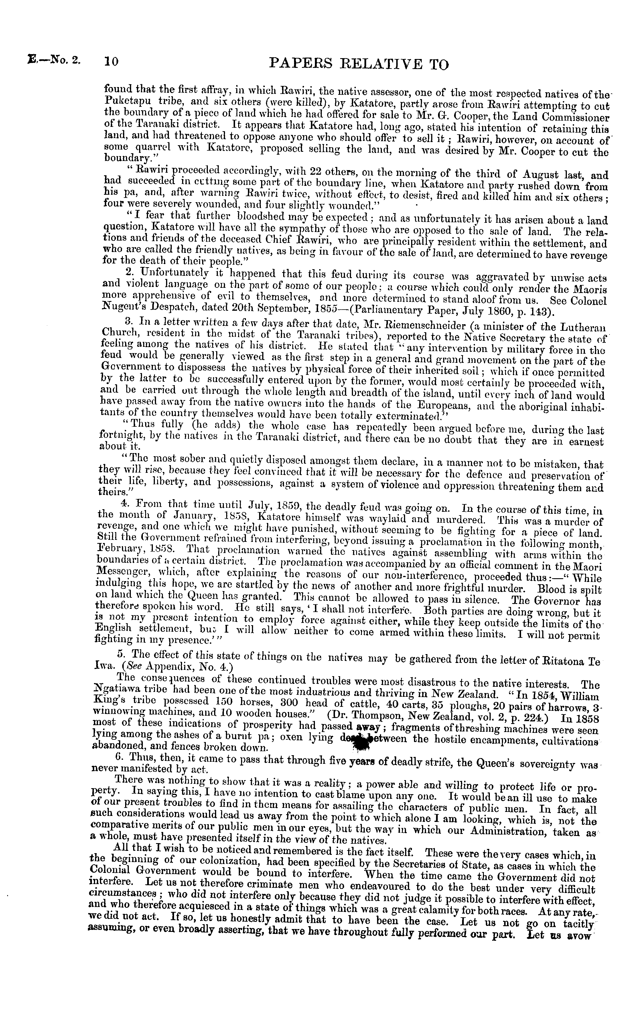 found that the first affray, in which Bawiri, the native assessor, one of the most respected natives of the Fuketapu tribe, and six others (were killed), by Katatore, partly arose from Eawiri attempting to cut the boundary of a piece of land which he had offered for sale to Mr. Gh Cooper, the Land Commissioner of the laranata district. It appears that Katatore had, long ago, stated his intention of retaining this land, and had threatened to oppose anyone who should offer to sell it ; Eawiri, however, on account of some quarrel with Katatore, proposed selling the land, and was desired by Mr. Cooper to cut the boundary. J v " Eawiri proceeded accordingly, with 22 others, on the morning of the third of August last and had succeeded m cutting some part of the boundary line, when Katatore and party rushed down from his pa, and, after warning Eawiri twice, without effect, to desist, fired and killed him and six others • lour were severely wounded, and four slightly wounded." "I fear that further bloodshed may be expected , and as unfortunately it has arisen about a land question Katatore will have all the sympathy of those who are opposed to the sale of land The relations and friends of the deceased Chief Eawiri, who are principally resident within the settlement and for°thTdS,f^p n5e!^ "' " bei"g " foV0Ur '"'tlK' Sa'° °f land ' ar° determi-dt0 1— --nge 2. Unfortunately it happened that this feud during its course was aggravated by unwise acts and violent language on the part of some of our people; a course which could only render the Maoris more apprehensive of evil to themselves, and more determined to stand aloof from us. Seo Colonel Nugent s Despatch, dated 20th September, 1855—(Parliamentary Paper, July 1860, p. 143). 8. In a letter written a few days after that date, Mr. Eiemenschneider (a minister of the Lutheran Church, resident in the midst of the Taranaki tribes), reported to the Native Secretary the state of feeling among the natives of his district. He stated that " any intervention by military force i,the feud would be generally viewed as the first step in a general and grand movement on the part of the Government to dispossess the natives by physical force of their inherited soil; which if once permitted by the latter to be successfully entered upon by the former, would most certainly be proceeded with and be earned out through the whole length and breadth of the island, until every inch of land would have passed away from the native owners into the hands of the Europeans, and the aboriginal inhabitants of the country themselves would have been totally exterminated *' '.' £ hu? fu% (he ad.ds) the whole case has repeatedly been argued before me, during the last aboutt Taranak, district, and there can be no doubt that they are in earnest " T'lc .mo!* sober a, lld <luie% disposed amongst them declare, in a manner not to bo mistaken that they will rise, because they feel convinced that it will be necessary for the defence and preservation of theirs" possessions, against a system of violence and oppression threatening them and 4. From that time until July, 1859, the deadly feud was going on. In the course of this time in the month ot January, 1858, Katatore himself was waylaid and murdered. This was a murder of ™enge,and one which we : might have punished, without seeming to be fighting for a piece of land Kbr £v 1S-T" 1 rf f™? l'T bterferi^. "*»*& - proclamation m the following moS' JB-ebruarjr, 1858. That proclamation warned the natives against assembling with arms within the boundaries of b certain district The proclamation was accompanied by an official connnent in the M^ri Messenger which, alter explaining the reasons of our non-interference, proceeded thus —« WhUo mdulguig this hope we are startled by the news of another and more frightful murder. Blood is spilt on land which the Queen has granted. This cannot be allowed to pass in silence. The Governor has therefore spoken his word He still says, ' I shall not interfere. Both parlies are doing wrong fcutit Endi hTetile'S- "wT Si k? T™* dther ' ffl ** k4 ««* SB of the fighting in my present" °" "■*** *° W>m° within these Wite. I will not permit 5- Tlie effect of this state of things on the natives may be gathered from the letter of Eitatona Te aw it. ji\.j)pcn(iiXj IN o. 4.) KvJil 7T T'\T °f ±hef u C01ltinued trmM™ were most disastrous to the native interests. The ISgat uroa tribe had been one of the most industrious and thriving in New Zealand " In 1854 Williim Kings tribe possessed 150 horses, 300 head of cattle, 40 carts, 35 ploughs 20 pairs ofNarrows' S winnowmg machines, and 10 wooden houses." (Dr. Thompson, New Zealand; volt p 224 )/ u 1858 K * llnTth^T T K° f P r°8perity ''a; 1 ■ paSSI d aWa>'; fra"mentH °f thrashing machine.s were seen 5 *+»^ hostile encainpment, cultivations Dmr^SSft^ 8 t0 PaSS that thr°Ugh five year8 °f d0adl-V Strife 'the Quecn'8 sovereignty was Thc|° WM. nothing to show that it was a reality ; a power able and willin- to protect life or nro perty. In saying this, I have no intention to cast blame upon any one. It would be«4 ill u e to mile of our present troubles to find in then means for assailing the characters of public men In focTaU such considerations wonld lead us away from the point to which alone I am look n' winch t not the comparative merit, of our public men in our eyes/but the way in which our Administeation 'taken as a whole, must have presented itself in the view of the natii ee." nitration, taKen as All that I wish to be noticed and remembered is the fact itself. These were the very cases which in the beginning of our colonization, had been specified by the .Secretaries of State a l^le* t which the SIS Llus Uno IT J b0U"d. t0 WheU thG tim° ™ th0 Government dW no? mteitoie. Let us not therefore criminate men who endeavoured to do the best under very difficult c rcumstauces ; who did not interfere only because they did not judge it possible t