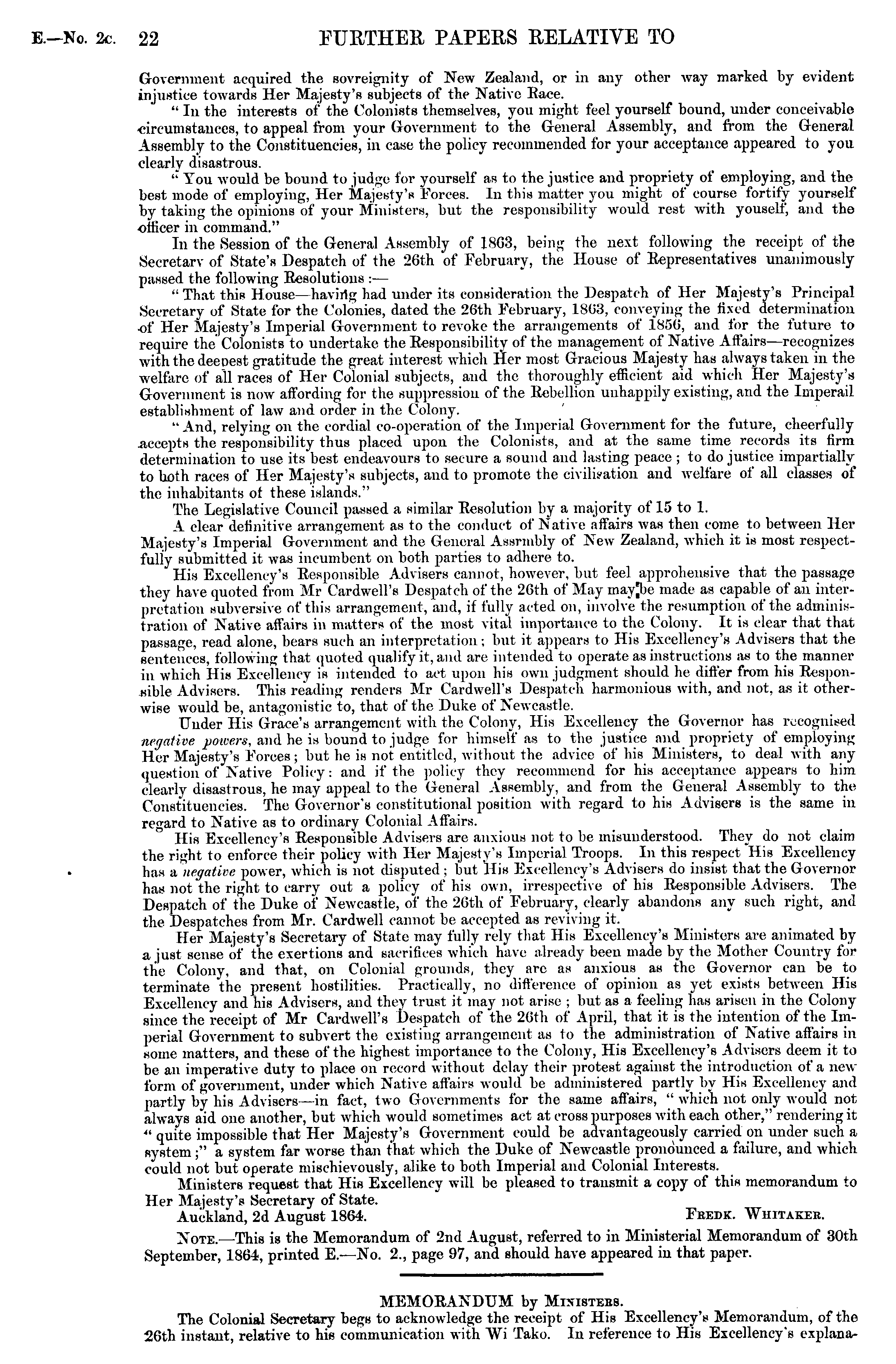 Government acquired the sovreignity of New Zealand, or in any other way marked by evident injustice towards Her Majesty's subjects of the Native Race. " In the interests of the Colonists themselves, you might feel yourself bound, under conceivable circumstances, to appeal from your Government to the General Assembly, and from the General Assembly to the Constituencies, in case the policy recommended for your acceptance appeared to you clearly disastrous. " You would be bound to judge for yourself as to the justice and propriety of employing, and the best mode of employing, Her Majesty's Eorces. In this matter you might of course fortify yourself by taking the opinions of your Ministers, but the responsibility would rest with youself, and the officer in command." In the Session of the General Assembly of 1863, being tho next following the receipt of the Secretary of State's Despatch of the 26th of Eebruary, the House of Representatives unanimously passed the following Resolutions : — "That this House —haviitg had under its consideration the Despatch of Her Majesty's Principal Secretary of State for the Colonies, dated the 26th Eebruary, 1863, conveying the fixed determination of Her Majesty's Imperial Government to revoke the arrangements of 1856, and for the future to require the Colonists to undertake the Responsibility of the management of Native Affairs —recognizes with the deepest gratitude the great interest which Her most Gracious Majesty has always taken in the welfare of all races of Her Colonial subjects, and the thoroughly efficient aid which Her Majesty's Government is now affording for the suppression of the Rebellion unhappily existing, and the Imperail establishment of law and order in the Colony. '■ And, relying on the cordial co-operation of the Imperial Government for the future, cheerfully -accepts the responsibility thus placed upon the Colonists, and at the same time records its firm determination to use its best endeavours to secure a sound and lasting peace ; to do justice impartially to both races of Her Majesty's subjects, and to promote the chili, ation and welfare of all classes of the inhabitants of these islands." The Legislative Council passed a similar Resolution by a majority of 15 to 1. A clear definitive arrangement as to the conduct of Native affairs was then come to between Her Majesty's Imperial Government and the General Assrmbly of New Zealand, which it is most respectfully submitted it was incumbent on both parties to adhere to. His Excellency's Responsible Advisers cannot, however, but feel apprehensive that the passage they have quoted from Mr Cardwell's Despatch of the 26th of May mayjbe made as capable of an interpretation subversive of this arrangement, and, if fully acted on, involve the resumption of the administration of Native affairs in matters of the most vital importance to the Colony. It is clear that that passage, read alone, bears such an interpretation; but it appears to His Excellency's Advisers that the sentences, following that quoted qualify it,and are intended to operate as instructions as to the manner in which His Excellency is intended to act upon his own judgment should he differ from his Responsible Advisers. This reading renders Mr Cardwell's Despatch harmonious with, and not. as it otherwise would be, antagonistic to, that of the Duke of Newcastle. Under His Grace's arrangement with the Colony, His Excellency the Governor has recognised negative powers, and he is bound to judge for himself as to the justice and propriety of employing Her Majesty's Eorces; but he is not entitled, without the advice of his Ministers, to deal with any question of Native Policy: and if the policy they recommend for his acceptance appears to him clearly disastrous, he may appeal to the General Assembly, and from the General Assembly to the Constituencies. The Governor's constitutional position with regard to his Advisers is the same in regard to Native as to ordinary Colonial Affairs. His Excellency's Responsible Advisers are anxious not to be misunderstood. They do not claim the right to enforce their policy with Her Majesty's Imperial Troops. In this respect His Excellency has -a negative power, which is not disputed; but His Excellency's Advisers do insist that the Governor has not the right to carry out a policy of his own, irrespective of his Responsible Advisers. The Despatch of the Duke of Newcastle, of the 26th of Eebruary, clearly abandons any such right, and the Despatches from Mr. Cardwell cannot be accepted as reviving it. Her Majesty's Secretary of State may fully rely that His Excellency's Ministers are animated by a just sense of the exertions and sacrifices which have already been made by the Mother Country for the Colony, and that, on Colonial grounds, they are as anxious as the Governor can be to terminate "the present hostilities. Practically, no difference of opinion as yet exists between His Excellency and his Advisers, and they trust it may not arise ; but as a feeling has arisen in the Colony since the receipt of Mr Cardwell's Despatch of the 26th of April, that it is the intention of the Imperial Government to subvert the existing arrangement as to the administration of Native affairs in some matters, and these of the highest importance to the Colony, His Excellency's Advisers deem it to be an imperative duty to place on record without delay their protest against the introduction of a newform of government, under which Native affairs would be administered partly by His Excellency and partly by his Advisers —in fact, two Governments for the same affairs, " which not only would not always aid one another, but which would sometimes act at cross purposes with each other," rendering it " quite impossible that Her Majesty's Government could be advantageously carried on under such a system;" a system far worse than that which the Duke of Newcastle pronounced a failure, and which could not but operate mischievously, a