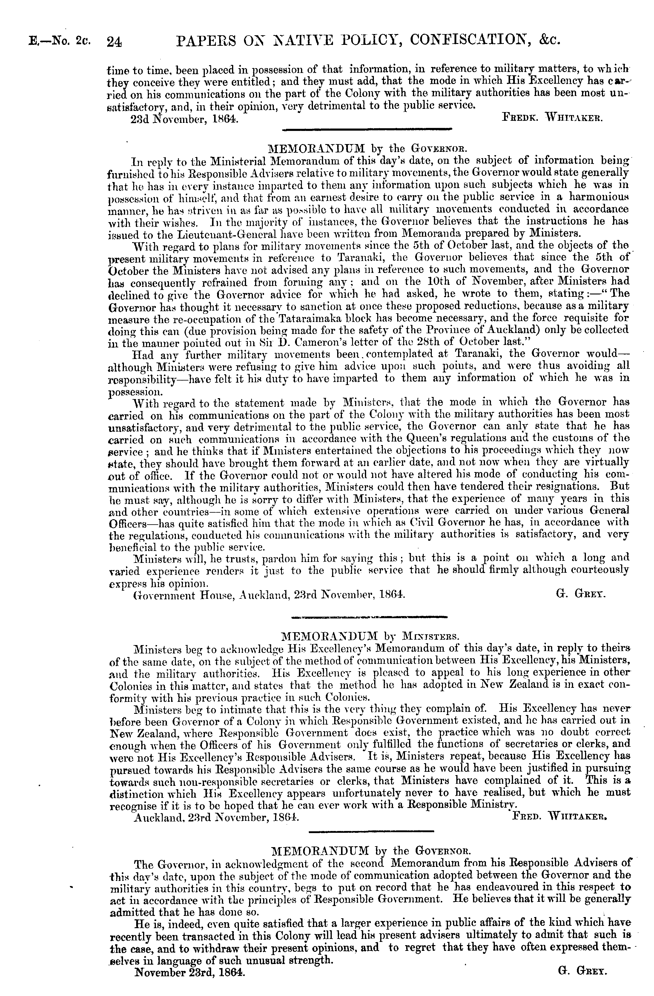 time to time, been placed in possession of that information, in reference to military matters, to which they conceive they were entitled; and they must add, that the mode in which His Excellency has carried OO his communications on the part of the Colony with the military authorities has been most unsatisfactory, and, in their opinion, very detrimental to the public service. 23d November, 1864. Fkedk. Wii'taker. MEMORANDUM by the Go_TH__ob. In reply to the Ministerial Memorandum of this day's date, on the subject of information being furnished to his Responsible Advisers relative to military movements, the Governor would state generally that he has in every instance imparled to them any information upon such subjects which he was in possession of himself, and thai from an earnest desire to carry on the public service in a harmonious manner, he has otriven in as far as possible to have all military movements conducted in accordance with their wishes, tn the majority of instances, the Governor believes that the instructions he has issued to the Lieutenant-Genera] have been written from Memoranda prepared by Ministers. With regard to plans for military movements since the sth of October last, and the objects of the present military movements in reference to Taranaki, the Governor believes that since the Sth of October the Ministers have not advised any plans in reference to such movements, and the Governor has consequently refrained from forming* any; and on the 10th of November, after Ministers had declined to give the Governor advice for which he had asked, he wrote to them, stating: —"The Governor lias thought it necessary to sanction at once these proposed reductions, because as a military measure the re-occupation of the Tataraimaka block has become necessary, and the force requisite for doing this can (due provision being made for the safety of the Province of Auckland) only be collected in the manner pointed out in Nil L). Cameron's letter of the 28th of October last." Had any further military movements been.contemplated at Taranaki, the Governor would — although Ministers were refusing to give him advice upon such points, and were thus avoiding all responsibility —have felt it his duty to have imparted to them any information of which he was in possession. With regard to the statement made by Ministers, that the mode in which the Governor has carried on his communications on the part'of the Colony with the military- authorities has been most unsatisfactory, and very detrimental to the public service, the Governor can anly state that he has carried on such communications in accordance with the Queen's regulations and the customs of the service ; and he thinks that if Ministers entertained the objections to his proceedings which they now state, they should have brought them forward at an earlier date, and not now when they arc virtually OUt of office. If the Governor could not or would not have altered his mode of conducting his communications with the military authorities, Ministers could then have tendered their resignations. But be must Bay, although he is sorry to differ with Ministers, that the experience of many years, in this and other countries—in some 01 which extensive operations were carried on under various General Officers —has quite satisfied him that the mode in which as Civil Governor he has, in accordance with the regulations, conducted his communications with the military authorities is satisfactory, and very beneficial to the public service. Ministers will, he trusts, pardon him for saving this; but this is a point on which a long and varied experience renders it just to the public service, that he should firmly although courteously express his opinion. Government House, Auckland, 23rd November, 1864. G. Gret. MEMORANDUM by Ministers. Ministers beg to acknowledge His Excellency's Memorandum of this day's date, in reply to theirs of the same date, ou the subject of the method of communication between His Excellency, his Ministers, and the military authorities. His Excellency is pleased to appeal to his long experience in other Colonies in this'matter, and slates that the method he has adopted in New Zealand is in exact conformity with his previous practice in such Colonies. Ministers beg to intimate that this is the very thing they complain of. His Excellency has never before been Governor of a Colony in which Responsible Government existed, and he has carried out in New Zealand, where Responsible Government does exist, the practice which was no doubt correct, enough when the Officers of his Government only fulfilled the functions of secretaries or clerks, and were not His Excellency's B. sponsible Advisers. It is, Ministers repeat, because His Excellency has pursued towards his Responsible Advisers the same course as he would have been justified in pursuing towards such non-responsible secretaries or clerks, that Ministers have complained of it. This is a distinction which His Excellency appears unfortunately never to have realised, but which he must recognise if it is to be hoped that" he can ever work with a Responsible Ministry. Auckland. 23rd November, 1864. Frkd. Whitaker. MEMORANDUM by the Governor. The Governor, in acknowledgment of the second Memorandum from his Responsible Advisers of this day's date, upon the subject of the mode of communication adopted between the Governor and the military authorities in this country, begs to put on record that he has endeavoured in this respect to act in accordance wit Ii the principles of Responsible Government. He believes that it will be generally admitted that he has done so. He is, indeed, even quite satisfied that a larger experience in public affairs of the kind which have recently been transacted in this Colony will lead his present advisers ultimately to admit that such is the case, and to withdraw their present opinions, and to regret that they have often expressed themselves in language of such unusu