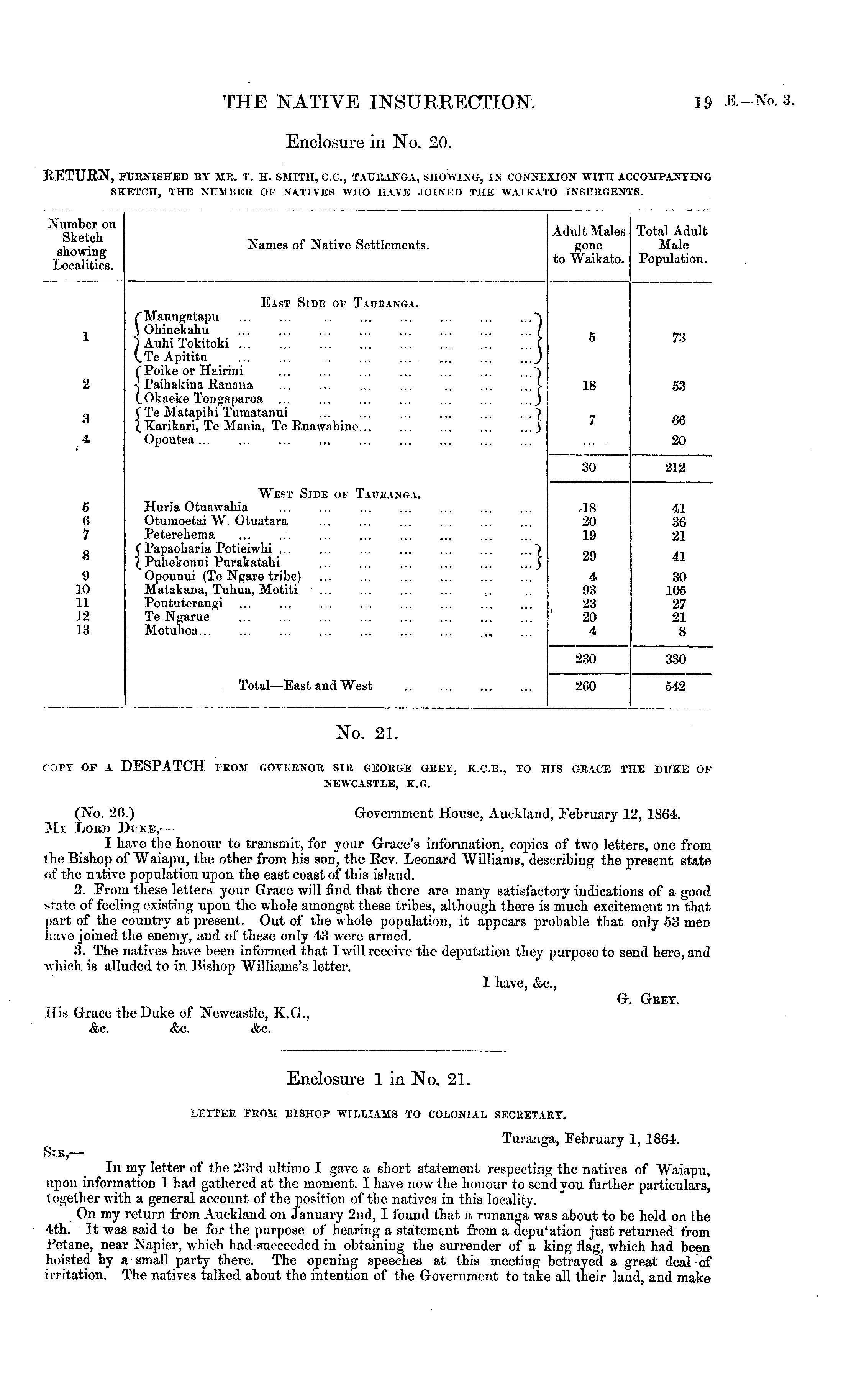 No. 21. corx of a DESPATCH fbom goveenob sik geobge grey, k.c.b., to ms geace the duke of NEWCASTLE, K.G. (_N~o. 20.) Government House, Auckland, February 12, 1864. Mi Loud Duke, — I have the honour to transmit, for your Grace's information, copies of two letters, one from tlie Bishop of Waiapu, the other from his son, the Eev. Leonard Williams, describing the present state of the nitive population upon the east coast of this island. 2. From these letters your Grace will find that there are many satisfactory indications of a good state of feeling existing upon the whole amongst these tribes, although there is much excitement in that part of the country at present. Out of the whole population, it appears probable that only 53 men have joined the enemy, and of these only 43 were armed. 3. The natives have been informed that I will receive the; deputation they purpose to send here, and which is alluded to in Bishop Williams's letter. I have, &c, G. Geet. His Grace the Duke of Newcastle, K.G., Ac. &c. &c. Enclosure 1 in No. 21. LETTEK FEOlt 11TSH0P WILLIAMS TO COLONIAL SECKETAEY. Turanga, February 1, 1864. Bat; — In my letter of the 23rd ultimo I gave a short statement respecting the natives of Waiapu, upon information I. had gathered at tho moment. I have now the honour to send you further particulars, together with a geaertJ account of the position of the natives in this locality. On my return irom Auckland on January 2nd, I found that a runanga was about to be held on the 4th. It was said to be for the purpose of hearing a statement from a depu'ation just returned from Pctane, near Napier, which had succeeded in obtaining the surrender of a king flag, which had been hoisted by a small party there. The opening speeches at this meeting betrayed a great deal of irritation. The natives talked about the intention of the Government to take all their land, and make