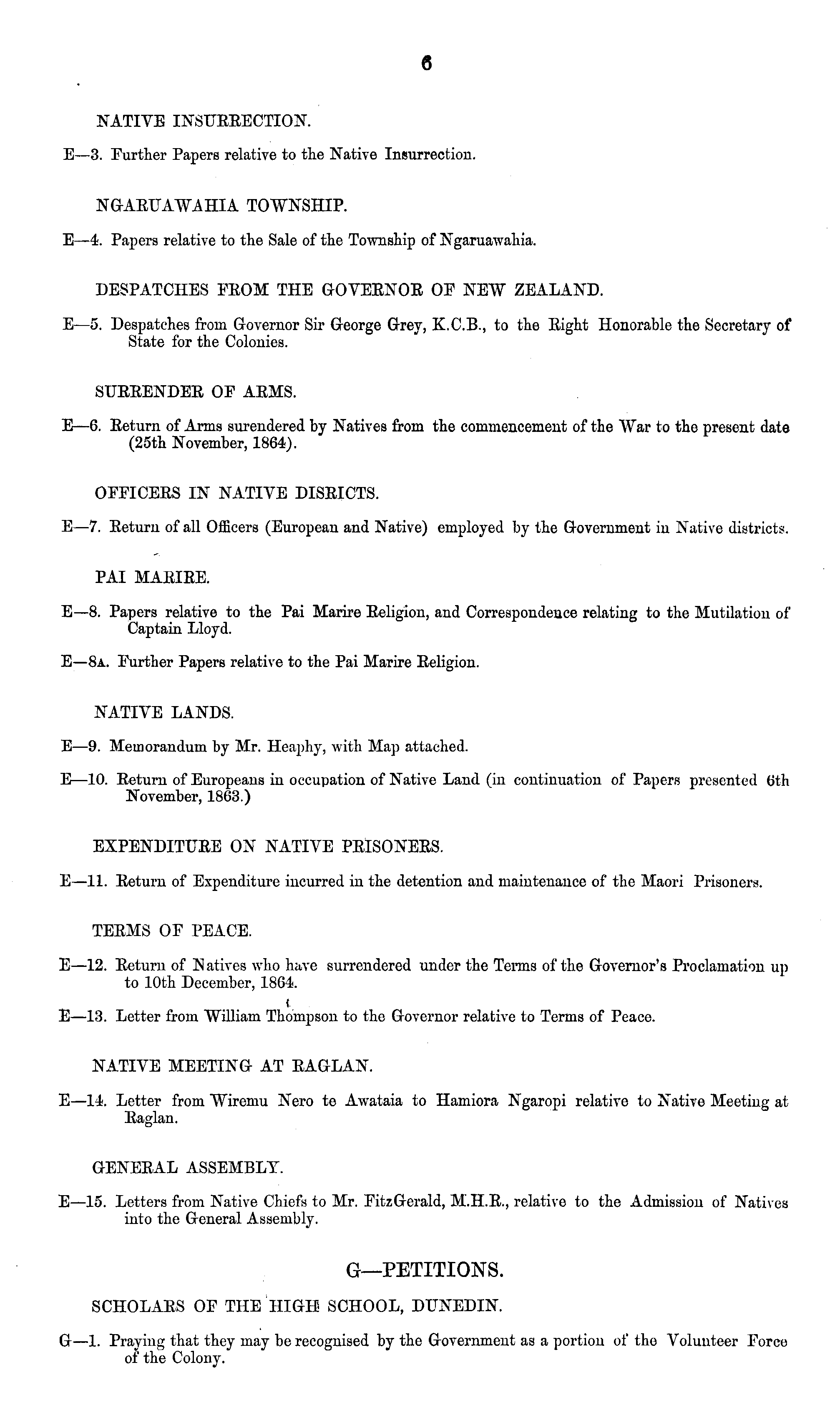 NATIVE INSURRECTION. E—3. Further Papers relative to the Native Insurrection. NGARUAWAHIA TOWNSHIP. E—4. Papers relative to the Sale of the Township of Ngaruawahia. DESPATCHES FROM THE GOVERNOR OF NEW ZEALAND. E —s. Despatches from Governor Sir George Grey, X.C.8., to the Right Honorable the Secretary of State for the Colonies. SURRENDER OF ARMS. E —6. Return of Arms surendered by Natives from the commencement of the War to the present date (25th November, 1864). OFFICERS IN NATIVE DISRICTS. E —7. Return of all Officers (European and Native) employed by the Government in Native districts. PAI MARIRE. E —B. Papers relative to the Pai Marire Religion, and Correspondence relating to the Mutilation of Captain Lloyd. E—Ba. Further Papers relative to the Pai Marire Religion. NATIVE LANDS. E —9. Memorandum by Mr. Heaphy, with Map attached. E —lo. Return of Europeans in occupation of Native Land (in continuation of Papers presented 6th November, 1863.) EXPENDITURE ON NATIVE PRISONERS. E—ll. Return of Expenditure incurred in the detention and maintenance of the Maori Prisoners. TERMS OF PEACE. E—l2. Return of Natives who have surrendered under the Terms of the Governor's Proclamation up to 10th December, 1864. i E—l3. Letter from William Thompson to the Governor relative to Terms of Peace. NATIVE MEETING AT RAGLAN. E—l4. Letter from Wiremu Nero te Awataia to Hamiora Ngaropi relative to Native Meeting at Raglan. GENERAL ASSEMBLY. E—ls. Letters from Native Chiefs to Mr. FitzGerald, M.H.R., relative to the Admission of Natives into the General Assembly. G—PETITIONS. SCHOLARS OF THE HIGH SCHOOL, DUNEDIN. G—l. Praying that they may be recognised by the Government as a portion of the Volunteer Force of the Colony.