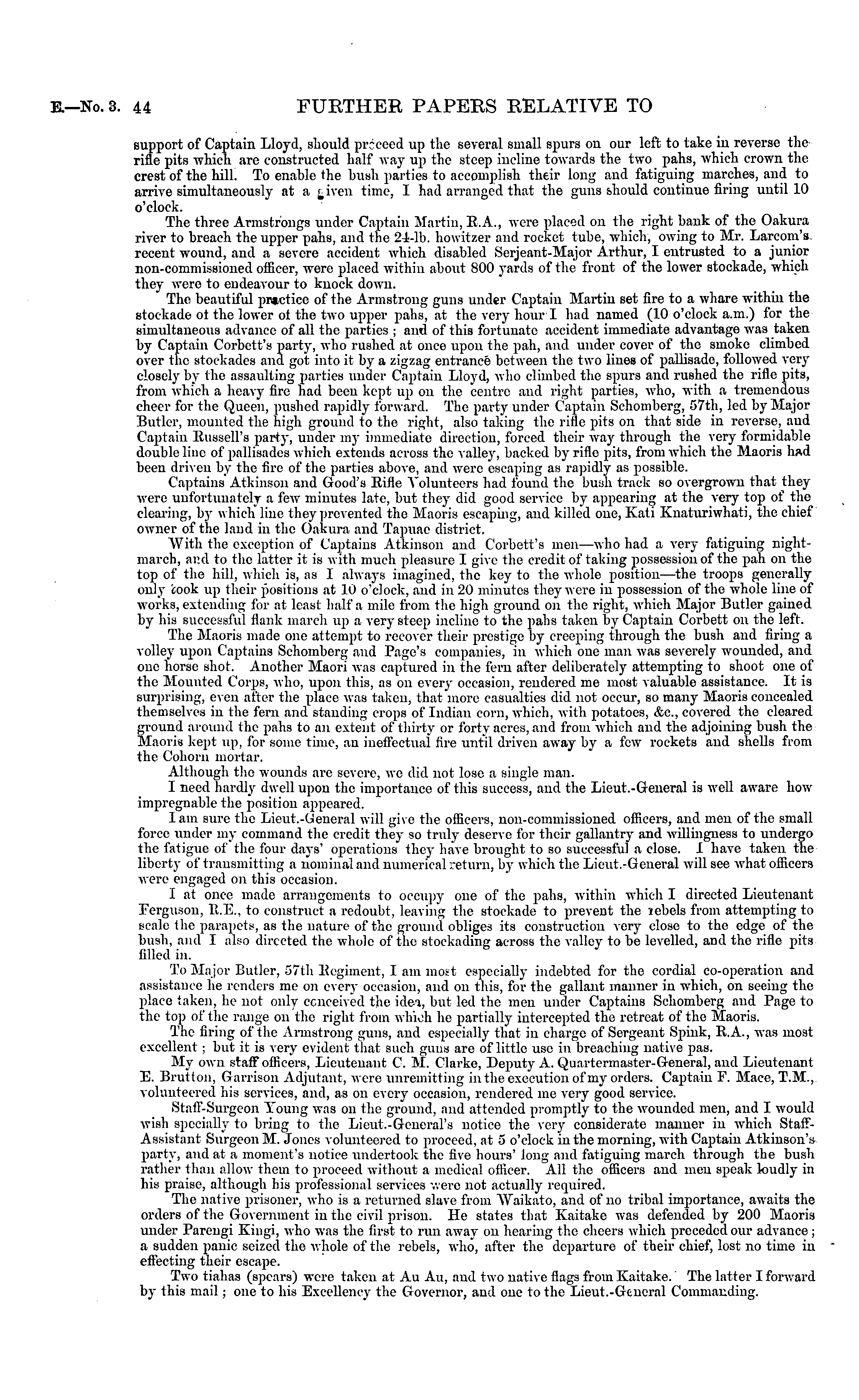 support of Captain Lloyd, should pi-eeed up the several small spurs on our left to take in reverse the rifle pits which are constructed half way up the steep incline towards the two pahs, Which crown the crest of the hill. To enable the bush parties to accomplish their long and fatiguing marches, and to arrive simultaneously at a time, I had arranged that the guns should continue firing until 10 o'clock. The three Armstrongs under Captain Martin, E.A., were placed on the right bank of the Oakura river to breach the upper pahs, and the 24-lb. howitzer and rocket tube, which, owing to Mr. Larcom's. recent wound, and a severe accident which disabled Serjeant-Major Arthur, I entrusted to a junior non-commissioned officer, were placed within about 800 yards of the front of the lower stockade, which they were to endeavour to knock down. The beautiful practice of the Armstrong guns under Captain Martin set fire to a whare within the stockade ot the lower ot the two upper pahs, at the very hour I had named (10 o'clock a.m.) for the simultaneous advance of all the parties ; and of this fortunate accident immediate advantage was taken by Captain Corbett's party, who rushed at once upon the pah, and under cover of tho smoke climbed over the stockades and got into it by a zigzag entrance between the two lines of pallisade, followed very closely by the assaulting parties under Captain Lloyd, who climbed the spurs and rushed the rifle pits, from which a heavy fire had been kept up on the centre and right parties, who, with a tremendous cheer for the Queen, pushed rapidly forward. The party under Captain Sehomberg, 57th, led by Major Butler, mounted the high ground to the right, also taking the rifle pits on that side in reverse, aud Captain Russell's party, under my immediate direction, forced their way through the very formidable double line of pallisades which extends across the valley, backed by rifle pits, from which the Maoris had been driven by the fire of the parties above, and were escaping as rapidly as possible. Captains Atkinson and Good's Rifle Volunteers had found the bush track so overgrown that they were unfortunately a few minutes late, but they did good service by appearing at the very top of the clearing, by which line they prevented the Maoris escaping, and killed one, Kati Knaturiwhati, the chief owner of the land in the Oakura and Tapuae district. With the exception of Captains Atkinson and Corbett's men —who had a very fatiguing nightmarch, and to the latter it is with much pleasure I give the credit of taking possession of the pah on the top of the hill, which is, as I always imagined, the key to the whole position —the troops generally only iook up their positions at 10 o'clock, and in 20 minutes they were in possession of the whole line of works, extending for at least half a mile from the high ground on the right, which Major Butler gained by his successful flank march up a very steep incline to the pahs taken by Captain Corbett on the left. The Maoris made one attempt to recover tlieir prestige by creeping through the bush and firing a volley upon Captains Sehomberg and Page's companies, in which one man was severely wounded, and one horse shot. Another Maori was captured in the fern after deliberately attempting to shoot one of the Mounted Corps, who, upon this, as on every occasion, rendered me most valuable assistance. It is surprising, even after the place was taken, that more casualties did not occur, so many Maoris concealed themselves in the fern and standing crops of Indian corn, which, with potatoes, &c, covered tho cleared ground around the pahs to an extent of thirty or forty acres, and from which and the adjoining bush the Maoris kept up, for some time, an ineffectual fire until driven away by a few rockets and shells from the Cohorn mortar. Although tho wounds are severe, we did not lose a single man. I need hardly dwell upou the importance of this success, and the Lieut.-General is well aware how impregnable the position appeared. lain sure the Lieut.-General will give the officers, non-commissioned officers, and men of the small force under my command the credit they so truly deserve for their gallantry and willingness to undergo the fatigue of the four days' operations they have brought to so successful a close. I have taken the liberty of transmitting a nominal and numerical return, by which the Lieut.-General will see what officers were engaged on this occasion. I at once made arrangements to occupy one of tho pahs, within which I directed Lieutenant Ferguson, li.E., to construct a redoubt, leaving the stockade to prevent the icbels from attempting to scale the parapets, as the nature of the ground obliges its construction very close to the edge of the bush, and I also directed the whole of the stockading across the valley to be levelled, and the rifle pits filled in. To Major Butler, 57th Eegiment, I am most especially indebted for the cordial co-operation and assistance he renders me on every occasion, and on this, for the gallant manner in which, on seeing the place taken, he not only conceived the idea, but led the men under Captains Sehomberg and Page to the top of the range on the right from which he partially intercepted the retreat of the Maoris. The firing of the Armstrong guns, and especially that in charge of Sergeant Spink, E.A., was most excellent ; but it is very evident that such guns are of little use in breaching native pas. My own staff officers, Lieutenant C. M. Clarke, Deputy A. Quartermaster-General, aud Lieutenant E. Brutton, Garrison Adjutant, were unremitting in the execution of my orders. Captaiu F. Mace, T.M., volunteered his services, and, as on every occasion, rendered mo very good service. Stafl'-Surgeon Young was on tlie ground, and attended promptly to the wounded men, and I would wish specially to bring to the Lieut.-General's notice the very considerate maimer in which StaffAssistant Surgeon M. Jones volunteered to proce