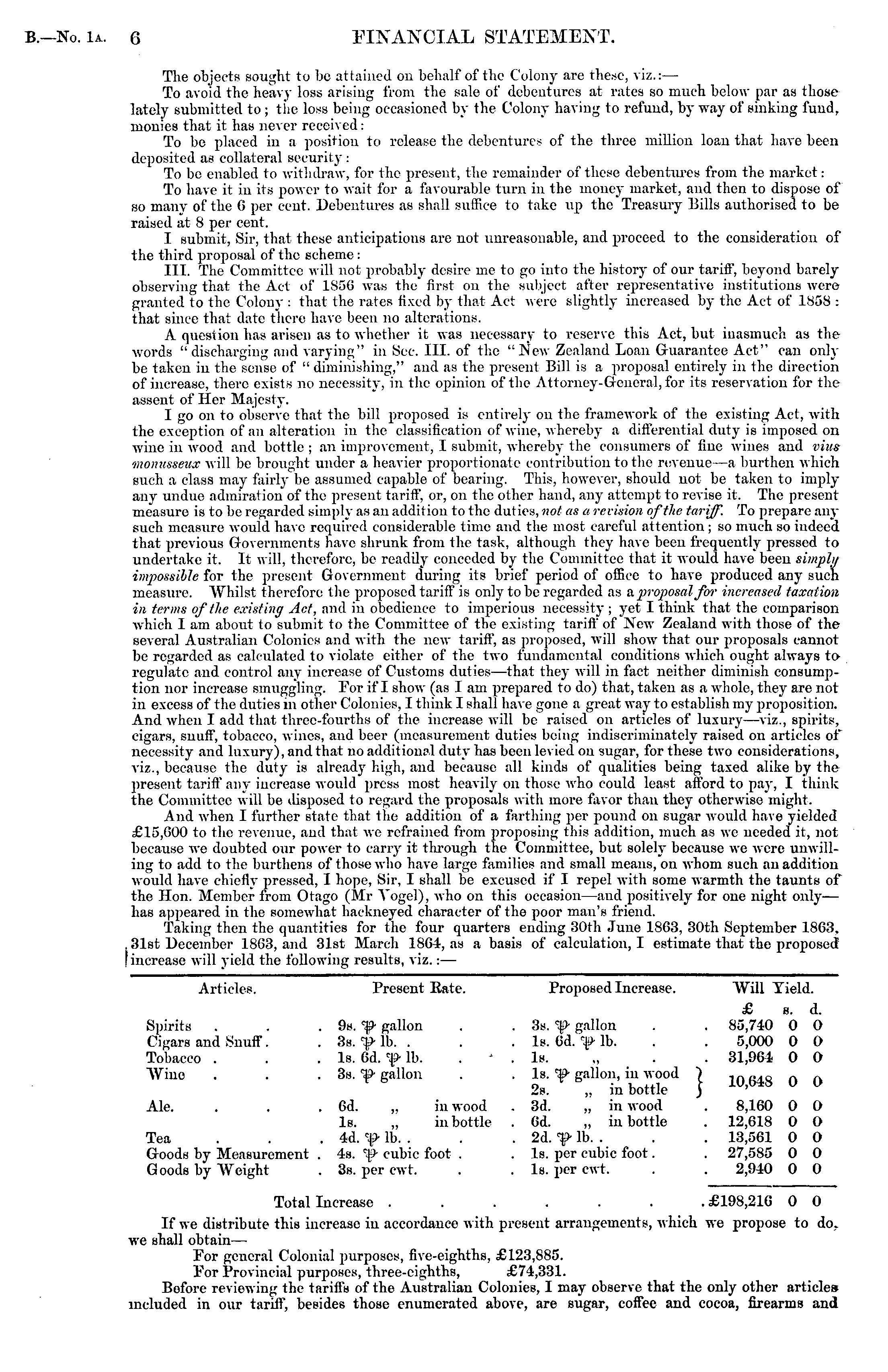 The objects sought to bo attained on behalf of the Colony are these, viz.:— To avoid the heavy loss arising from the sale of debentures at rates so much below par as those lately submitted to; the loss being occasioned by the Colony having to refund, by way of sinking fund, monies that it has never received: To be placed in a position to release the debentures of the three million loan that have been deposited as collateral security : To be enabled to withdraw, for the present, the remainder of these debentures from the market: To have it in its power to wait for a favourable turn in the money market, and then to dispose of so many of the 6 per cent. Debentures as shall suffice to take up the Treasury Bills authorised to be raised at 8 per cent. I submit, Sir, thai these anticipations are not unreasonable, and proceed to the consideration of the third proposal of the scheme : III. The Committee will not probably desire me to go into the history of our tariff, beyond barely observing that the Act of 1850 was the first on the subject after representative institutions were granted to the Colony : that the rates fixed by that Act were slightly increased by the Act of 1858 : that since that date there have been no alterations. A question has arisen as to whether it was necessary to reserve this Act, but inasmuch as the words "discharging and varying" in Sea III. of the "New Zealand Loan Guarantee Act" can only be taken in the sense of " diminishing," and as the present Bill is a proposal entirely in the direction of increase, there exists no necessity, in the opinion of the Attorney-General, for its reservation for the assent of Her Majesty. I go on to observe that the bill proposed is entirely on the framework of the existing Act, with the exception of an alteration in the classification of wine, whereby a differential duty is imposed on wine in wood and bottle ; an improvement, I submit, whereby the consumers of fine wines and vins monusseitx will be brought under a heavier proportionate contribution to the revenue —a burthen which such a class may fairly be assumed capable of bearing. This, however, should not be taken to imply any undue admiration of the present tariff, or, on the other hand, any attempt to revise it. The present measure is to be regarded simply as an addition to the duties, not as a revision of the tariff. To prepare any such measure would have required considerable time and the most careful attention; so much so indeed that previous Governments have shrunk from the task, although they have been frequently pressed to undertake it. It will, therefore, be readily conceded by the Committee that it would have been simply impossible for the present Government during its brief period of office to have produced any such measure. Whilst therefore the proposed tariff is only to be regarded as a proposal 1 for increased taxation in terms of the existing Act, and in obedience to imperious necessity; yet I think that the comparison which I am about to submit to the Committee of the existing tariff of New Zealand with those of the several Australian Colonies and with the new tariff, as proposed, will show that our proposals cannot be regarded as calculated to violate either of the two fundamental conditions which ought always toregulate and control any increase of Customs duties —that they will in fact neither diminish consumption nor increase smuggling. For if I show (as I am prepared to do) that, taken as a whole, they are not in excess of the duties in other Colonies, I think I shall have gone a great way to establish my proposition. And when I add that three-fourths of the increase will be raised on articles of luxury —viz., spirits, cigars, snuff, tobacco, wines, and beer (measurement duties being indiscriminately raised on articles of necessity and luxury), and that no additional duty has been levied on sugar, for these two considerations, viz., because the duty is already high, and because all kinds of qualities being taxed alike by the present tariff any increase would press most heavily on those who could least afford to pay, I think the Committee will bo disposed to regard the proposals with more favor than they otherwise might. And when I further state that the addition of a farthing per pound on sugar would have yielded £15,600 to the revenue, and that we refrained from proposing this addition, much as we needed it, not because we doubted our power to carry it through the Committee, but solely because we were unwilling to add to the burthens of those who have large families and small means, on whom such an addition would have chiefly pressed, I hope, Sir, I shall be excused if I repel with some warmth the taunts of the Hon. Member from Otago (Mr Vogel), who on this occasion—and positively for one night only — has appeared in the somewhat hackneyed character of the poor man's friend. Taking then the quantities for the four quarters ending 30th June 1863, 30th September 1863, . 31st December 1863, and 31st March 1864, as a basis of calculation, I estimate that the proposed [increase will yield the following results, viz.:— Articles. Present Eate. Proposed Increase. "Will Yield. £ b. d. Spirits . . . 9s. gallon . . 3s. ■$> gallon . . 85,740 0 O Cigars and Snuff. . 3s. lb. . . . Is. 6d. r{> lb. . . 5,000 0 O Tobacco . . .Is. 6d. C|P- lb. - . Is. ., . . 31,964 0 0 "Wine . . . 3s. U* gallon . . Is. gallon, in wood ") 1(1f . 1Q ft rt 2s. „ in bottle ) iU 'b4S U U Ale. . . . 6d. „ in wood . 3d. „ in wood . 8,160 0 O Is. „ in bottle . 6d. „ in bottle . 12,618 0 O Tea ... 4d. *$■ lb. . . . 2d. <#• lb. . . . 13,561 0 0 Goods by Measurement . 4s. <v|j> cubic foot . . Is. per cubic foot. . 27,585 0 0 Goods by Weight . 3s. per cwt. . . Is. per cwt. . . 2,940 0 0 Total Increase ...... .£198,216 0 0 If we distribute this increase in accordance with present arrangements, which we propose to do. we shall obtain— For general Colonial purposes, five-eighths