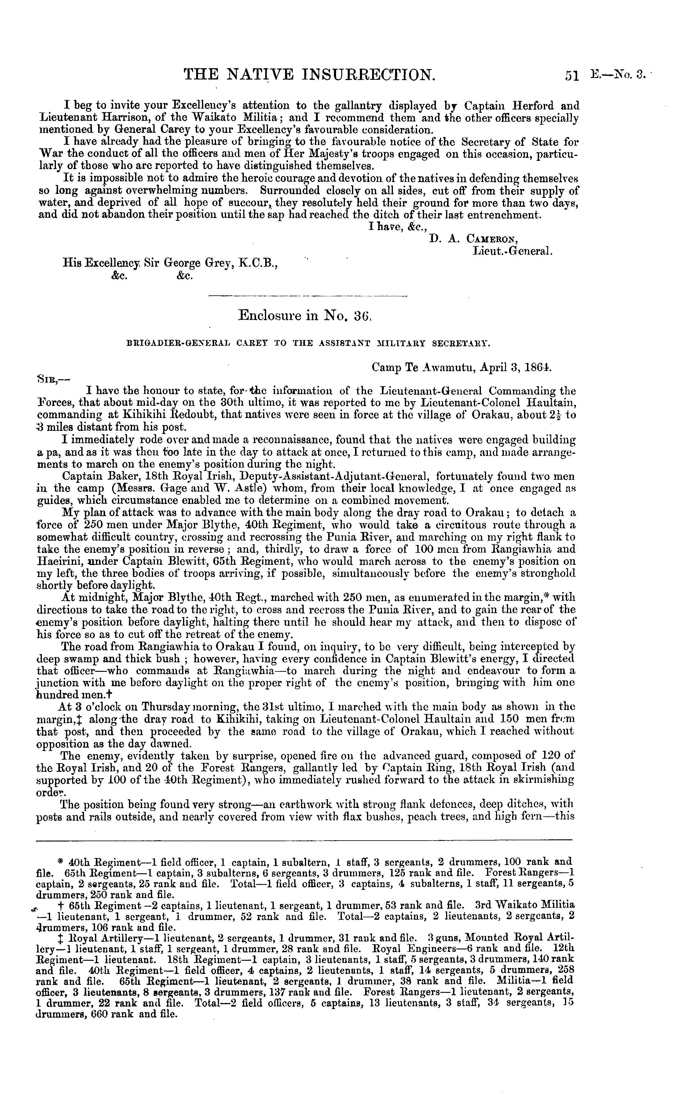I beg to invite your Excellency's attention to the gallantry displayed by Captain Hertford and Lieutenant Harrison, of the Waikato Militia; and I recommend them and the other officers specially mentioned by General Carey to your Excellency's favourable consideration. I have already had the pleasure of bringing to the favourable notice of the Secretary of State for War the conduct of all the officers and men of Her Majesty's troops engaged on this occasion, particularly of those who are reported to have distinguished themselves. It is impossible not to admire the heroic courage and devotion of the natives in defending themselves so long against overwhelming numbers. Surrounded closely on all sides, cut oif from their supply of water, and deprived of all hope of succour, they resolutely held their ground for more than two days, and did not abandon their position until the sap had reached the ditch of their last entrenchment. I have, &c, D. A. Cameron, Lieut.-General. His Excellency Sir George Grey, X.C.8., &c. &c. ■ ______ . Enclosure in No, 36. BRIGADIER-GENERAL CARET XO THE ASSISTANT MILITARY SECHETAHT. Camp Te Awamutu, April 3, 1861. Sic, — I have the honour to state, for the information of the Lieutenant-General Commanding the Forces, that about mid-day on tho 30th ultimo, it was reported to mc by Lieutenant-Colonel Haultain, commanding at Kihikihi Bedoubt, that natives were seen in force at the village of Orakau, about 2i- to 9 miles distant from his post. I immediately rode over and made a reconnaissance, found that the natives were engaged building a pa, and as it was then too late in the day to attack at once, I returned to this camp, and made arrangements to march on the enemy's position during the night. Captain Baker, 18th Boyal Irish, Deputy-Assistant-Adjutant-General, fortunately found two men in the camp (Messrs. Gage and W. Astle) whom, from their local knowledge, I at once engaged as guides, which circumstance enabled me to determine on a combined movement. My plan of attack was to advance with the main body along the dray road to Orakau ; to detach a force of 250 men under Major Blythe, 40th Eegiment, who would take a circuitous route through a somewhat difficult country, crossing and recrossing the Punia Biver, and marching on my right flank to take the enemy's position in reverse ; and, thirdty, to draw a force of 100 men from Bangiawhia and Haeirini, under Captain Blewitt, Gsth Eegiment, who would march across to the enemy's position on my left, the three bodies of troops arriving, if possible, simultaneously before the enemy's stronghold shortly before daylight. At midnight, Major Blythe, -10th Begt., inarched with 250 men, as enumerated in the margin,* with directions to take the road to the right, to cross and reeross the Punia Biver, and to gain the rear of the ■enemy's position before daylight, halting there until he should hear my attack, and then to dispose of his force so as to cut oft' the retreat of the enemy. The road from Bangiawhia to Orakau I found, on inquiry, to be very difficult, being intercepted by deep swamp and thick bush ; however, having every confidence in Captain Blewitt's energy, I directed that officer —who commands at Bangiawhia—to march during the night and endeavour to form a junction with me before daylight on the proper right of the enemy's position, bringing with him one hundred inen.T At 3 o'clock on Thursday morning, the 31st ultimo, I marched with the main body as shown in the margin, X along the dray road to Kihikihi, taking on Lieutenant-Colonel Haultain and 150 men frcm that post, and then proceeded by the same road lo the village of Orakau, which I reached without opposition as the day dawned. The enemy, evidently taken by surprise, opened fire on the advanced guard, composed of 120 of the Eoyal Irish, and 20 of the Forest Bangers, gallantly led by Captain Eing, 18th Eoyal Irish (and supported by 100 of the 10th Eegiment), who immediately rushed forward to the attack in skirmishing orde'.-. The position being found very strong —an earthwork with strong flank defences, deep ditches, with posts and rails outside, and nearly covered from view with flax bushes, peach trees, and high fern —this * 40fcli Eegiment—l field officer, 1 captain, 1 subaltern, 1 staff, 3 sergeants, 2 drummers, 100 rank and file. 66th Eegiment—l captain, 3 subalterns, 6 sergeants, 3 drummers, 125 rank and file. Forest Eangers—l captain, 2 sergeants, 25 rank and file. Total —1 field officer, 3 captains, 4 subalterns, 1 staff, 11 sergeants, 5 drummers, 250 rank and file. t 65th Eegiment —2 captains, 1 lieutenant, 1 sergeant, 1 drummer, 53 rank and file. 3rd Waikato Militia —1 lieutenant, 1 sergeant, 1 drummer, 52 rank and file. Total—2 captains, 2 lieutenants, 2 sergeants, 2 drummers, 106 rank and file. X Eoyal Artillery—l lieutenant, 2 sergeants, 1 drummer, 31 rank and file. 3 guns, Mounted Eoyal Artillery—3 lieutenant, 1 staff, 1 sergeant, 1 drummer, 28 rank and file. Eoyal Engineers—6 rank and file. 12tk Eegiment—l lieutenant. 18th Eegiment—l captain, 3 lieutenants, 1 staff, 5 sergeants, 3 drummers, 110 rank and file. 40th Eegiment—l field officer, 4 captains, 2 lieutenants, 1 staff, 14 sergeants, 5 drummers, 258 rank and file. 65th Eegiment—l lieutenant, 2 sergeants, 1 drummer, 38 rank and file. Militia—l field officer, 3 lieutenants, 8 sergeants, 3 drummers, 137 rank and file. Forest Eangers—l lieutenant, 2 sergeants, 1 drummer, 22 rank and file. Total—2 field officers, 5 captains, 13 lieutenants, 3 staff, 34 sergeants, 15 drummers, 660 rank and file.
