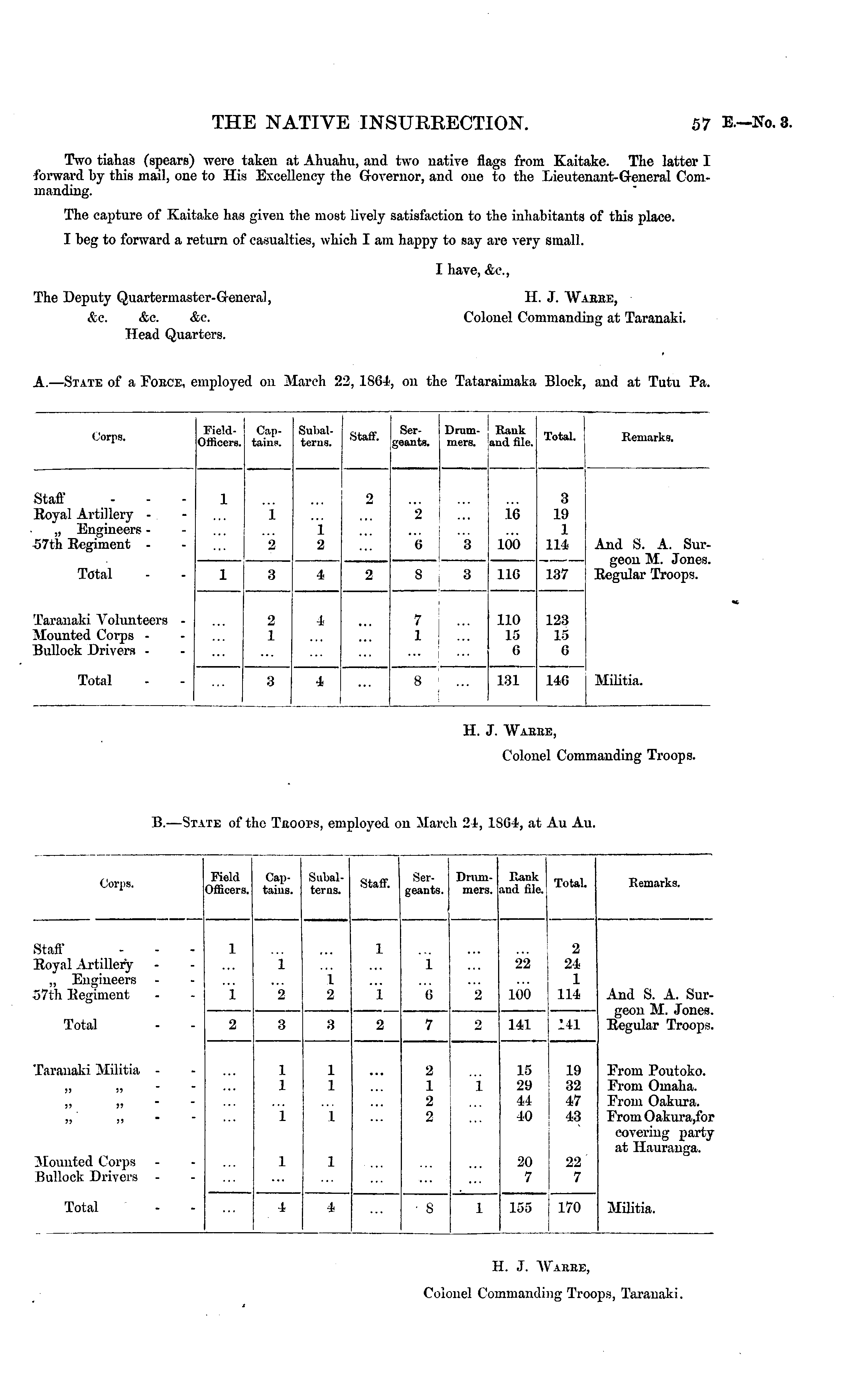 Two tiahas (spears) were taken at Ahuahu, and two native flags from Kaitake. The latter 1 forward by this mail, one to His Excellency the Governor, and one to the Lieutenant-General Commanding. The capture of Kaitake has given the most lively satisfaction to the inhabitants of this place. I beg to forward a return of casualties, which I am happy to say are very small. I have, &c, The Deputy Quartermaster-General, H. J. AVarre, Ac. &c. &e. Colonel Commanding at Taranaki. Head Quarters. A. —State of a Force, employed on March 22, 1864, on the Tataraimaka Block, and at Tutu Pa. I'orps. FieldOfficers. Captains. Subalterns. Staff. j Serjeants. Drummers. Bank and file. Total. Bemarks. Staff Royal Artillery - „ Engineers - 57th Regiment - 1 1 i 2 2 i 16 3 19 1 114 2 "e 3 100 Total And S. A. Surgeon M. Jones. Regular Troops. 2 11G 137 Taranaki Volunteers - Mounted Corps - Bullock Drivers - 7 1 110 15 G 123 15 G «t 2 1 4 Militia. Total :j 8 131 14G H. J. AVaer . , - Colonc d Commanding Troops. B.—State of th he Troo ops, employed in March 24, 1S64, at Au Au. Corps. Field lOffieers. Captains. Subalterns. Staff. Sergeants. Drummers. Bank anel file. Total. Bemarks. Staff Royal Artillery „ Engineers 57th Regiment i i i 2 i 2 1 "i i 6 2 22 100 2 24 1 114 Total And S. A. Surgeon M. Jones. Regular Troops. 3 ■ i 141 i 141 ! Taranaki Militia 115 29 44 40 19 32 47 43 From Poutoko. From Omaha. From Oakura. From Oakura,for covering party at Haurauga. 1 1 1 1 2 1 2 2 i 11 5) >> 11 ?J J> i 1 Mounted Corps Bullock Drivers i 1 20 7 22' 7 Total 170 4 S 155 Militia. H. J. AVaebe, Colonel Commanding Troops, Taranaki.