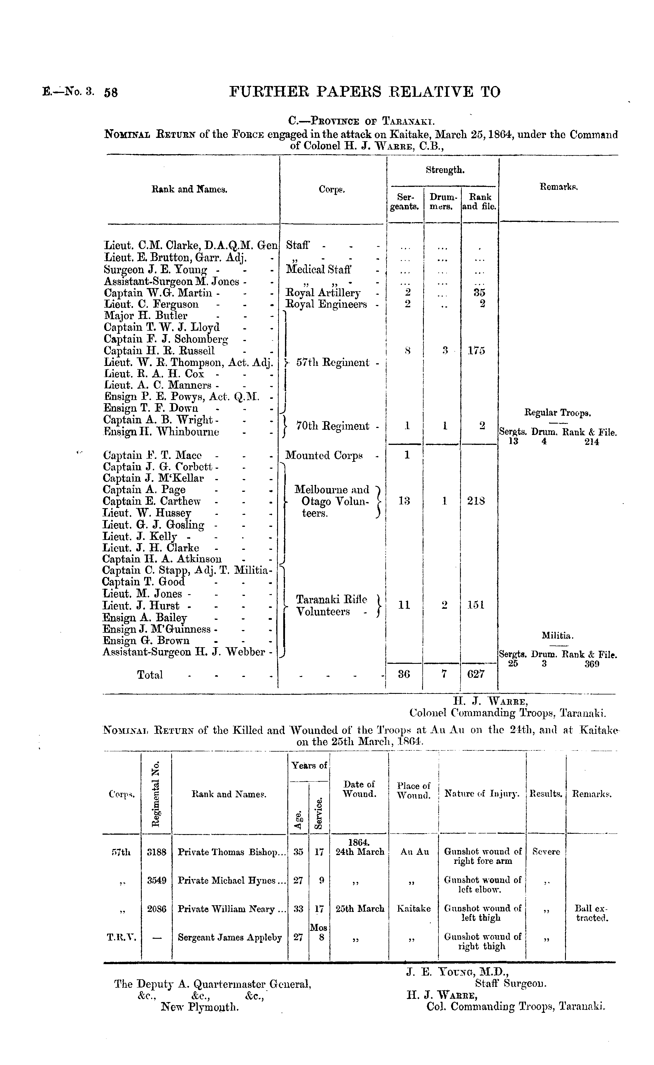 Nominal Rexuen of the Force eni 0. —Peotince of Taeanaki. iged in the attack on Kaitake, March 25,1 of Colonel H. J. Wabre, C.B., iG4, uneler the Command Strengtl Rank and Names. Corps. Bemarks. Sergeants. Drummers. Bank and file. Lieut. CM. Clarke, D.A.Q.M. Gen Lieut, E. Brutton, Garr. Adj. Surgeon J. E. Young - Assistant-Surgeon M. Jones - Captain AV.G. Martin - Lieut. C. Ferguson - Major H. Butler Captain T. AV. J. Lloyd Captain F. J. Sehomberg Captain H. R. Russell Lieut. AV. R. Thompson, Act. Adj. Lieut. B. A. II. Cox - Lieut. A. C. Manners - Ensign P. E. Powys, Act. Q.M. - Ensign T. F. Down - Captain A. B. Wright - Ensign II. AYhinbourne Staff - Medical Staff 1! 11 Royal Artillery Royal Engineers - Y 57th Regiment - "2 2 35 2 8 3 175 ■ 70th Regiment - Regular Troops. I ■I Sergts. Drum. Rank & File. 13 4 214 Captain F. T. Mace - Captain J. G. Corbctt - Captain J. M'Kellar - Captain A. Page Captain E. Carthew - Lieut. AV. Hussey Lieut. G. J. Gosling - Lieut. J. Kelly .... Lieut. J. II. Clarke - Captain II. A. Atkinson Captain C. Stapp, Adj. T. MilitiaCaptain T. Good Lieut. M. Jones - - - - Lieut. J. Hurst - Ensign A. Bailey ... Ensign J. M'Guinness - Ensign G. Brown Assistant-Surgeon H. J. AVcbber - Mounted Corps - 1 I Melbourne and ~1 V Otago Arolun- V teers. ) 13 218 Taranaki Rifle \ Volunteers - j I L ■_> 151 Militia. Sergts. Drum. Bank & File. 25 3 360 Total .... 86 7 627 I] Colonel Ci II. J. Warbe, >1 Commanding Troops, T 'aranaki. Nominal Re' pl*rn of the Killed and AVounde on the td of the Tr 25th Marcl •oops at Au Ai i, 1864. li Au on the 24th, and a it Kaitake 6 y. ■*^ a « s So s Years of Date of Wound. Place of | Wound. ! Nat Nature of Injury. Results. Bemarks. Corps. Bank and Names. D <•> '5 SB g «_ CO Results. <__> *a_ _ r>7th 3188 Private Thomas Bishop... 33 17 1864. 24th March Au Au Gur ri Gunshot wound of Severe right fore arm Severe ?? 3549 Private Michael Hynes ... 27 9 J J Gill! 1 G unshot wound of ,, left elbow. ) * 2086 Private William ISTeary ... 33 17 25th March Kaitake Gur Gunshot wound of ,, left thigh . _ Bull extracted. T.B.Y. Sergeant James Appleby Mos 8 55 Gunshot wound of „ right thigh » ,, Gur The •eputy A. Quartermaster Gen c, &c, &c., New Plymouth. leral J. E. Youno, M.D., Staff Surgeon. H. J. AVabbe, Col. Commanding Troops, Taranaki.