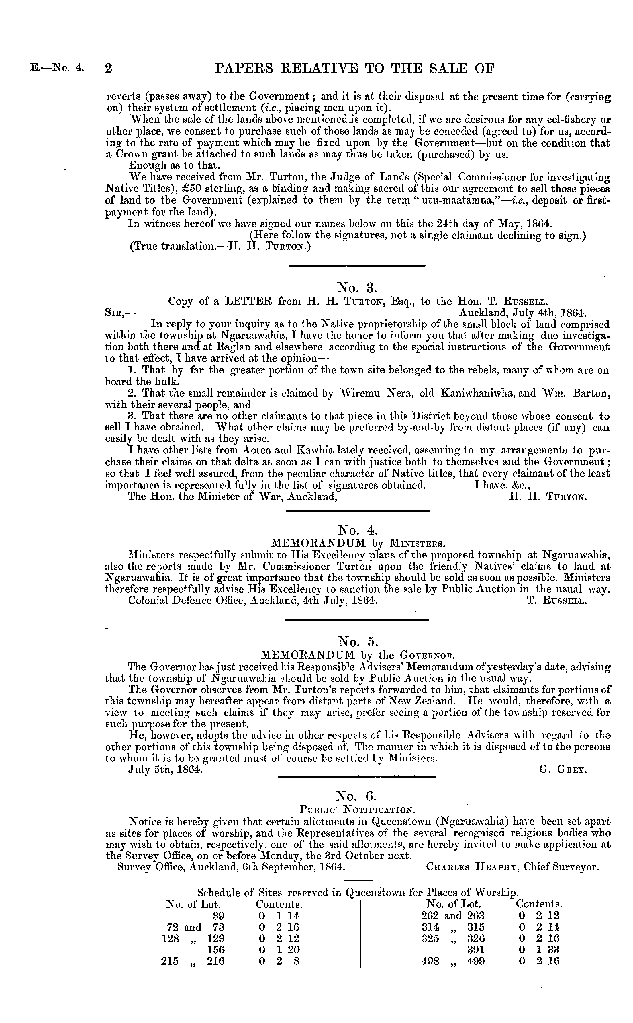 No. 3. Copy of a LETTEE from H. H. Turtojj, Esq., to the Hon. T. Russell. Sik,— Auckland, July 4th, 1864. In reply to your inquiry as to the Native proprietorship of the small block of land comprised within the township at Ngaruawahia, I have the honor to inform you that after making due investigation both there and at Raglan and elsewhere according to the special instructions of the Government to that effect, I have arrived at the opinion— 1. That by far the greater portion of the town site belonged to the rebels, many of whom are on board the hulk. 2. That the small remainder is claimed by Wiremu Nera, old Kaniwhaniwha, and Wm. Barton, with their several people, and 3. That there are no other claimants to that piece in this District beyond those whose consent to sell I have obtained. What other claims may be preferred by-and-by from distant places (if any) can easily be dealt with as they arise. I have other lists from Aotea and Kawhia lately received, assenting to my arrangements to purchase their claims on that delta as soon as I can with justice both to themselves and the Government; so that I feel well assured, from the peculiar character of Native titles, that every claimant of the least importance is represented fully in the list of signatures obtained. I have, &c., The Hon. the Minister of War, Auckland, 11. H. Turtox.