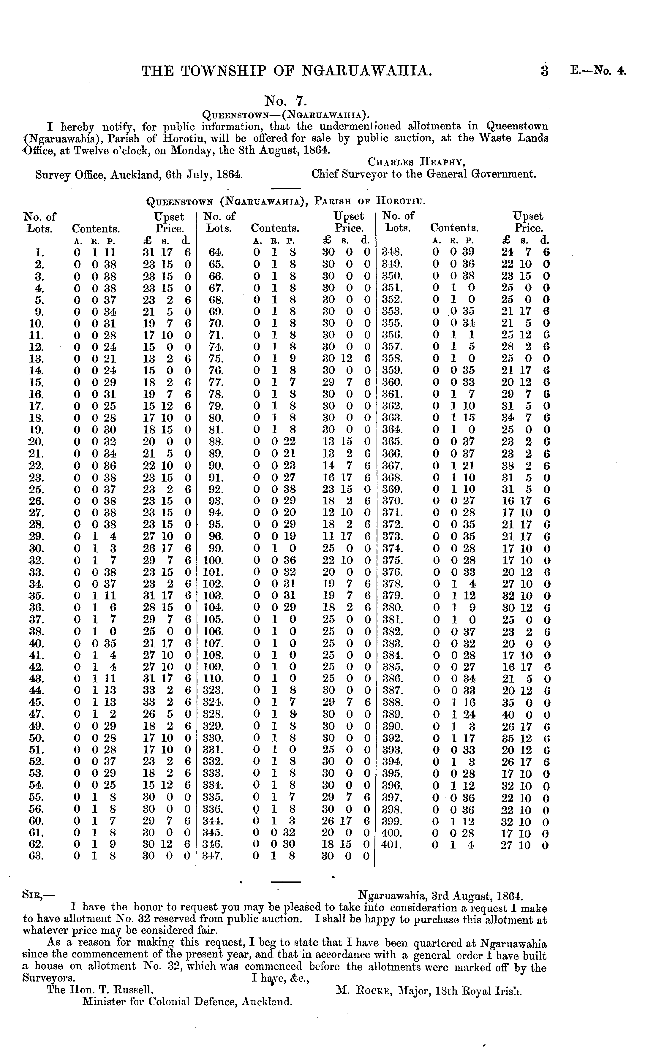 No. 7. QUEENSTOWN (NGARUAWAHIA). I hereby notify, for public information, that the undermentioned allotments in Queenstown (Ngaruawahia), Parish of Horotiu, will be offered for sale by public auction, at the Waste Lands Office, at Twelve o'clock, on Monday, the 8th August, 1864. Charles Heaphy, Survey Office, Auckland, 6th July, 1864. Chief Surveyor to the General Government. Ql'eenstown (Ngaruawahia), Parish of Horotiu. No. of Upset No. of Upset No. of Upset Lots. Contents. Price. Lots. Contents. Price. Lots. Contents. Price. a. e. p. £ s. d. a. r. p. £ s. d. a. r. p. £ s. d. 1. 0 1 11 31 17 6 64. 0 18 30 0 0 318. 0 0 39 24 7 6 2. 0 0 38 23 15 0 65. 0 18 30 0 0 349. 0 0 36 22 10 0 3. 0 0 38 23 15 0 66. 0 18 30 0 0 350. 0 0 38 23 15 0 4. 0 0 38 23 15 0 67. 0 18 30 0 0 351. 0 10 25 0 0 5. 0 0 37 23 2 6 68. 0 18 30 0 0 352. 0 10 25 0 0 9. 0 0 34 21 5 0 69. 0 1 S 30 0 0 353. 0 0 35 21 17 6 10. 0 0 31 19 7 6 70. 0 18 30 0 0 355. 0 0 34 21 5 0 11. 0 0 28 17 10 0 71. 0 18 30 0 0 356. Oil 25 12 G 12. 0 0 24 15 0 0 74. 0 18 30 0 0 357. 0 15 28 2 6 13. 0 0 21 13 2 6 75. 0 19 30 12 6 358. 0 10 25 0 0 14. 0 0 24 15 0 0 76. 0 18 30 0 0 359. 0 0 35 21 17 6 15. 0 0 29 IS 2 6 77. 0 17 29 7 6 360. 0 0 33 20 12 6 16. 0 0 31 19 7 6 78. 0 1 8 30 0 0 361. 0 17 29 7 6 17. 0 0 25 15 12 6 79. 0 18 30 0 0 362. 0 1 10 31 5 0 18. 0 0 28 17 10 0 80. 0 18 30 0 0 363. 0 1 15 34 7 6 19. 0 0 30 18 15 0 81. 0 18 30 0 0 364. 0 10 25 0 0 20. 0 0 32 20 0 0 88. 0 0 22 13 15 0 365. 0 0 37 23 2 G 21. 0 0 34 21 5 0 89. 0 0 21 13 2 6 366. 0 0 37 23 2 6 22. 0 0 36 22 10 0 90. 0 0 23 14 7 6 367. 0 1 21 38 2 6 23. 0 0 38 23 15 0 91. 0 0 27 16 17 6 368. 0 1 10 31 5 0 25. 0 0 37 23 2 6 92. 0 0 38 23 15 0 369. 0 1 10 31 5 0 26. 0 0 38 23 15 0 93. 0 0 29 18 2 6 370. 0 0 27 16 17 6 27. 0 0 38 23 15 0 94. 0 0 20 12 10 0 371. 0 0 28 17 10 0 28. 0 0 38 23 15 0 95. 0 0 29 18 2 6 372. 0 0 35 21 17 0 29. 0 14 27 10 0 96. 0 0 19 11 17 6 373. 0 0 35 21 17 6 30. 0 13 26 17 6 99. 0 10 25 0 0 374. 0 0 28 17 10 0 32. 0 17 29 7 6 100. 0 0 36 22 10 0 375. 0 0 28 17 10 0 S3. 0 0 38 23 15 0 101. 0 0 32 20 0 0 376. 0 0 33 20 12 6 34. 0 0 37 23 2 6 102. 0 0 31 19 7 6 378. 0 14 27 10 0 35. 0 1 11 31 17 6 103. 0 0 31 19 7 6 379. 0 1 12 32 10 0 36. 0 16 28 15 0 104. 0 0 29 18 2 6 380. 0 19 30 12 6 37. 0 17 29 7 6 105. 0 10 25 0 0 381. 0 10 25 0 0 38. 0 10 25 0 0 106. 0 10 25 0 0 382. 0 0 37 23 2 6 40. 0 0 35 21 17 6 107. 0 10 25 0 0 383. 0 0 32 20 0 0 41. 0 14 27 10 0 108. 0 10 25 0 0 384. 0 0 28 17 10 0 42. 0 14 27 10 0 109. 0 10 25 0 0 385. 0 0 27 16 17 6 43. 0 1 11 31 17 6 110. 0 10 25 0 0 386. 0 0 34 21 5 0 44. 0 1 13 33 2 6 323. 0 18 30 0 0 387. 0 0 33 20 12 6 45. 0 1 13 33 2 6 324. 0 17 29 7 6 388. 0 1 16 35 0 0 47. 0 12 26 5 0 328. 0 18- 30 0 0 389. 0 1 24 40 0 0 49. 0 0 29 18 2 6 329. 0 18 30 0 0 390. 0 13 26 17 G 50. 0 0 28 17 10 0 330. 0 18 30 0 0 392. 0 1 17 35 12 G 51. 0 0 28 17 10 0 331. 0 10 25 0 0 393. 0 0 33 20 12 G 52. 0 0 37 23 2 6 332. 0 18 30 0 0 394. 0 13 26 17 6 53. 0 0 29 18 2 6 333. 0 18 30 0 0 395. 0 0 28 17 10 0 54. 0 0 25 15 12 6 334. 0 18 30 0 0 396. 0 1 12 32 10 0 55. 0 18 30 0 0 335. 0 17 29 7 6 397. 0 0 36 22 10 0 56. 0 18 30 0 0 336. 0 18 30 0 0 398. 0 0 36 22 10 0 60. 0 17 29 7 6 344. 0 13 26 17 6 399. 0 1 12 32 10 0 61. 0 18 30 0 0 345. 0 0 32 20 0 0 400. 0 0 28 17 10 0 62. 0 19 30 12 6 346. 0 0 30 18 15 0 401. 0 14 27 10 0 63. 0 18 30 0 0 347. 0 18 30 0 0 Sir, — Ngaruawahia, 3rd August, 1864. I have the honor to request you may be pleased to take into consideration a request I make to have allotment No. 32 reserved from public auction. I shall be happy to purchase this allotment at whatever price may be considered fair. As a reason for making this request, I beg to state that I have been quartered at Ngaruawahia since the commencement of the present year, and that in accordance with a general order I have built a, house on allotment No. 32, which was commenced before the allotments were marked off by the Surveyors. I have, &e., The Hon. T. Russell, M. Rocice, Major, ISth Royal Irish. Minister for Colonial Defence, Auckland.