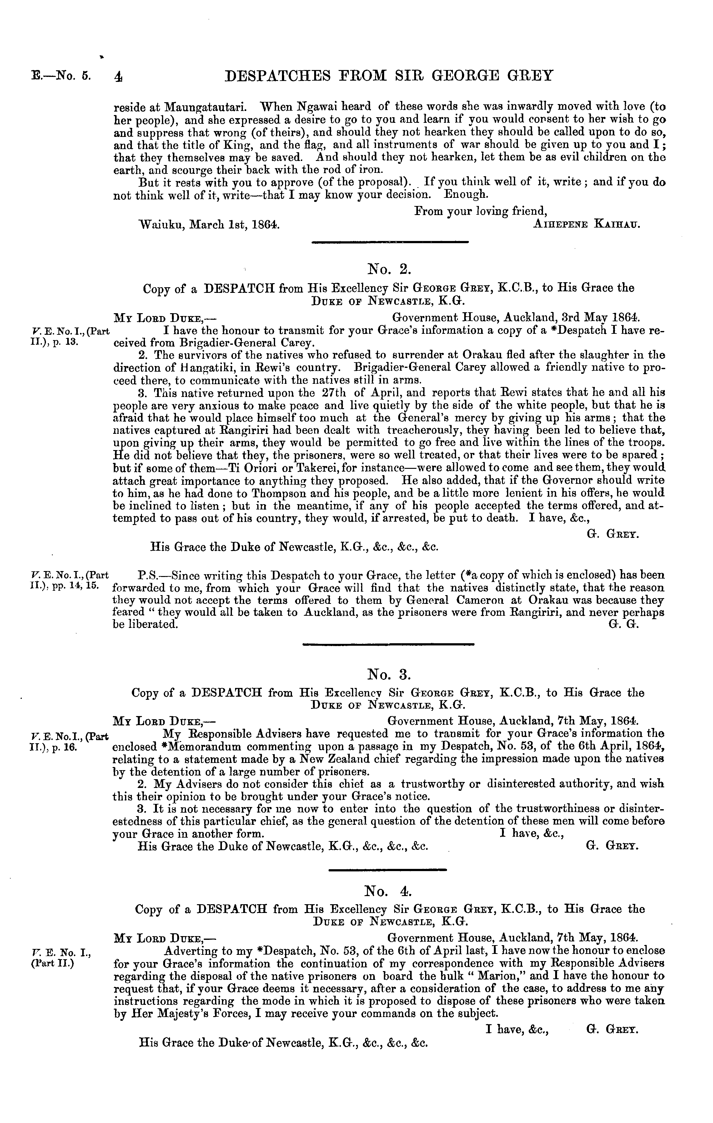 No. 2. Copy of a DESPATCH from His Excellency Sir George Geey, X.C.8., to His Grace the Duke of Newcastle, K.G. My Lobd Duke, —- Government House, Auckland, 3rd May 1864. I have the honour to transmit for your Grace's information a copy of a *Despatch I have received from Brigadier-General Carey. 2. The survivors of the natives who refused to surrender at Orakau fled after the slaughter in the direction of Uangatiki, in Rewi's country. Brigadier-General Carey allowed a friendly native to proceed there, to communicate with the natives still in arms. 3. This native returned upon the 27th of April, and reports that Rewi states that ho and all his people are very anxious to make peace and live quietly by the side of the white people, but that he is afraid that he would place himself too much at the General's mercy by giving up his arms ; that the natives captured at Rangiriri had been dealt with treacherously, they having been led to believe that, upon giving up their arms, they would be permitted to go free and live within the lines of the troops. He did not believe that they, the prisoners, were so well treated, or that their lives were to be spared; but if some of them—Ti Oriori or Takerei, for instance—were allowed to come and see them, they would attach great importance to anything they proposed. He also added, that if the Governor should write to him, as he had done to Thompson and his people, and be a little more lenient in his offers, he would be inclined to listen ; but in the meantime, if any of his people accepted the terms offered, and attempted to pass out of his country, they would, if arrested, be put to death. I have, &c, G. Geey. His Grace the Duke of Newcastle, KG., &c, &c, &c. P.S.—Since writing this Despatch to your Grace, the letter (*a copy of which is enclosed) has been forwarded to me, from which your Grace will find that the natives distinctly state, that the reason they would not accept the terms offered to them by General Cameron at Orakau was because they feared " they would all be taken to Auckland, as the prisoners were from Rangiriri, and never perhaps be liberated. G. G.