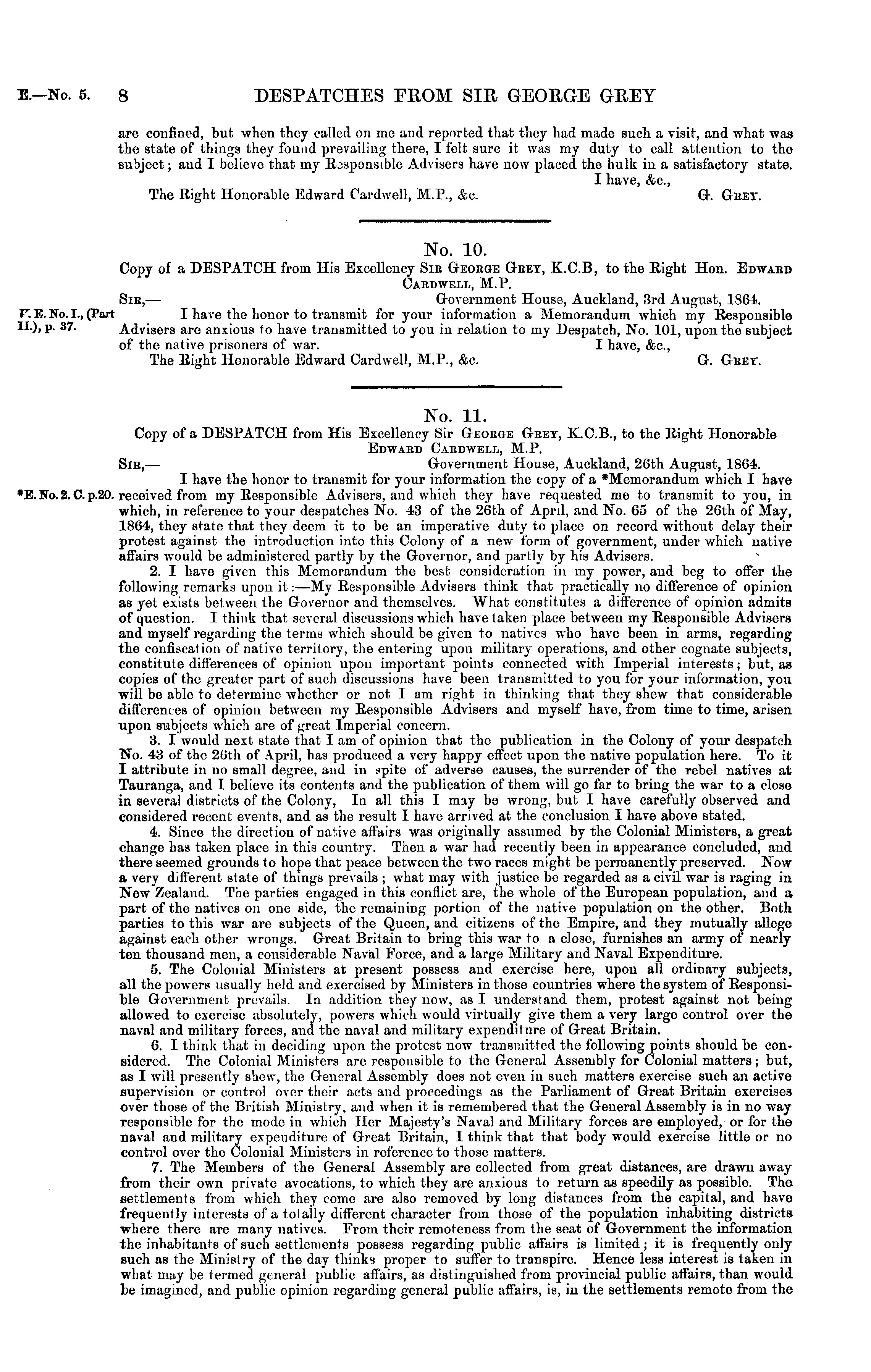 No. 11. Copy of a DESPATCH from His Excellency Sir George Grey, X.C.8., to the Right Honorable Edward Cardwell, M.P. Sib, — Government House, Auckland, 20th August, 1864. I have the honor to transmit for your information the copy of a *Memorandum which I have received from my Responsible Advisors, and which they have requested me to transmit to you, in which, in reference to your despatches No. 43 of the 26th of April, and No. 65 of the 26th of May, 1864, they state that they deem it to be an imperative duty to place on record without delay their protest against tho introduction into this Colony of a new form of government, under which native affairs would be administered partly by the Governor, and partly by his Advisers. 2. I have given this Memorandum the best consideration in my power, and beg to offer the following remarks upon it:—My Responsible Advisers think that practically no difference of opinion as yet exists between the Governor and themselves. What constitutes a difference of opinion admits of question. I think that several discussions which have taken place between my Responsible Advisers and myself regarding the terms which should be given to natives who have been in arms, regarding the confiscation of native territory, the entering upon military operations, and other cognate subjects, constitute differences of opinion upon important points connected with Imperial interests; but, as copies ofthe greater part of such discussions have been transmitted to you for your information, you will be able to determine whether or not I am right in thinking that they show that considerable differences of opinion between my Responsible Advisers and myself have, from time to time, arisen upon subjects which are of great Imperial concern. 3. I would next state that I am of opinion that the publication in the Colony of your despatch No. 43 of the 20th of April, has produced a very happy effect upon the native population here. To it I attribute in no small degree, and in spite of adverse causes, the surrender of the rebel natives at Tauranga, and I believe its contents and the publication of them will go far to bring the war to a close in several districts of the Colony, In all this I may be wrong, but I have carefully observed and considered recent: events, and as the result I have arrived at the conclusion I have above stated. 4. Since the direction of native affairs was originally assumed by the Colonial Ministers, a great change has taken place in this country. Then a war had recently been in appearance concluded, and there seemed grounds to hope that peace between the two races might be permanently preserved. Now a very different state of things prevails ; what may with justice bo regarded as a civil war is raging in New Zealand. The parties engaged in this conflict are, the whole ofthe European population, and a part of the natives on one side, the remaining portion of the native population on the other. Both parties to this war are subjects of the Queen, and citizens of the Empire, and they mutually allege against each other wrongs. Great Britain to bring this war 1o a close, furnishes an army of nearly ten thousand men, a considerable Naval Force, and a large Military and Naval Expenditure. 5. The Colonial Ministers at present possess and exercise here, upon all ordinary subjects, all the powers usually held and exercised by Ministers in those countries where the system of Responsible Government prevails. In addition they now, as I understand them, protest against not being allowed to exercise absolutely, powers which would virtually give them a very large control over the naval and military forces, and the naval and military expenditure of Great Britain. 6. I think that in deciding upon the protest now transmitted the following points should be considered. The Colonial Ministers are responsible to the General Assembly for Colonial matters; but, as I will presently shew, the General Assembly does not even in such matters exercise such an active supervision or control over their acts and proceedings as the Parliament of Great Britain exercises over those ofthe British Ministry, and when it is remembered that the General Assembly is in no way responsible for the mode in which Her Majesty's Naval and Military forces are employed, or for tho naval and military expenditure of Great Britain, I think that that body would exercise little or no control over the Colonial Ministers in reference to those matters. 7. The Members of the General Assembly are collected from great distances, are drawn away from their own private avocations, to which they are anxious to return as speedily as possible. Tho settlements from which they come are also removed by long distances from the capital, and have frequently interests of a totally different character from those of the population inhabiting districts where there are many natives. From their remoteness from the seat of Government the information the inhabitants of such settlements possess regarding public affairs is limited; it is frequently only such as the Ministry of the day thinks proper to suffer to transpire. Hence less interest is taken in what may be termed general public affairs, as distinguished from jirovincial public affairs, than would be imagined, and public opinion regarding general public affairs, is, in the settlements remote from the