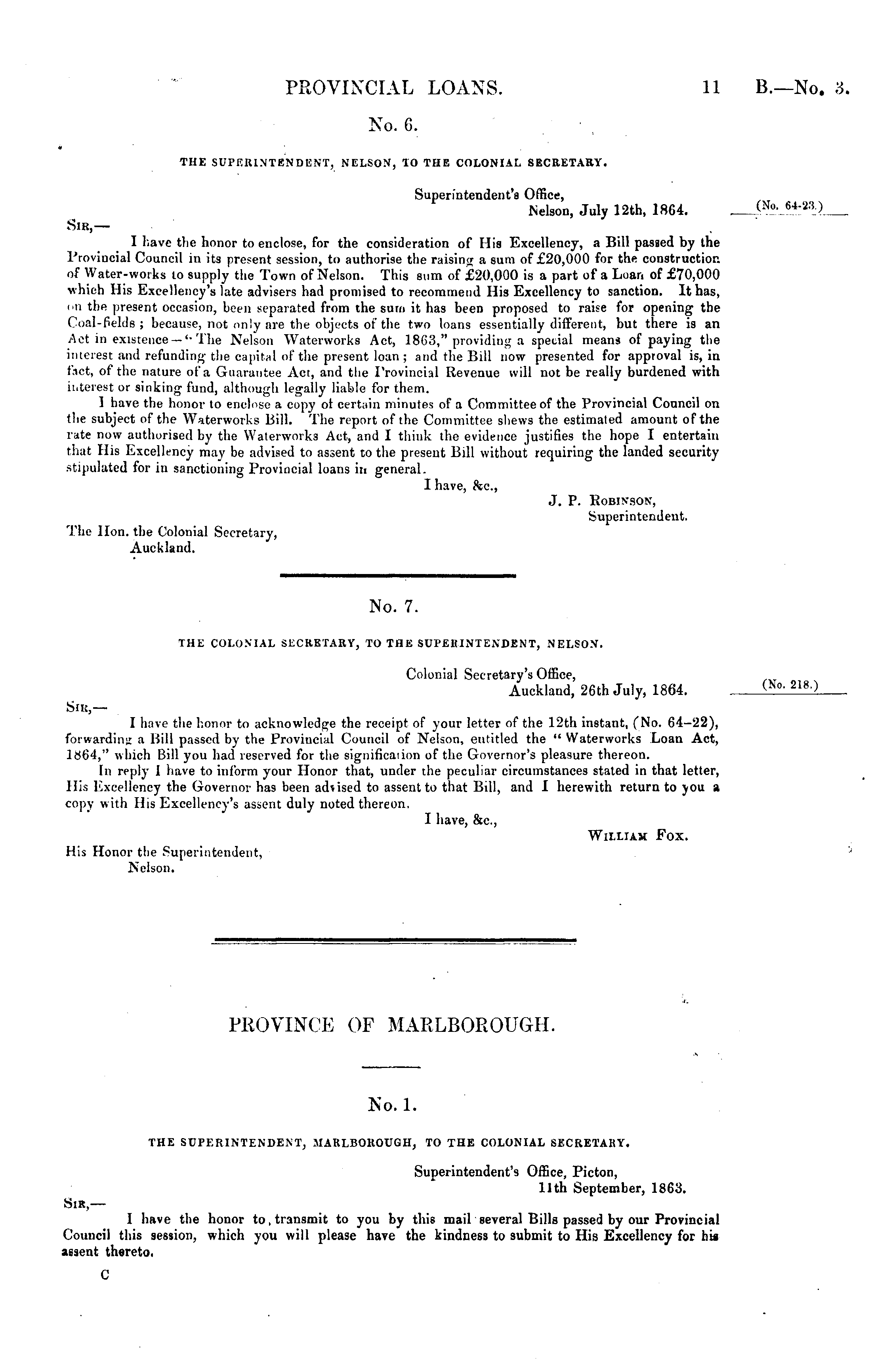No. G. THE SUPERINTENDENT, NELSON, TO THE COLONIAL SECRETARY. Superintendent's Office, Nelson, July 12th, 1864. Sib,— I have the honor to enclose, for the consideration of His Excellency, a Bill passed by the Provincial Council in its present session, to authorise the raising a sum of £20,000 for the construction of Water-works to supply the Town of Nelson. This sum of £20,000 is a part of a Luan of £70,000 which His Excellency's late advisers had promised to recommend His Excellency to sanction. It has, on the present occasion, been separated from the sum it has been proposed to raise for opening the Coftl-fields ; because, not only are the objects of the two loans essentially different, but there is an Act in existence —'• The Nelson Waterworks Act, 18G3," providing a special means of paying the interest and refunding the capital of the present loan ; and the Bill now presented for approval is, in fact, of the nature of a Guarantee Act, and tlie Provincial Revenue will not be really burdened with interest or sinking fund, although legally liable for them. I have the honor to enclose a copy ot certain minutes of a Committee of the Provincial Council on the subject of the Waterworks Bill. The report of the Committee shews the estimated amount of the rate now authorised by the Waterworks Act, and I think the evidence justifies the hope I entertain that His Excellency may be advised to assent to the present Bill without requiring the landed security stipulated for in sanctioning Provincial loans iii general. I have, &c, J. P. Robinson, Superintendent, lion, the Colonial Secretary, Auckland. No. 7. THE COLONIAL SECRETARY, TO THE SUPERINTENDENT, NELSON. Colonial Secretary's Office, Auckland, 26th July, 1864. SiX, I have the honor to acknowledge the receipt of your letter of the 12th instant, (No. 64-22), forwarding a Hill passed by the Provincial Council of Nelson, entitled the " Waterworks Loan Act, 1864," which Bill you had reserved for the significaiion of the Governor's pleasure thereon. [n reply 1 have to inform your Honor that, under the peculiar circumstances stated in that letter, His Excellency the Governor has been advised to assent to that Bill, and I herewith return to jou a copy with His Excellency's assent duly noted thereon. I have, &c, William Fox. His Honor tlie Superintendent, Nelson. PROVINCE OF MARLBOROUGH. No. 1. THE SUPERINTENDENT, MARLBOROUGH, TO THE COLONIAL SECRETARY. Superintendent's Office, Picton, 11th September, 1863. Sir, — I have the honor to, transmit to you by this mail several Billa passed by our Provincial Council this session, which you will please have the kindness to submit to His Excellency for his assent thereto. C