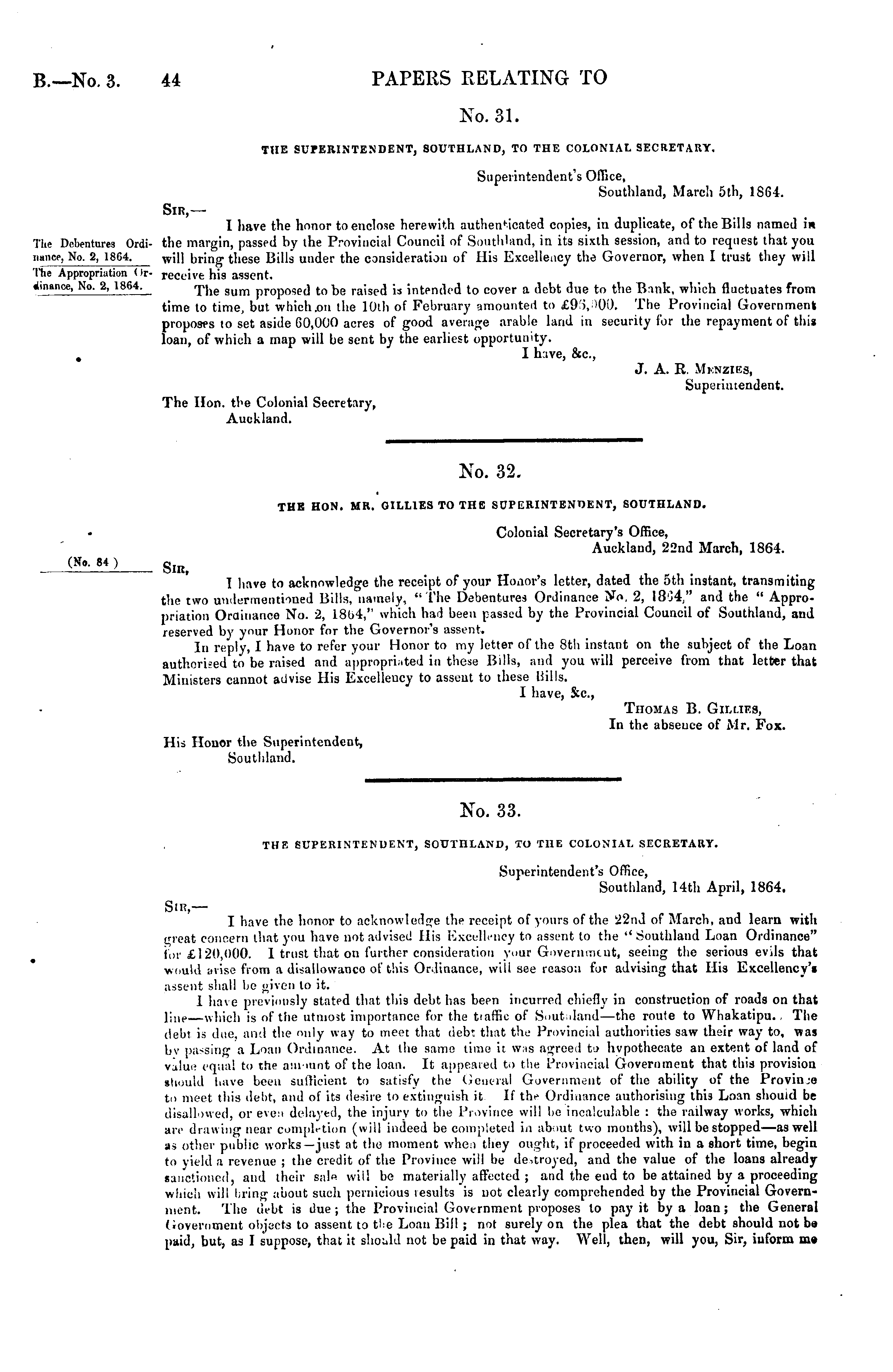 No. 32. THE HON. MR. GILLIES TO THE SUPERINTENDENT, SOUTHLAND. Colonial Secretary's Office, Auckland, 22nd March, 1864. Sin, I have to acknowledge the receipt of your Honor's letter, dated the sth instant, transmiting the two undermentioned Bills, namely, "The Debentures Ordinance No, 2, 1804," and the " Appropriation Ordinance No. 2, 18b4," which had been passed by the Provincial Council of Southland, and reserved by your Honor for the Governor's assent. In reply, I have to refer your Honor to my letter of the Bth instant on the subject of the Loan authorised to be raised and appropriated in these Bills, and you will perceive from that letter that Ministers cannot advise His Excellency to assent to these Bills. I have, &c, Thomas B. Gillies, In the absence of Mr. Fox. His Honor the Superintendent, Southland.