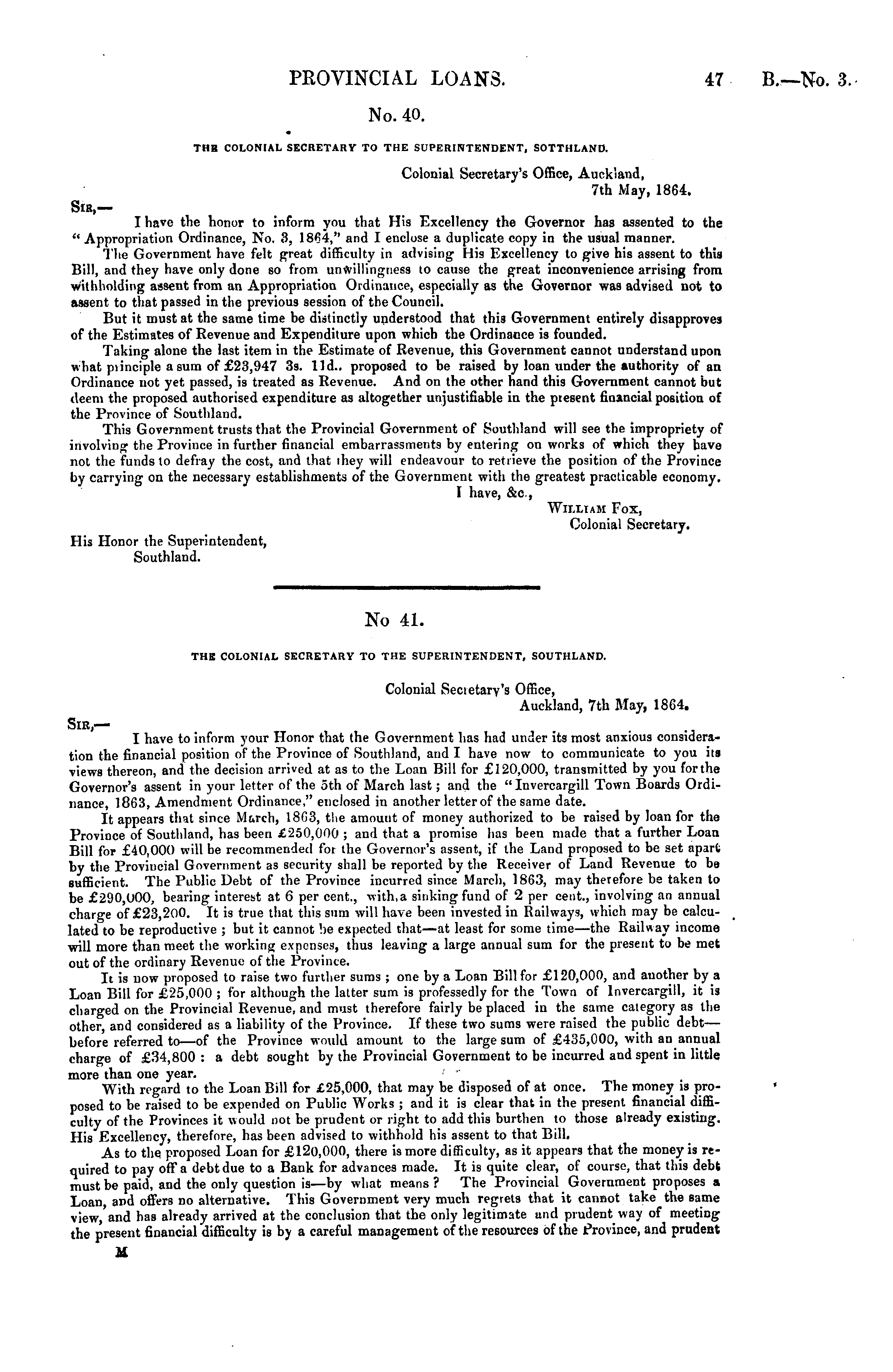No 41. THE COLONIAL SECRETARY TO THE SUPERINTENDENT, SOUTHLAND. Colonial Sectetary's Office, Auckland, 7th May, 1864. Sir, — I have to inform your Honor that the Government has had under its most anxious consideration the financial position of the Province of Southland, and I have now to communicate to you its views thereon, and the decision arrived at as to the Loan Bill for £120,000, transmitted by you for the Governor's assent in your letter of the sth of March last; and the " Invercargill Town Boards Ordinance, 1863, Amendment Ordinance," enclosed in another letter of the same date. It appears that since March, 1803, the amount of money authorized to be raised by loan for the Province of Southland, has been £250,000 ; and that a promise has been made that a further Loan Bill for £40,000 will be recommended fot the Governor's assent, if the Land proposed to be set apart by the Provincial Government as security shall be reported by the Receiver of Land Revenue to ba sufficient. The Public Debt of the Province incurred since March, 1863, may therefore be taken to be £290,000, bearing interest at 6 per cent., with a sinking fund of 2 per cent., involving an annual charge of £23,200. It is true that this sum will have been invested in Railways, which may be calculated to be reproductive ; but it cannot '.)e expected that—at least for some time—the Railway income will more than meet the working expenses, thus leaving a large annual sum for the present to be met out of the ordinary Revenue of the Province. It is now proposed to raise two further sums ; one by a Loan Bill for £120,000, and another by a Loan Bill for £25,000 ; for although the latter sum is professedly for the Town of Invercargill, it is charged on the Provincial Revenue, and must therefore fairly be placed in the same category as the other, and considered as a liability of the Province. If these two sums were raised the public debt— before referred to—of the Province would amount to the large sum of £435,000, with an annual charge of £34,800: a debt sought by the Provincial Government to be incurred and spent in little more than one year. With regard to the Loan Bill for £25,000, that may be disposed of at once. The money is proposed to be raised to be expended on Public Works ; and it is clear that in the present financial difficulty of the Provinces it would not be prudent or right to add this burthen to those already existing. His Excellency, therefore, has been advised to withhold his assent to that Bill, As to the proposed Loan for £120,000, there is more difficulty, as it appears that the money is required to pay off a debt due to a Bank for advances made. It is quite clear, of course, that this debt must be paid, and the only question is—by what means? The Provincial Government proposes a Loan, and offers no alternative. This Government very much regrets that it cannot take the same view, and has already arrived at the conclusion that the only legitimate and prudent way of meeting the present financial difficulty is by a careful management of the resources of the Province, and prudent