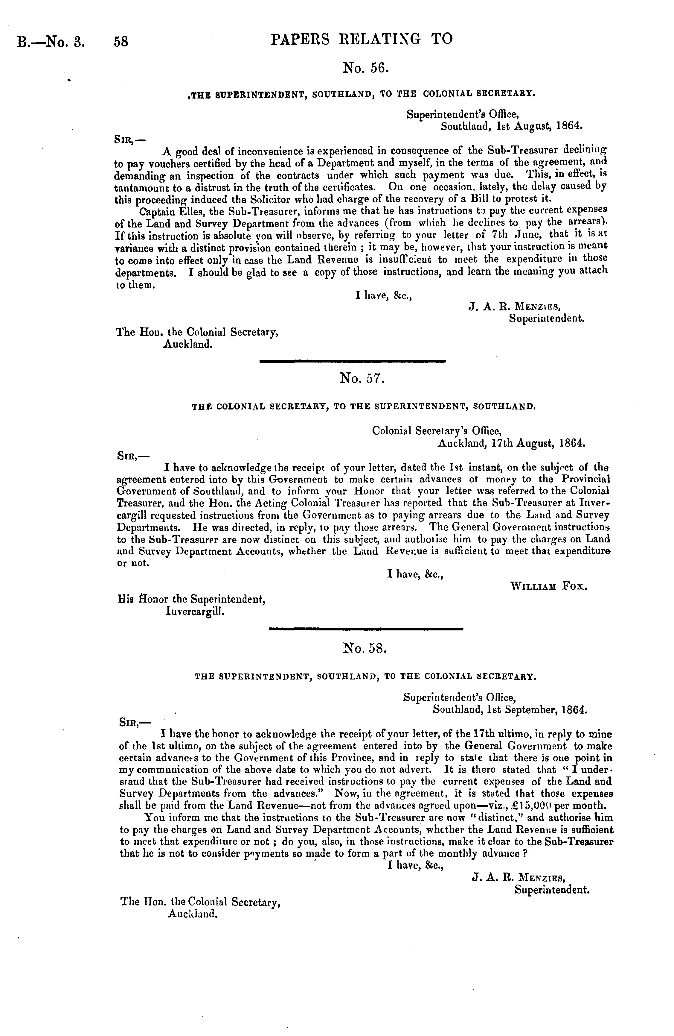 No. 58. THE SUPERINTENDENT, SOUTHLAND, TO THE COLONIAL SECRETARY. Superintendent's Office, Southland, Ist September, 1864. Sir, — I have the honor to acknowledge the receipt of your letter, of the 17th ultimo, in reply to mine of the Ist ultimo, on the subject of the agreement entered into by the General Government to make certain advanct s to the Government of this Province, and in reply to stale that there is one point in my communication of the above date to which you do not advert. It is there stated that " I understand that the Sub-Treasurer had received instructions to pay the current expenses of the Land and Survey Departments from the advances." Now, in the agreement, it is stated that those expenses shall be paid from the Land Revenue—not from the advances agreed upon—viz., £15,000 per month. You inform me that the instructions to the Sub-Treasurer are now "distinct," and authorise him to pay the charges on Land and Survey Department Accounts, whether the Land Revenue is sufficient to meet that expenditure or not ; do you, also, in those instructions, make it clear to the Sub-Treasurer that he is not to consider payments so made to form a part of the monthly advance ? I have, &c, J. A. R. Menzies, Superintendent. The Hon. the Colonial Secretary, Auckland.