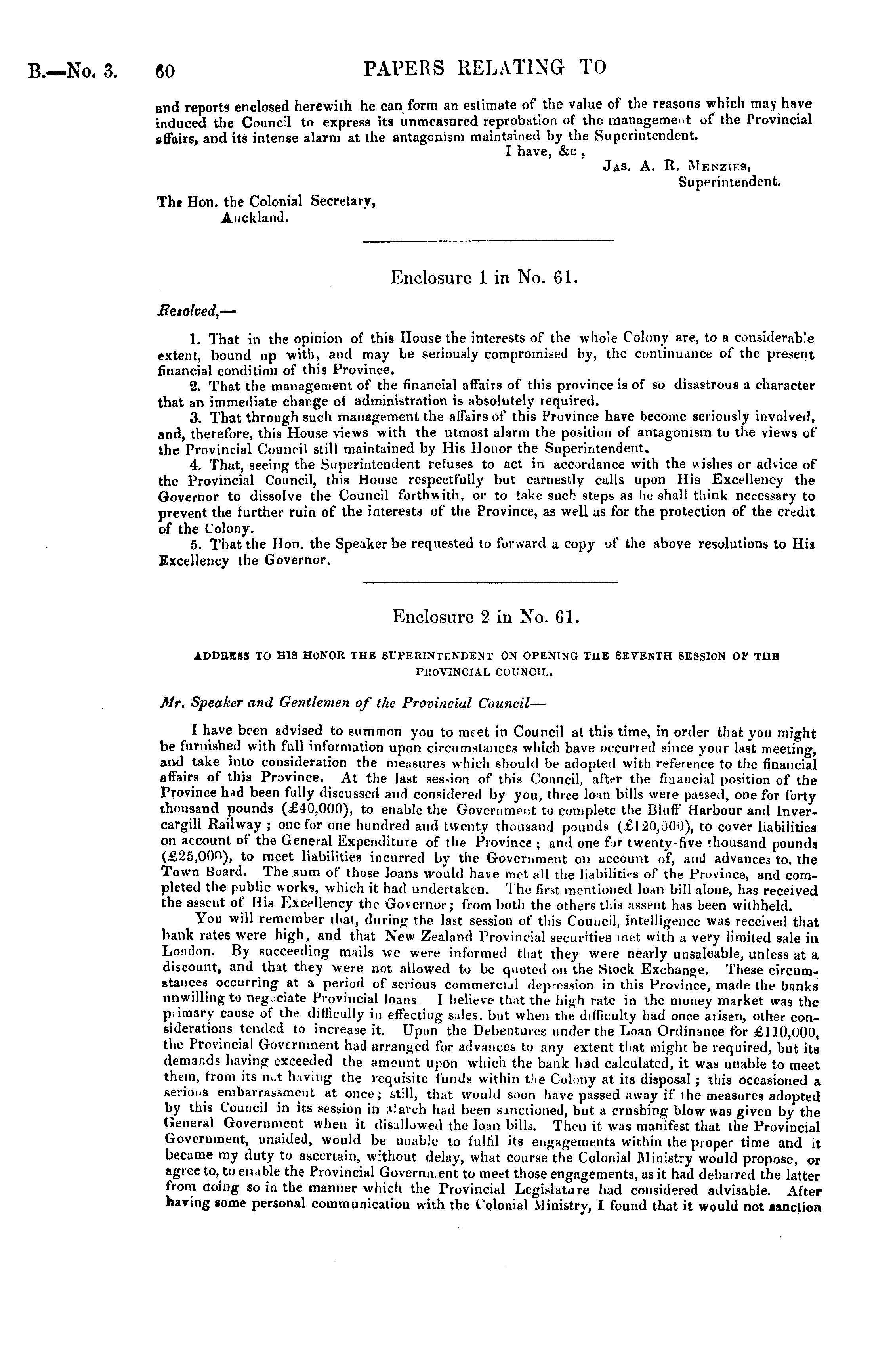 Enclosure 2 in No. 61. ADDRESS TO HIS HONOK THE SUPERINTENDENT ON OPENING THE SEVENTH SESSION OF THB I'KOVINCIAL COUNCIL. Mr. Speaker and Gentlemen of the Provincial Council — I have been advised to summon you to meet in Council at this time, in order that you might be furnished with full information upon circumstances which have occurred since your last meeting, and take into consideration the measures which should be adopted with reference to the financial affairs of this Province. At the last session of this Council, after the financial position of the Province had been fully discussed and considered by you, three loan bills were passed, one for forty thousand pounds (£40,000), to enable the Government to complete the Bluff Harbour and lnvercargill Railway ; one for one hundred and twenty thousand pounds (£120,000), to cover liabilities on account of the General Expenditure of the Province ; and one for twenty-five thousand pounds (£25,00(1), to meet liabilities incurred by the Government on account of, and advances to, the Town Hoard. The sum of those loans would have met all the liabilities of the Province, and completed the public works, which it had undertaken. The first mentioned loan bill alone, has received the assent of His Excellency the Governor; from both the others tliis assent has been withheld. You will remember tliat, during the last session of this Council, intelligence was received that bank rates were high, and that New Zealand Provincial securities met with a very limited sale in London. By succeeding mails we were informed that they were nearly unsaleable, unless at a discount, and that they were not allowed to be quoted on the Stock Exchange. These circumstances occurring at a period of serious commercial depression in this Province, made the banks unwilling to negnciate Provincial loans I believe that the high rate in the money market was the primary cause of the difficully in effecting sales, but when the difficulty had once aiisen, other considerations tended to increase it. Upon the Debentures under the Loan Ordinance for £110,000, the Provincial Government had arranged for advances to any extent that might be required, but its demands haying exceeded the amount upon which the bank had calculated, it was unable to meet them, from its nU having the requisite funds within the Colony at its disposal ; this occasioned a seriot.s embarrassment at once; still, that would soon have passed away if the measures adopted by this Council in its session in .vlarch had been sanctioned, but a crushing blow was given by the General Government when it disallowed the loan bills. Then it was manifest that the Provincial Government, unaided, would be unable to fulfil its engagements within the proper time and it became my duty to ascertain, without delay, what course the Colonial Ministry would propose, or agree to, to enable the Provincial Government to meet those engagements, as it had debarred the latter from doing so in the manner which the Provincial Legislature had considered advisable. After having »ome personal communication with the Colonial Ministry, I found that it would not •anction