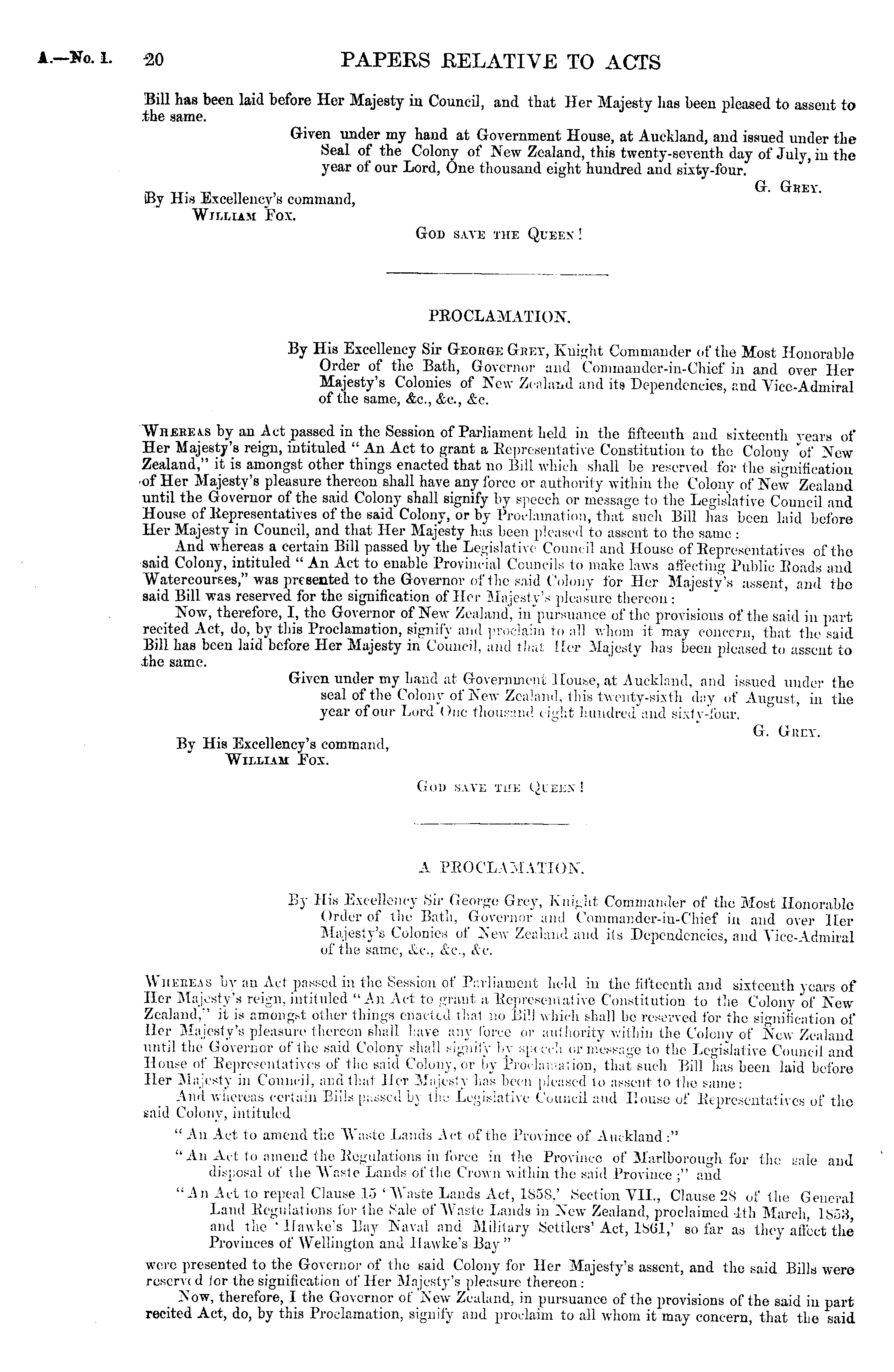 Given under my hand at Government House, at Auckland, and issued under the Seal of the Colony of New Zealand, this twenty-seventh day of July, in the year of our Lord, One thousand eight hundred and sixty-four. -r> tt- t-, „ i Gr- GfKEY. ifc>y His .fejxcelleiicy s command, William Pox.