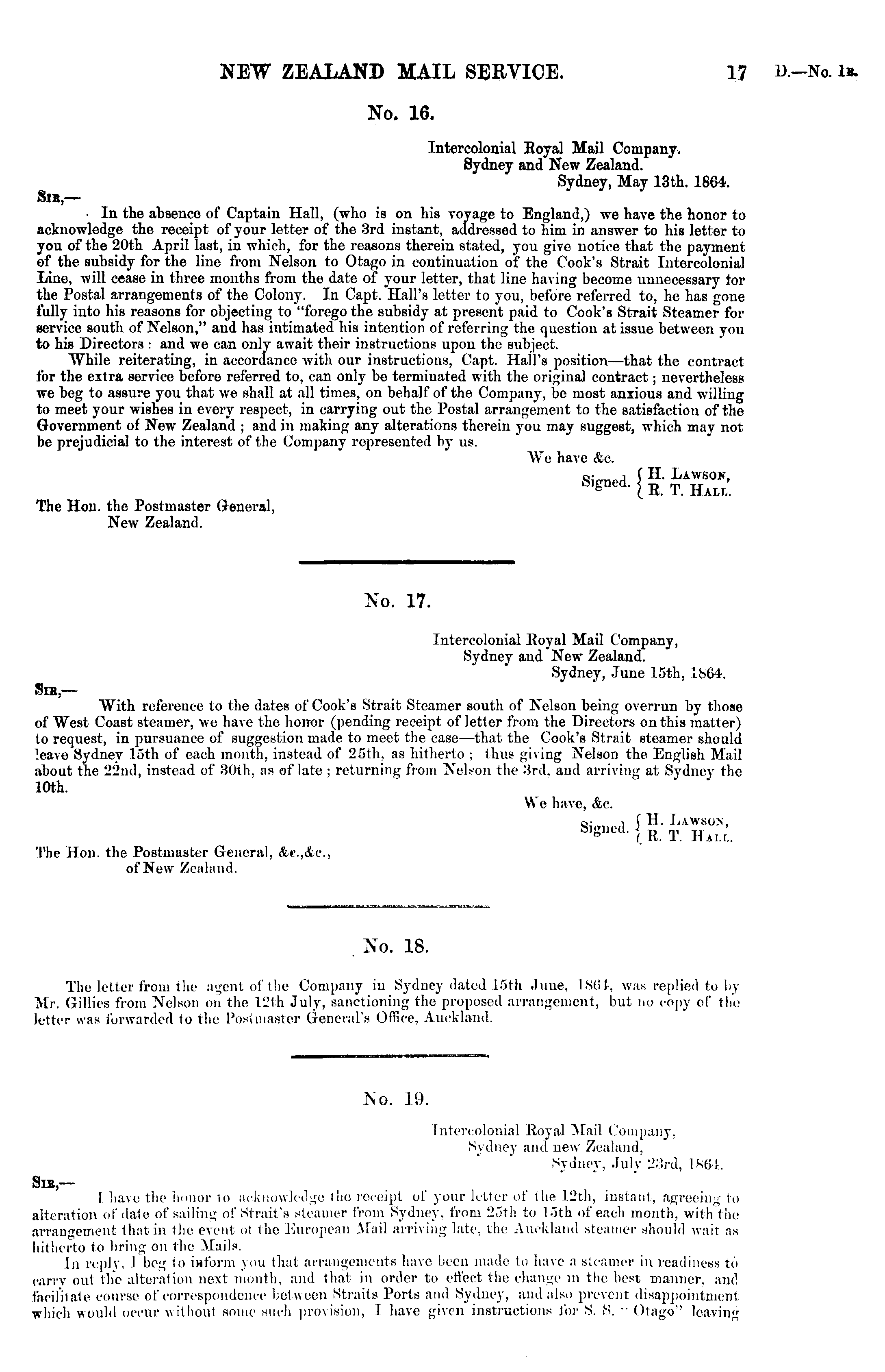 No. 16. Intercolonial Eoyal Mail Company. Sydney and New Zealand. Sydney, May 13th. 1864. Sib,— •In the absence of Captain Hall, (who is on his voyage to England,) we have the honor to acknowledge the receipt of your letter of the 3rd instant, addressed to him in answer to his letter to you of the 20th April last, in which, for the reasons therein stated, you give notice that the payment of the subsidy for the line from Nelson to Otago in continuation of the Cook's Strait Intercolonial Line, will cease in three months from the date of your letter, that line having become unnecessary tor the Postal arrangements of the Colony. In Capt. Hall's letter to you, before referred to, he has gone fully into his reasons for objecting to "forego the subsidy at present paid to Cook's Strait Steamer for service south of Nelson," and has intimated his intention of referring the question at issue between you to his Directors : and we can only await their instructions upon the subject. AVhile reiterating, in accordance with our instructions, Capt. Hall's position—that the contract for the extra service before referred to, can only be terminated with the original contract ; nevertheless we beg to assure you that we shall at all times, on behalf of the Company, be most anxious and willing to meet your wishes in every respect, in carrying out the Postal arrangement to the satisfaction of the Government of New Zealand ; and in making any alterations therein 3 rou may suggest, which may not be prejudicial to the interest of the Company represented by us. AYe have Ac. rj- , (H. Lawson. S.gned.j B T HALr ; The Hon. the Postmaster General, New Zealand. No. 17. Intercolonial Eoyal Mail Company, Sydney and New Zealand. Sydney, June 15th, 1864. Sir,— AVith reference to the dates of Cook's Strait Steamer south of Nelson being overrun by those of West Coast steamer, we have the honor (pending receipt of letter from the Directors on this matter) to request, in pursuance of suggestion made to meet the case —that the Cook's Strait steamer should leave Sydney 15th of each month, instead of 25th, as hitherto : thus giving Nelson the English Mail about the 22nd, instead of 30th. as of late ; returning from Nelson the 3rd, and arriving at Sydney the 10th. We have, Ac. c . , C H. Lawson. Signed. | R T Hai ' The Hon. the Postmaster General, At-.,Ac, of New Zealand. . No. 18. The letter from the agent of the Company in Sydney dated 15th June, lSI.il-, was replied to by Mr. (lillies from Nelson on the 12th July, sanctioning the proposed arrangement, but no copy of the letter was forwarded to the Postmaster General's Office, Auckland. No. 19. Intercolonial Royal Mail Company, Sydney and new Zealand, Sydney, July 23rd, 1864. Sir,— I have the honor lo acknowledge the receipt of your letter of the 12th, instant, agreeing to alteration of date of sailing of Strait's steamer from Sydney, from 25th to 15th of each month, with the arrangement that in the event ol the European Mail arriving late, the Auckland steamer should wait as hitherto to bring on the .Mails. In reply, 1 beg to inform you that arrangements have been made to have a steamer in readiness to carry out the alteration next month, and that in order to effect the change in the best manner, and facilitate course of correspondence between Straits Ports and Sydney, and also prevent disappointment which would occur without some such provision, 1 have given instructions for S. S. " Otago" leaving