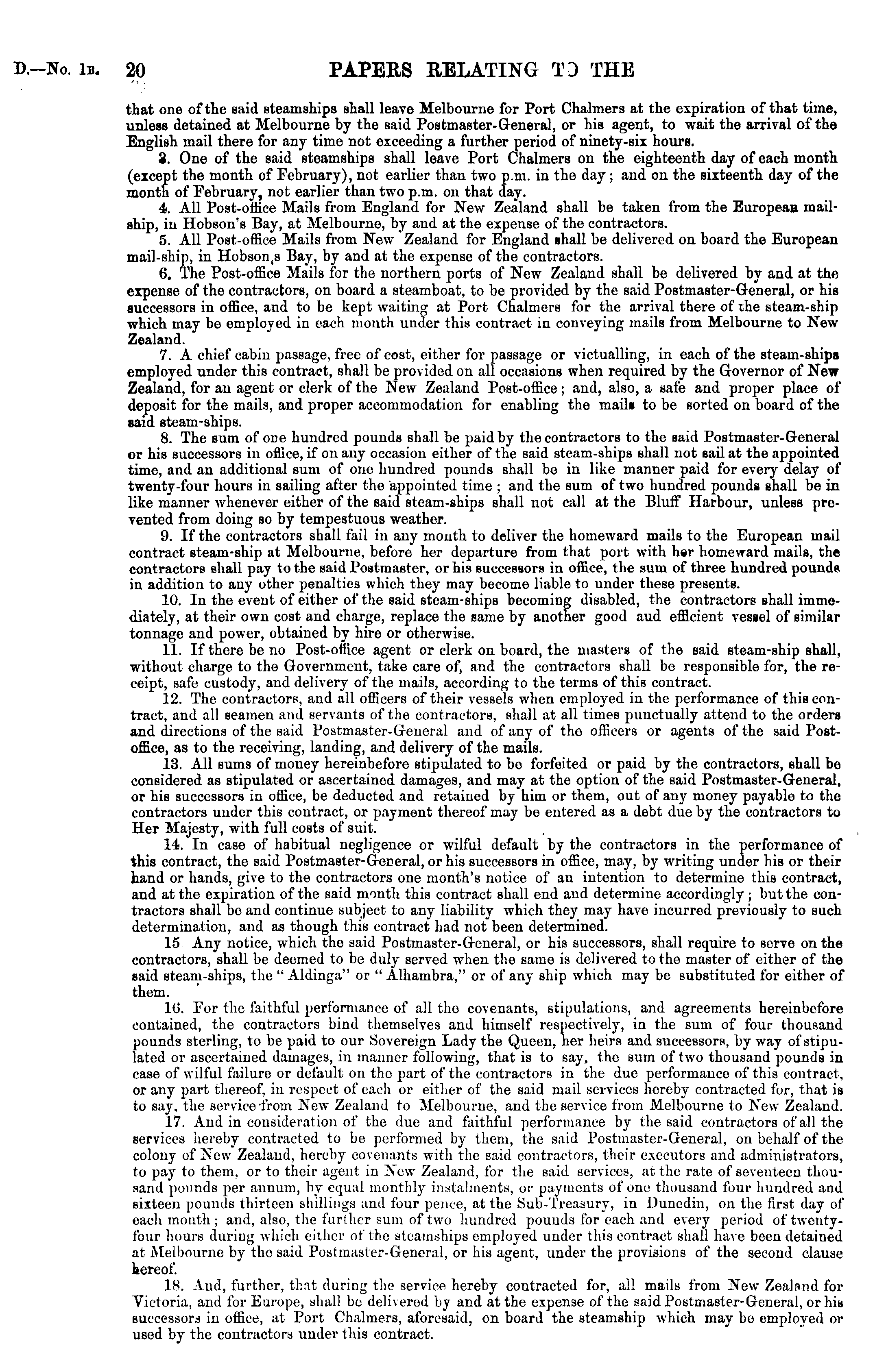 that one of the said steamships shall leave Melbourne for Port Chalmers at the expiration of that time, unless detained at Melbourne by the said Postmaster-General, or his agent, to wait the arrival of the English mail there for any time not exceeding a further period of ninety-six hours. 3. One of the said steamships shall leave Port Chalmers on the eighteenth day of each month (except the month of February), not earlier than two p.m. in the day ; and on the sixteenth day of the month of February, not earlier than two p.m. on that day. 4. All Post-office Mails from England for New Zealand shall be taken from the European mailship, in Hobson's Bay, at Melbourne, by and at the expense of the contractors. 5. All Post-office Mails from New Zealand for England shall be delivered on board the European mail-ship, in Hobson.s Bay, by and at the expense of the contractors. 6. The Post-office Mails for the northern ports of New Zealand shall be delivered by and at the expense of the contractors, on board a steamboat, to be provided by the said Postmaster-General, or his successors in office, and to be kept waiting at Port Chalmers for the arrival there of the steam-ship which may be employed in each month under this contract in conveying mails from Melbourne to New Zealand. 7. A chief cabin passage, free of cost, either for passage or victualling, in each of the steam-ships employed under this contract, shall be provided on all occasions when required by the Governor of New Zealand, for an agent or clerk of the New Zealand Post-office; and, also, a safe and proper place of deposit for the mails, and proper accommodation for enabling the mails to be sorted on board of the said steam-ships. 8. The sum of one hundred pounds shall be paid by the contractors to the said Postmaster-General or his successors in office, if on any occasion either of the said steam-ships shall not sail at the appointed time, and an additional sum of one hundred pounds shall be in like manner paid for every delay of twenty-four hours in sailing after the appointed time ; and the sum of two hundred pounds shall be in bike manner whenever either of the said steam-ships shall not call at the Bluff Harbour, unless prevented from doing so by tempestuous weather. 9. If the contractors shall fail in any mouth to deliver the homeward mails to the European mail contract steam-ship at Melbourne, before her departure from that port with her homeward mails, the contractors shall pay to the said Postmaster, or his successors in office, the sum of three hundred pounds in addition to any other penalties which they may become liable to under these presents. 10. In the event of either of the said steam-ships becoming disabled, the contractors shall immediately, at their own cost and charge, replace the same by another good aud efficient vessel of similar tonnage and power, obtained by hire or otherwise. 11. If there be no Post-office agent or clerk on board, the masters of the said steam-ship shall, without charge to the Government, take care of, and the contractors shall be responsible for, the receipt, safe custody, and delivery of the mails, according to the terms of this contract. 12. The contractors, and all officers of their vessels when employed in the performance of this contract, and all seamen and servants of the contractors, shall at all times punctually attend to the orders and directions of the said Postmaster-General and of any of tho officers or agents of the said Postoffice, as to the receiving, landing, and delivery of the mails. 13. All sums of money hereinbefore stipulated to be forfeited or paid by the contractors, shall bo considered as stipulated or ascertained damages, and may at the option of the said Postmaster-General, or his successors in office, be deducted and retained by him or them, out of any money payable to the contractors under this contract, or payment thereof may be entered as a debt due by the contractors to Her Majesty, with full costs of suit. 14. In case of habitual negligence or wilful default by the contractors in the performance of this contract, the said Postmaster-General, or his successors in office, may, by writing under his or their hand or hands, give to the contractors one month's notice of an intention to determine this contract, and at the expiration of the said month this contract shall end and determine accordingly ; but the contractors shall be and continue subject to any liability which they may have incurred previously to such determination, and as though this contract had not been determined. 15 Any notice, which the said Postmaster-General, or his successors, shall require to serve on the contractors, shall be deemed to be duly served when the same is delivered to the master of either of the said steam-ships, the " Aldinga" or " Alhambra," or of any ship which may be substituted for either of them. 16. For the faithful performance of all the covenants, stipulations, and agreements hereinbefore contained, the contractors bind themselves and himself respectively, in the sum of four thousand pounds sterling, to be paid to our Sovereign Lady the Queen, her heirs and successors, by way of stipulated or ascertained damages, in manner following, that is to say, the sum of two thousand pounds in case of wilful failure or default on tho part of the contractors in the due performance of this contract, or any part thereof, in respect of each or either of the said mail services hereby contracted for, that is to say, the service from New Zealand to Melbourne, and the service from Melbourne to New Zealand. 17. And in consideration of the due and faithful performance by the said contractors of all the services hereby contracted to be performed by them, the said Postmaster-General, on behalf of the colony of New Zealand, hereby covenants with the said contractors, their executors and administrators, to pay to them, or to their agent in New Zealand, for the said services, at the rate of seventeen t