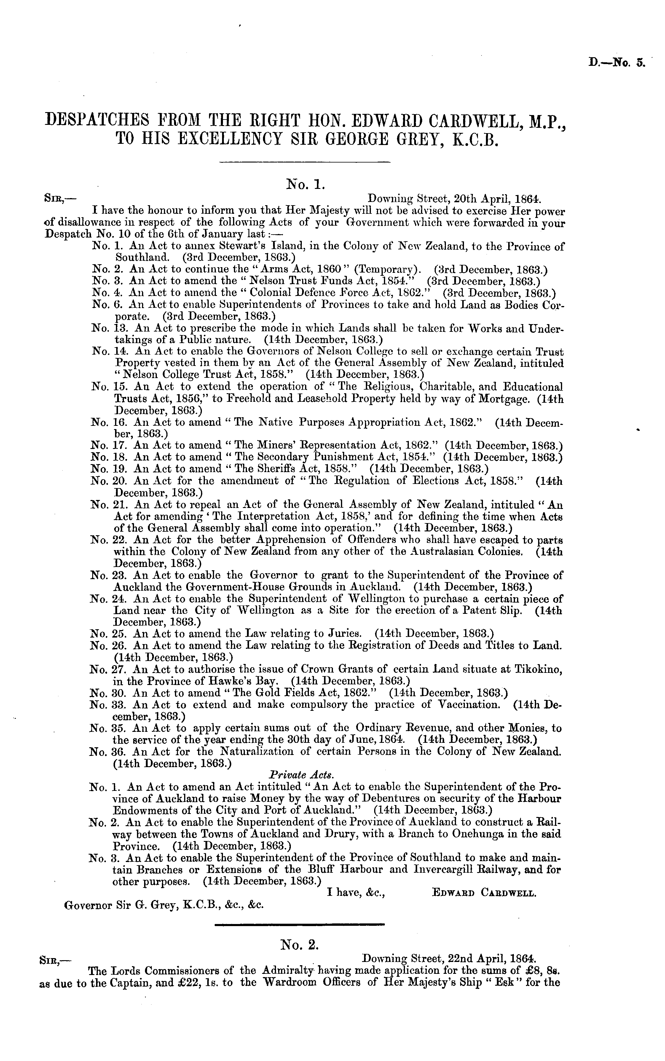 No. 1. Sic,— Downing Street, 20th April, 1864. I have the honour to inform you that Her Majesty will not be advised to exercise Her power of disallowance in respect of the following Acts of your Government which were forwarded in your Despatch No. 10 of the 6th of January last: — No. 1. An Act to annex Stewart's Island, in the Colony of New Zealand, to the Province of Southland. (3rd December, 1863.) No. 2. An Act to continue the "Arms Act, 1860" (Temporary). (3rd December, 1863.) No. 3. An Act to amend the " Nelson Trust Funds Act, 185-jJ" (3rd December, 1863.) No. 4. An Act to amend the " Colonial Defence Force Act, 1862." (3rd December, 1863.) No. 6. An Act to enable Superintendents of Provinces to take and hold Land as Bodies Corporate. (3rd December, 1863.) No. 13. An Act to prescribe the mode in which Lands shall be taken for Works and Undertakings of a Public nature. (14th December, 1863.) No. 14. An Act to enable the Governors of Nelson College to sell or exchange certain Trust Property vested in them by an Act of the General Assembly of New Zealand, intituled " Nelson College Trust Act, 1858." (14th December, 1863.) No. 15. An Act to extend the operation of " The Eeligious, Charitable, and Educational Trusts Act, 1856," to Freehold and Leasehold Property held by way of Mortgage. (14th December, 1863.) No. 16. An Act to amend " The Native Purposes Appropriation Act, 1862." (14th December, 1863.) No. 17. An Act to amend " The Miners' Eepresentation Act, 1862." (14th December, 1863.) No. 18. An Act to amend " The Secondary Punishment Act, 1854." (14th December, 1863.) No. 19. An Act to amend " The Sheriffs Act, 1858." (14th December, 1563.) No. 20. An Act for the amendment of " The Regulation of Elections Act, 1858." (14th December, 1863.) No. 21. An Act to repeal an Act of the General Assembly of New Zealand, intituled " An Act for amending ' The Interpretation Act, 1858,' and for defining the time when Acts of the General Assembly shall come into operation." (14th December, 1863.) No. 22. An Act for the better Apprehension of Offenders who shall have escaped to parts within the Colony of New Zealand from any other of the Australasian Colonies. (14th December, 1863.) No. 23. An Act to enable the Governor to grant to the Superintendent of the Province of Auckland the Government-House Grounds in Auckland. (14th December, 1863.) No. 24. An Act to enable the Superintendent of Wellington to purchase a certain piece of Land near the City of Wellington as a Site for the erection of a Patent Slip. (14th December, 1863.) No. 25. An Act to amend the Law relating to Juries. (14th December, 1863.) No. 26. An Act to amend the Law relating to the Registration of Deeds and Titles to Land. (14th December, 1863.) No. 27. An Act to authorise the issue of Crown Grants of certain Land situate at Tikokino, in the Province of Hawke's Bay. (14th December, 1863.) No. 30. An Act to amend " The Gold Fields Act, 1862." (14th December, 1863.) No. 33. An Act to extend and make compulsory the practice of Vaccination. (14th December, 1863.) No. 35. An Act to apply certain sums out of the Ordinary Revenue, and other Monies, to the service of the year ending the 30th day of June, 1864. (14th December, 1863.) No. 36. An Act for the Naturalization of certain Persons in the Colony of New Zealand. (14th December, 1863.) Private Acts. No. 1. An Act to amend an Act intituled "An Act to enable the Superintendent of the Province of Auckland to raise Money by the way of Debentures on security of the Harbour Endowments of the City and Port of Auckland." (14th December, 1863.) No. 2. An Act to enable the Superintendent of the Province of Auckland to construct a Railway between the Towns of Auckland and Drury, with a Branch to Onehunga in the said Province. (14th December, 1863.) No. 3. An Act to enable the Superintendent of the Province of Southland to make and maintain Branches or Extensions of the Bluff Harbour and Invercargill Railway, and for other purposes. (14th December, 1863.) I have, Ac., Edwahd Cabdwell. Governor Sir G. Grey, X.C.8., Ac., &c. No. 2. Sic,— . Downing Street, 22nd April, 1864. The Lords Commissioners of the Admiralty having made application for the sums of £8, Bs. as due to the Captain, and £22, Is. to the Wardroom Officers of Her Majesty's Ship " Esk " for the