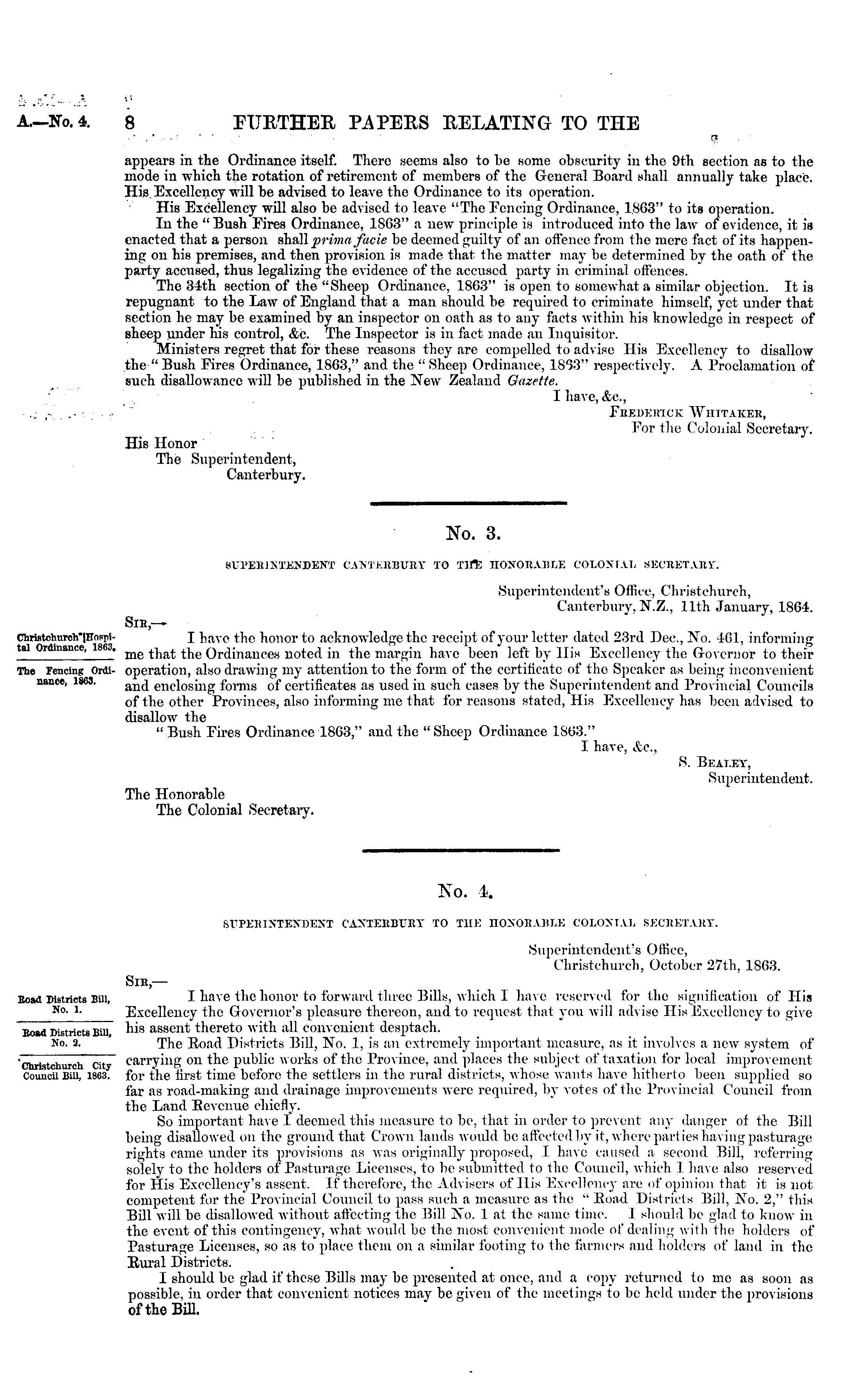 appears in the Ordinance itself. There seems also to be some obscurity in the 9th section as to the mode in which the rotation of retirement of members of the General Board shall annually take place. His Excellency will be advised to leave the Ordinance to its operation. His Excellency will also be advised to leave "The Fencing Ordinance, 1.863" to its operation. In the " Bush Fires Ordinance, 1563" a new principle is introduced into the law of evidence, it is enacted that a person shall prima facie be deemed guilty of an offence from the mere fact of its happening on his premises, and then provision is made that the matter may be determined by the oath of the party accused, thus legalizing the evidence of the accused party in criminal offences. The 34th section of the "Sheep Ordinance, 1863" is open to somewhat a similar objection. It is repugnant to the Law of England that a man should be required to criminate himself, yet under that section he may be examined by an inspector on oath as to any facts within his knowledge in respect of sheep under his control, &c. The Inspector is in fact made an Inquisitor. Ministers regret that for these reasons they are compelled to advise His Excellency to disallow the " Bush Fires Ordinance, 1863," and the " Sheep Ordinance, 1833" respectively. A Proclamation of such disallowance will be published in the New Zealand Gazette. I have, &c., FREDERICK WIITTAKER, For the Colonial Secretary. His Honor The Superintendent, Canterbury. No. 3. SUPEIUjSXKNDENT CANTERBURY TO TlfE HONORABLE COLONIAL SECBETABT. Superintendent's Office, Christchurch, Canterbury. N.Z., 11th January, 18G4. Sir,— I have the honor to acknowledge the receipt of your letter dated 23rd Dec, No. 4GI, informing me that the Ordinances noted in the margin have been left by His Excellency the G-ovcrnor to their operation, also drawing my attention to the form of the certificate of the Speaker as being inconvenient and enclosing forms of certificates as used in such eases by the Superintendent and Provincial Councils of the other Provinces, also informing me that for reasons stated, His Excellency has been advised to disallow the " Bush Fires Ordinance 1863," and the " Sheep Ordinance 1863." I have, &c, S. Beai.ey, Superintendent. The Honorable The Colonial Secretary. No. k SUPBBrNTKNDEKT CANTERBURY TO TIIE HONORABLE COLONIAL SECRETARY. Superintendent's Office, Christchurch, October 27th, 1863. Sir — I have the honor to forward three Bills, which I have reserved for the signification of His Excellency the Governor's pleasure thereon, and to request that you will advise His Excellency to give his assent thereto with all convenient desptach. The Eoad Districts Bill, No. 1, is an extremely important measure, as it involves a new system of carrying on the public works of the Province, and places the subject of taxation for local improvement for the first time before the settlers hi the rural districts, whose wants have hitherto been supplied so far as road-making and drainage improvements were required, by votes of the Provincial Council from the Land Eevcnue chiefly. So important have I deemed this measure to be, that in order to prevent any danger of the Bill being disallowed on the ground that Crown lands would be affected by it, where parties having pasturage rights came under its provisions as was originally proposed, I have caused a second Bill, referring solely to the holders of Pasturage Licenses, to be submitted to the Council, which I have also reserved for His Excellency's assent. If therefore, the Advisers of His Excellency are of opinion that it is not competent for the Provincial Council to pass such a measure as the " Eoad Districts Bill, No. 2," this Bill will be disallowed without affecting the Bill No. lat the same time. I should be glad to know in the event of this contingency, what would be the most convenient mode of dealing with the holders of Pasturage Licenses, so as to place them on a similar footing to the farmers and holders of land in the Rural Districts. I should be glad if these Bills may be presented at once, and a copy returned to me as soon as possible, in order that convenient notices may be given of the meetings to be held under the provisions of the Bill.