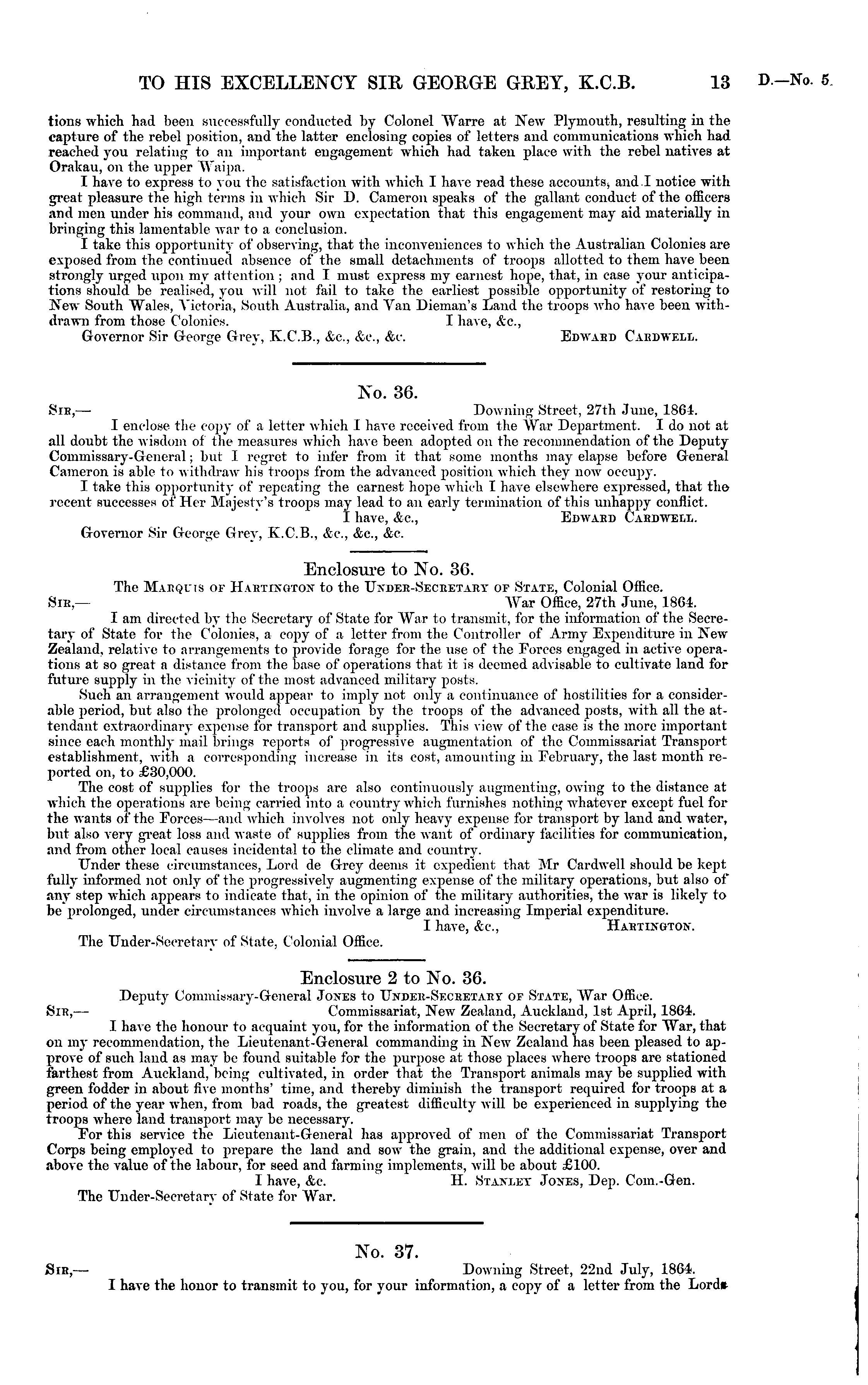 tions which had been successfully conducted by Colonel Warre at New Plymouth, resulting in the capture of the rebel position, and the latter enclosing copies of letters and communications which had reached you relating to an important engagement which had taken place with the rebel natives at Orakau, on the upper Waipa. I have to express to you the satisfaction with which I have read these accounts, and.l notice with great pleasure the high terms in which Sir 1). Cameron speaks of the gallant conduct of the officers and men under his command, and your own expectation that this engagement may aid materially in bringing this lamentable war to a conclusion. I take this opportunity of observing, that the inconveniences to which the Australian Colonies are exposed from the continued absence of the small detachments of troops allotted to them have been strongly urged upon my attention ; and I must express my earnest hope, that, in case your anticipations should be realised, you will not fail to take the earliest possible opportunity of restoring to New South "Wales, Victoria, South Australia, and Van Dieman's Land the troops who have been withdrawn from those Colonies. I have, &c, Governor Sir George Grey, X.C.8., &c, &c, &i\ Edward Caedwell. No. 36. Sir,— Downing Street, 27th June, 1864. I enclose the copy of a letter which I have received from the War Department. Ido not at all doubt the wisdom of the measures which have been adopted on the recommendation of the Deputy Commissary-General; but I regret to infer from it that some months may elapse before General Cameron is able to withdraw his troops from the advanced position which they now occupy. I take this opportunity of repeating the earnest hope which I have elsewhere expressed, that the recent successes of Her Majesty's troops may lead to an early termination of this unhappy conflict. I have, <fee, Ebwahd Cabdwell. Governor Sir George Grey, X.C.8., &c, &c, &c. Enclosure to No. 36. The Marquis of Hartixgtojt to the Usder-Secretary of State, Colonial Office. Sib,— War Office, 27th June, 1864. I am directed by the Secretary of State for War to transmit, for the information of the Secretary of State for the Colonies, a copy of a letter from the Controller of Army Exjienditure in New Zealand, relative to arrangements to provide forage for the use of the Forces engaged in active ojierations at so great a distance from the base of operations that it is deemed advisable to cultivate land for future supply in the vicinity of the most advanced military posts. Such an arrangement would appear to imply not only a continuance of hostilities for a considerable period, but also the prolonged occupation by the troops of the advanced posts, with all the attendant extraordinary expense for transport and supplies. This view of the ease is the more important since each monthly mail brings reports of progressive augmentation of the Commissariat Transport establishment, with a corresponding increase in its cost, amounting in February, the last month reported on, to £30,000. The cost of supplies for the troops are also continuously augmenting, owing to the distance at which the operations are being carried into a country which furnishes nothing whatever except fuel for the wants of the Forces—and which involves not only heavy expense for transport by land and water, but also very great loss and waste of supplies from the want of ordinary facilities for communication, and from other local causes incidental to the climate and country. Under these circumstances, Lord de Grey deems it expedient that Mr Cardwell should be kej)t fully informed not only of the progressively augmenting expense of the military operations, but also of any step which appears to indicate that, in the opinion of the military authorities, the war is likely to be prolonged, under circumstances which involve a large and increasing Imperial expenditure. I have, &c, Hartington. The TJnder-Secretary of State, Colonial Office. Enclosure 2 to No. 36. Deputy Commissary-General JoifES to llndeh-Secretary of State, War Office. Sir, — Commissariat, New Zealand, Auckland, Ist April, 1864. I have the honour to acquaint you, for the information of the Secretary of State for War, that on my recommendation, the Lieutenant-General commanding in New Zealand has been pleased to approve of such land as may be found suitable for the purpose at those places where troops are stationed farthest from Auckland, being cultivated, in order that the Transport animals may be supplied with green fodder in about five months' time, and thereby diminish the transport required for troops at a period of the year when, from bad roads, the greatest difficulty will be experienced in supplying the troops where land transport may be necessary. For this service the Lieutenant-General has approved of men of the Commissariat Transport Corps being employed to prepare the land and sow the grain, and the additional expense, over and above the value of the labour, for seed and farming implements, will be about £100. I have, &c. H. Stanxey Joxes, Dep. Com.-Gen. The Under-Secretary of State for War. No. 37. Sir,— Downing Street, 22nd July, 1864. I have the honor to transmit to you, for your information, a copy of a letter from the Lord*