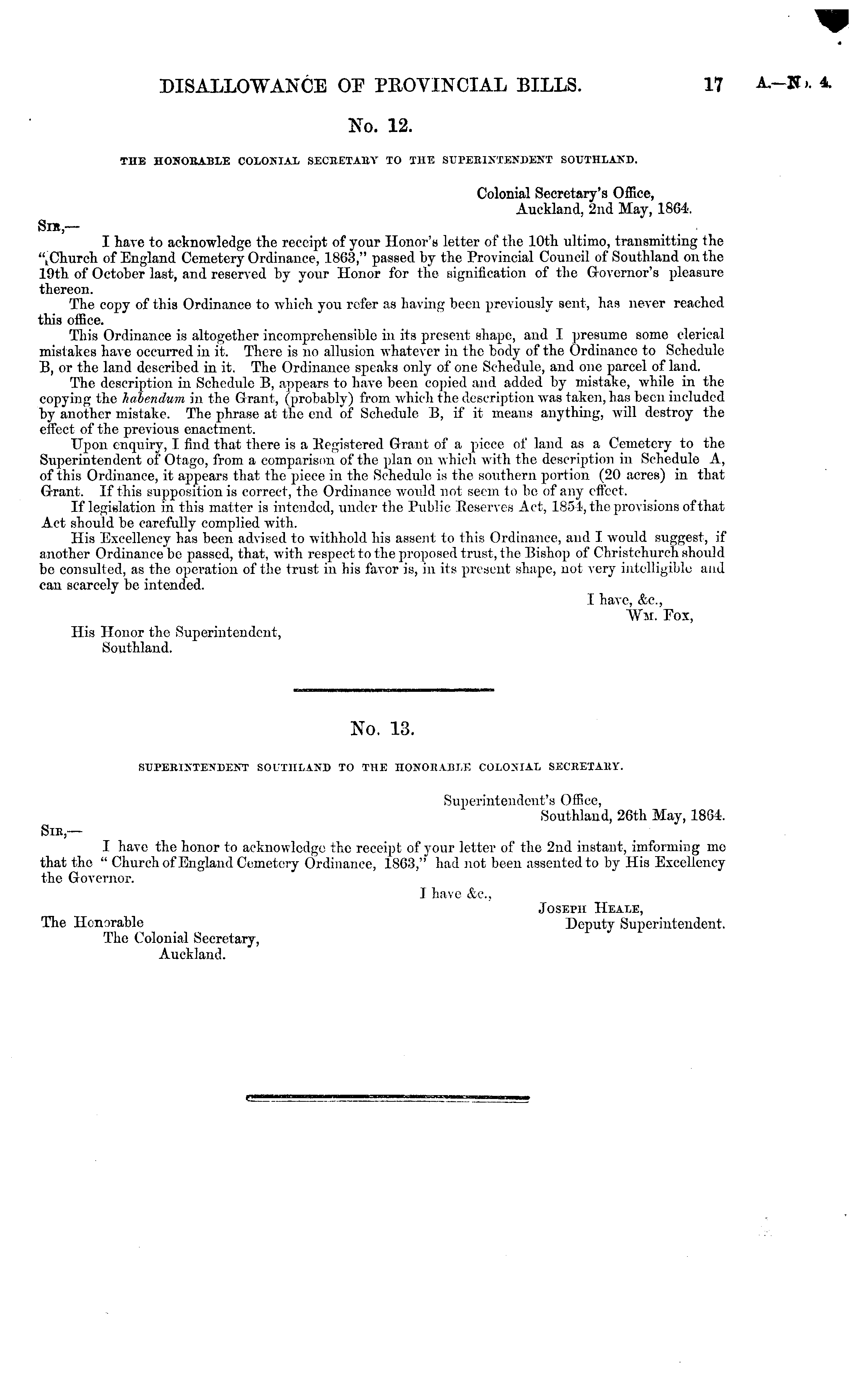 No. 12. THE HOKOEABLE COLONIAL SECEETAEY TO THE gOTEBHfTEHDENT SOUTnLAKD. Colonial Secretary's Office, Auckland, 2nd May, 1864. Sib,— I have to acknowledge the receipt of your Honor's letter of the 10th ultimo, transmitting the " k Church of England Cemetery Ordinance, 1863," passed by the Provincial Council of Southland on the 19th of October last, and reserved by your Honor for the signification of the Governor's pleasure thereon. The copy of this Ordinance to which you refer as having been previously sent, has never reached this office. This Ordinance is altogether incomprehensible in its present shape, and I presume some clerical mistakes have occurred in it. There is no allusion whatever in the body of the Ordinance to Schedule B, or the land described in it. The Ordinance speaks only of one Schedule, and one parcel of land. The description in Schedule B, appears to have been copied and added by mistake, while in the copying the liabendvm in the Grant, (probably) from which the description was taken, has been included by another mistake. The phrase at the end of Schedule B, if it means anything, will destroy the effect of the previous enactment. Upon enquiry, I find that there is a Registered Grant of a piece of land as a Cemetery to the Superintendent of Otago, from a comparison of the plan on which with the description in Schedule A, of this Ordinance, it appears that the piece in the Schedule is the southern portion (20 acres) in that Grant. If this supposition is correct, the Ordinance would not seem to be of any effect. If legislation in this matter is intended, under the Public Reserves Act, 1854, the provisions of that Act should be carefully complied with. His Excellency has been advised to withhold his assent to this Ordinance, and I would suggest, if another Ordinance be passed, that, with respect to the proposed trust, the Bishop of Christchurch should be consulted, as the operation of the trust in his favor is, in its present shape, not very intelligible and can scarcely be intended. I have, &C., Wm, Fox, His Honor the Superintendent, Southland. No. 13. SUPEBIXTENDENT SOUTHLAND TO THE HOITOIIABLE COLONIAL SECEETAIiIT. Superintendent's Office, Southland, 26th May, 18G4. SlE,— I have the honor to acknowledge the receipt of your letter of the 2nd instant, iinforming mo that the " Church of England Cemetery Ordinance, 1863," had not been assented to by His Excellency the Governor. I have &c, Joseph Heale, The Honorable Deputy Superintendent. The Colonial Secretary, Auckland.