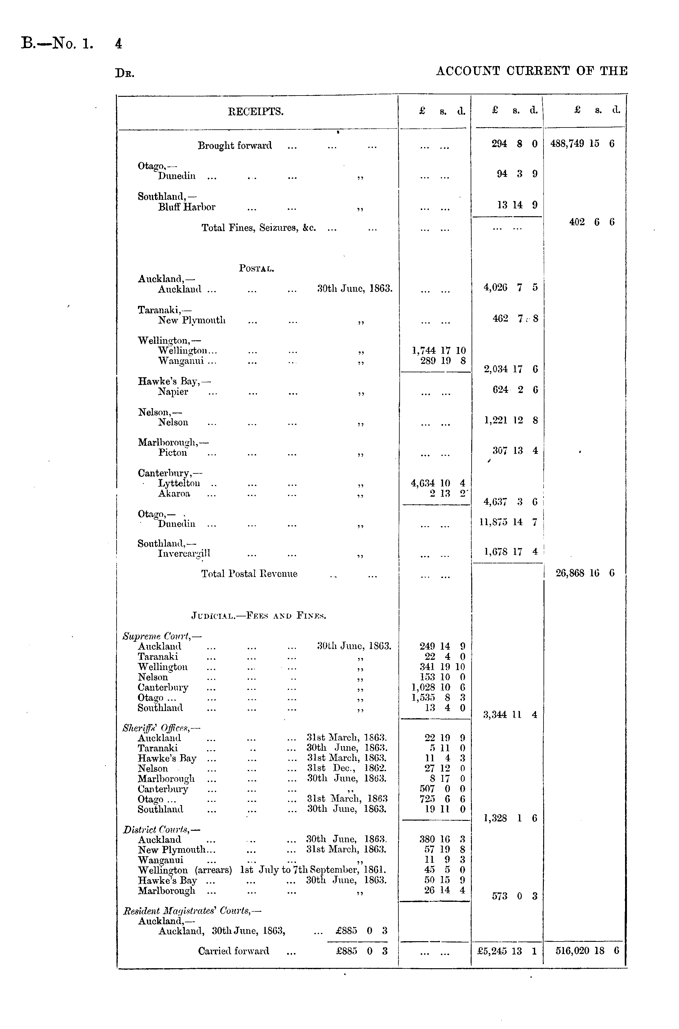 ACCOUNT CUKEENT 03? TH »R. RECEIPTS. £ s. d. £ s. d. £ s. d. —— — ' ■ , Brought forward Otago,— Dunedin ... ... ... ,, 294 8 0 94 3 9 488,749 15 6 Southland,— Bluff Harbor ... ... ,, 13 14 9 402 6 6 Total Fines, Seizures, &c. ... Postal. A ii ok I *i n el ■ Auckland 30th June, 1863. 4,026 7 5 Taranaki, — New Plymouth ... ... ,, 402 7.-8 Wellington, — Wellington... ... ... „ Wanganui ... ... ... ,, 1,744 17 10 289 19 8 2,034 17 6 Hawke's Bay,— Napier ... ... ... ,, 624 2 6 Nelson, — Nelson ... ... ... ,, 1,221 12 8 Marlborougl i, — Picton ... ... ... ,, 307 13 4 Canterbury,— Lyttelton .. ... ... ,, Akaroa ... ... ... ,, 4,034 10 4 2 13 2' / 4,637 3 G Otago,— . Dunedin ... ... ... ,, 11,875 14 7 Southland, — Invercargill ... ... ,, 1,678 17 4 Total Postal Revenue 26,868 16 0 Judicial. —Fees and Fines. Supreme Court, — Auckland 30lh June, 1863. Taranaki ... ... ... ,, Wellington ... ... I ... ,, Nelson ... ... -.. ,, Canterbury ... ... ... ,, Otago ... ... ... ... ,, Southland ... ... ... ,, 249 14 9 22 4 0 341 19 10 153 10 0 1,028 10 6 1,535 8 3 13 4 0 3,344 11 4 Sheriffs' Offices, — Auckland ... 31st March, 1863. Taranaki ... .. . ... 30th June, 1863. Hawke's Bay ... ... ... 31st March, 1863. Nelson 31st Dec, 1862. Marlborough ... ... ... 30th June, 1863. Canterbury ... ... ... ,, Otago ... ... ... ... 31st March, 1863 Southland ... ... ... 30th June, 1863. 22 19 9 5 11 0 11 4 3 27 12 0 8 17 0 507 0 0 725 6 6 19 11 0 1,328 1 6 District Courts, — Auckland ... ... ... 30th June, 1863. New Plymouth... ... ... 31st March, 1863. Wanganui ... ... ... ,, Wellington (arrears) 1st July to 7th September, 1861. Hawke's Bay ... ... ... 30th June, 1863. Marlborough ... ... ... ,, 380 10 3 57 19 8 11 9 3 45 5 0 50 15 9 26 14 4 573 0 3 Resident Magistrates' Courts, — A fi rk IrLT-fl ■ Auckland, 30thJune, 1863, ... £885 0 3 Carried forward ... £885 0 3 £5,245 13 1 516,020 18 6